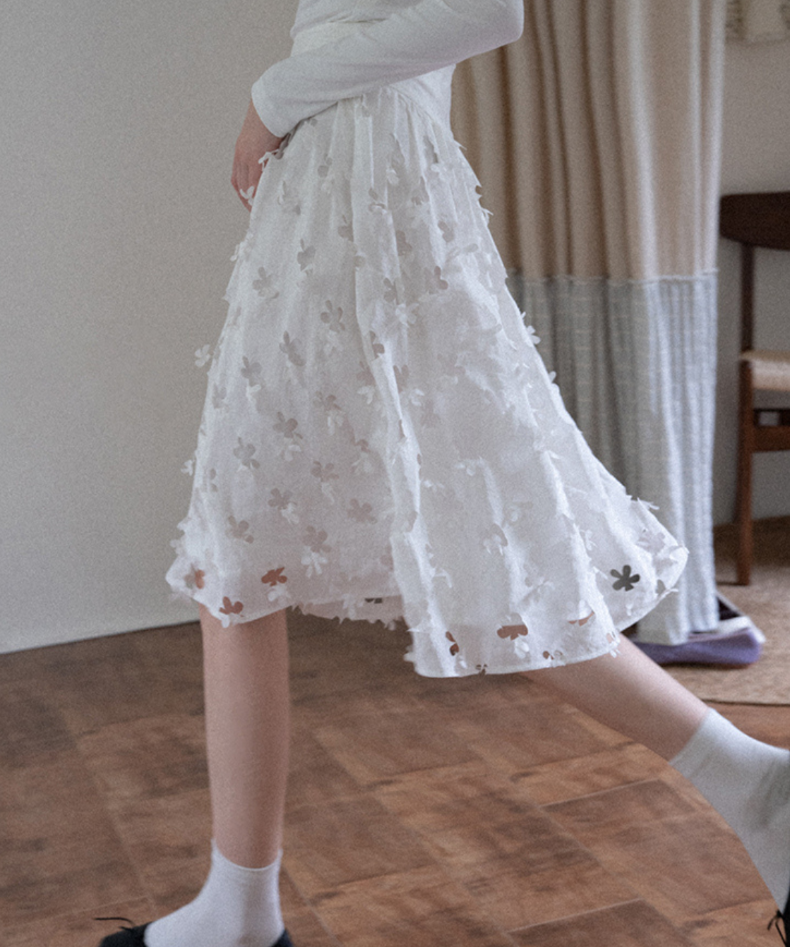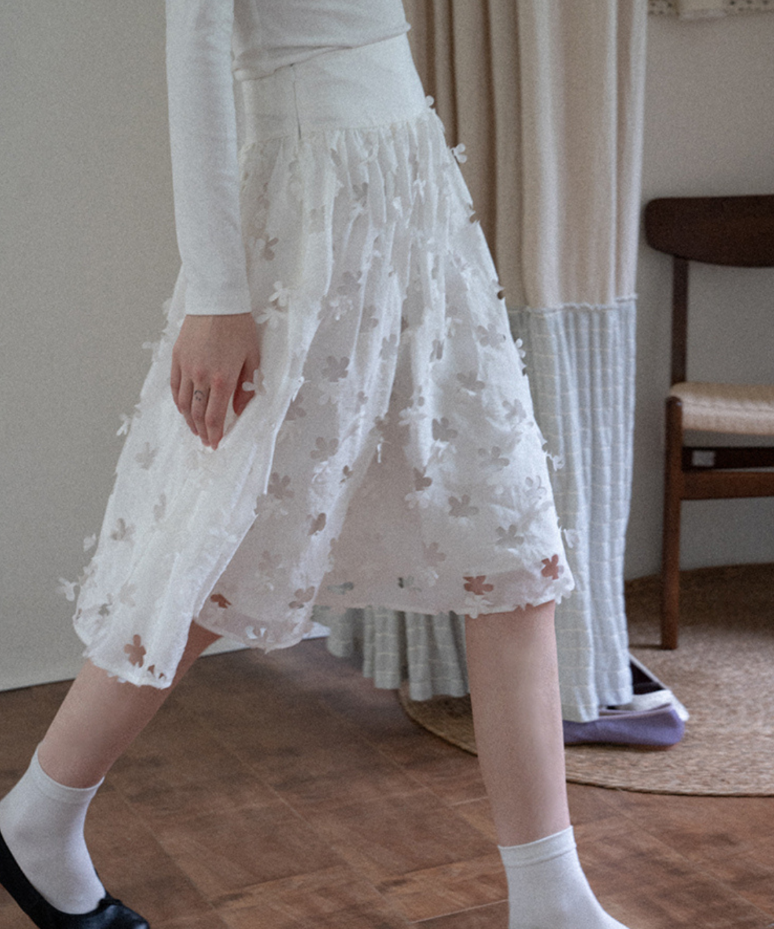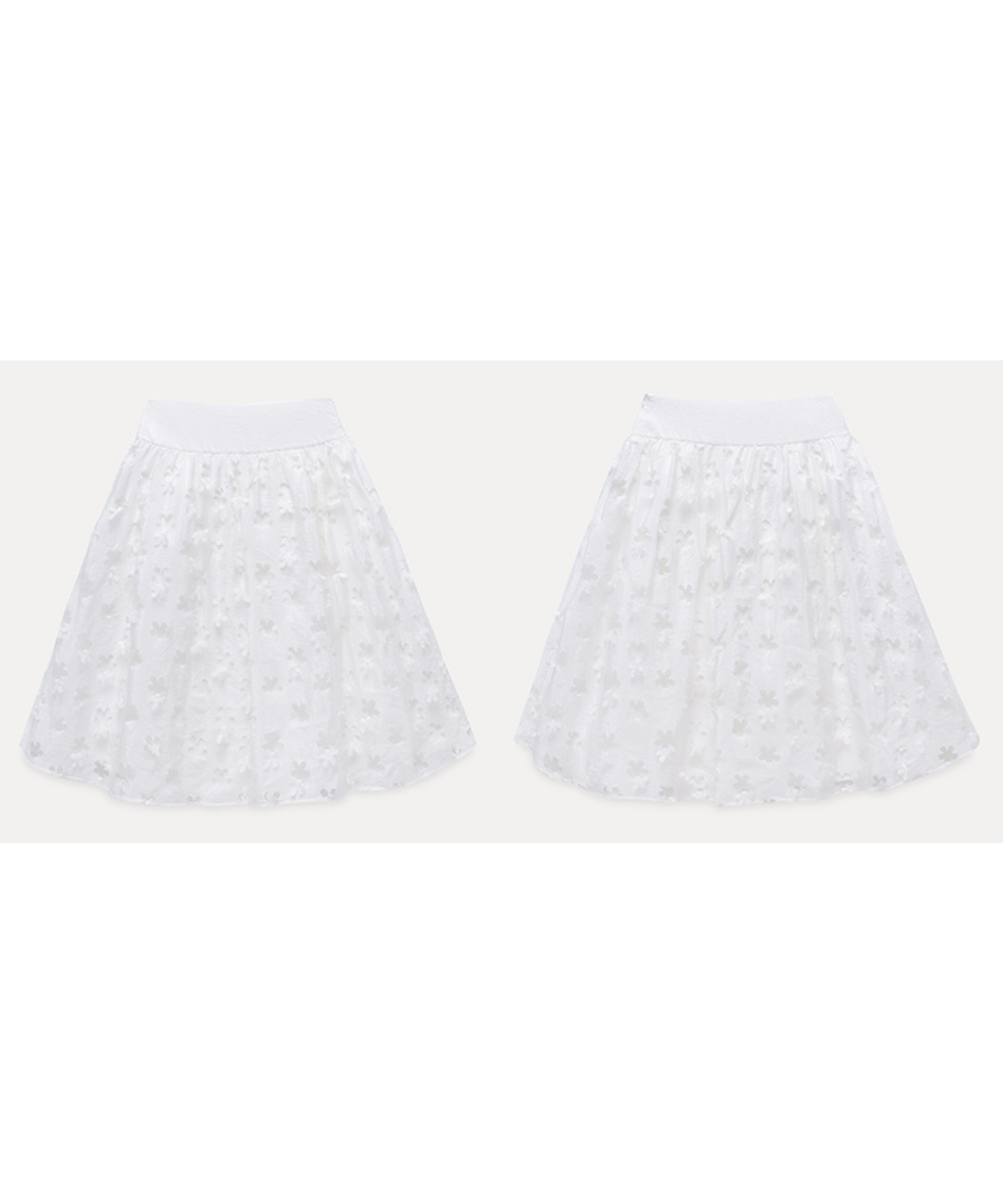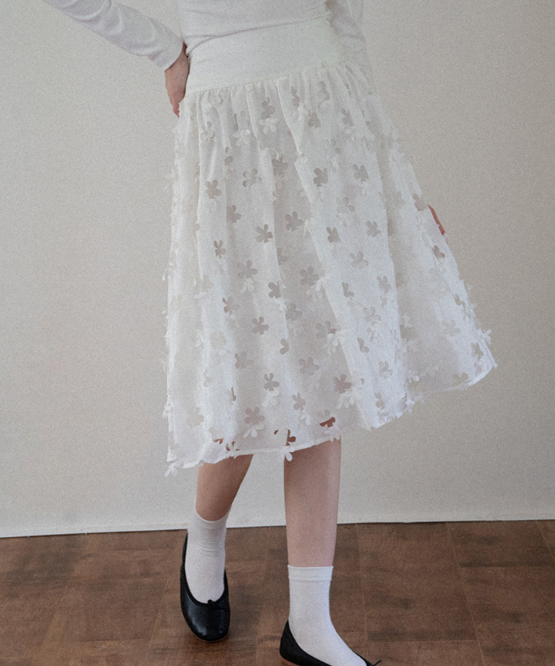 フラワーモチーフのカットワークが繊細で華やかな印象のスカートです。