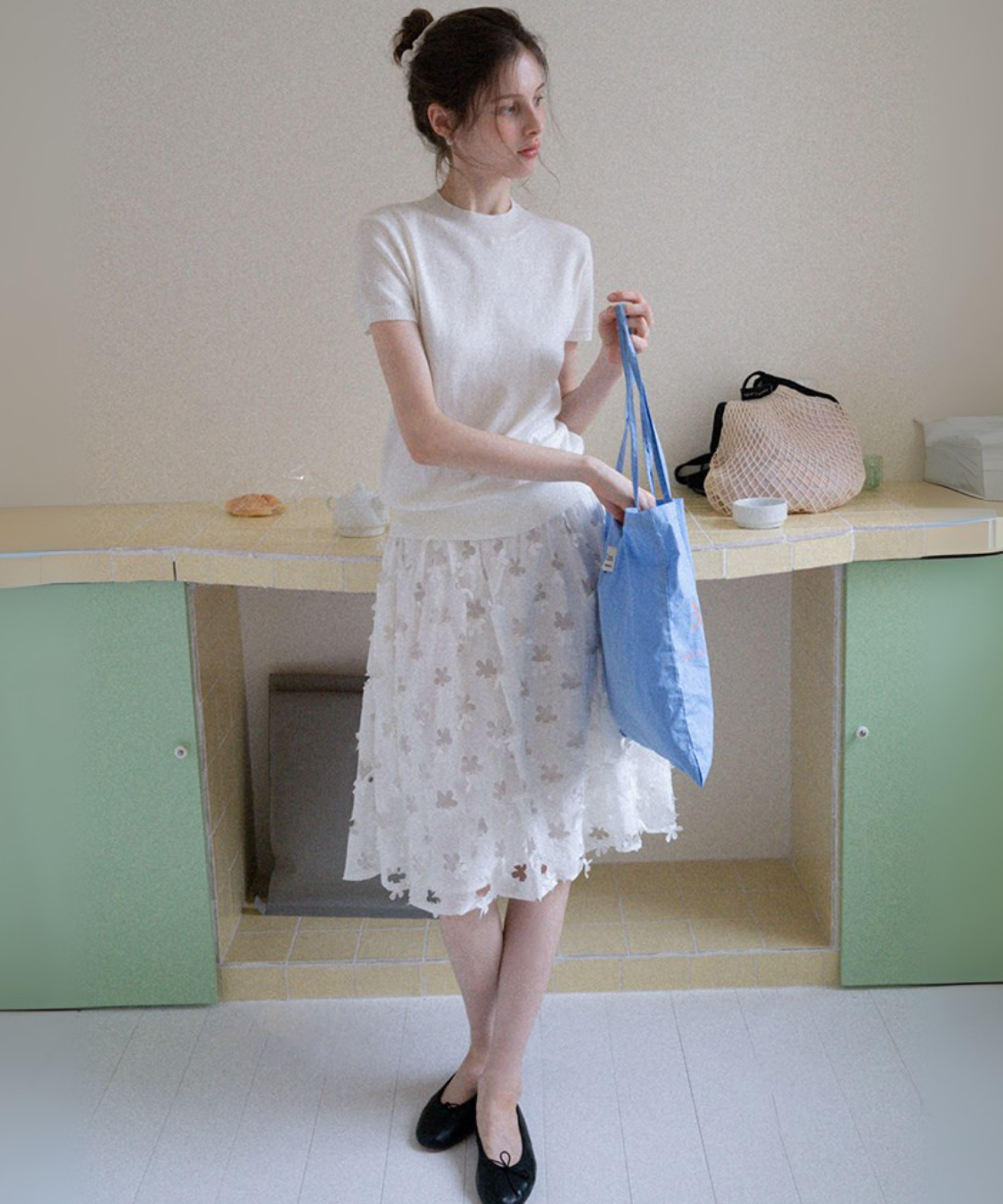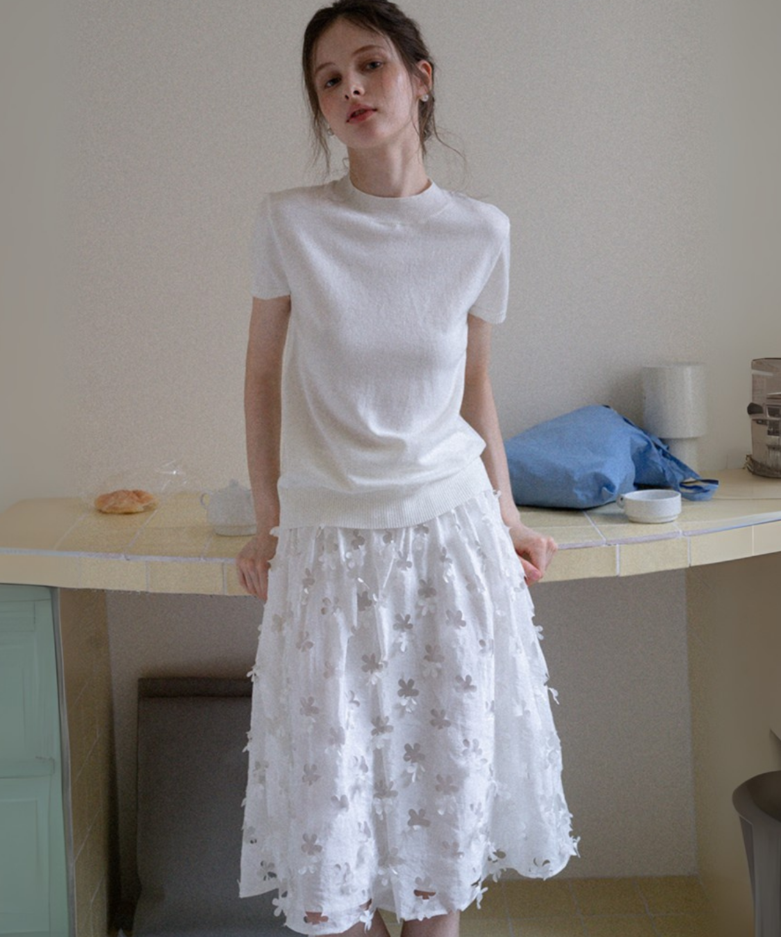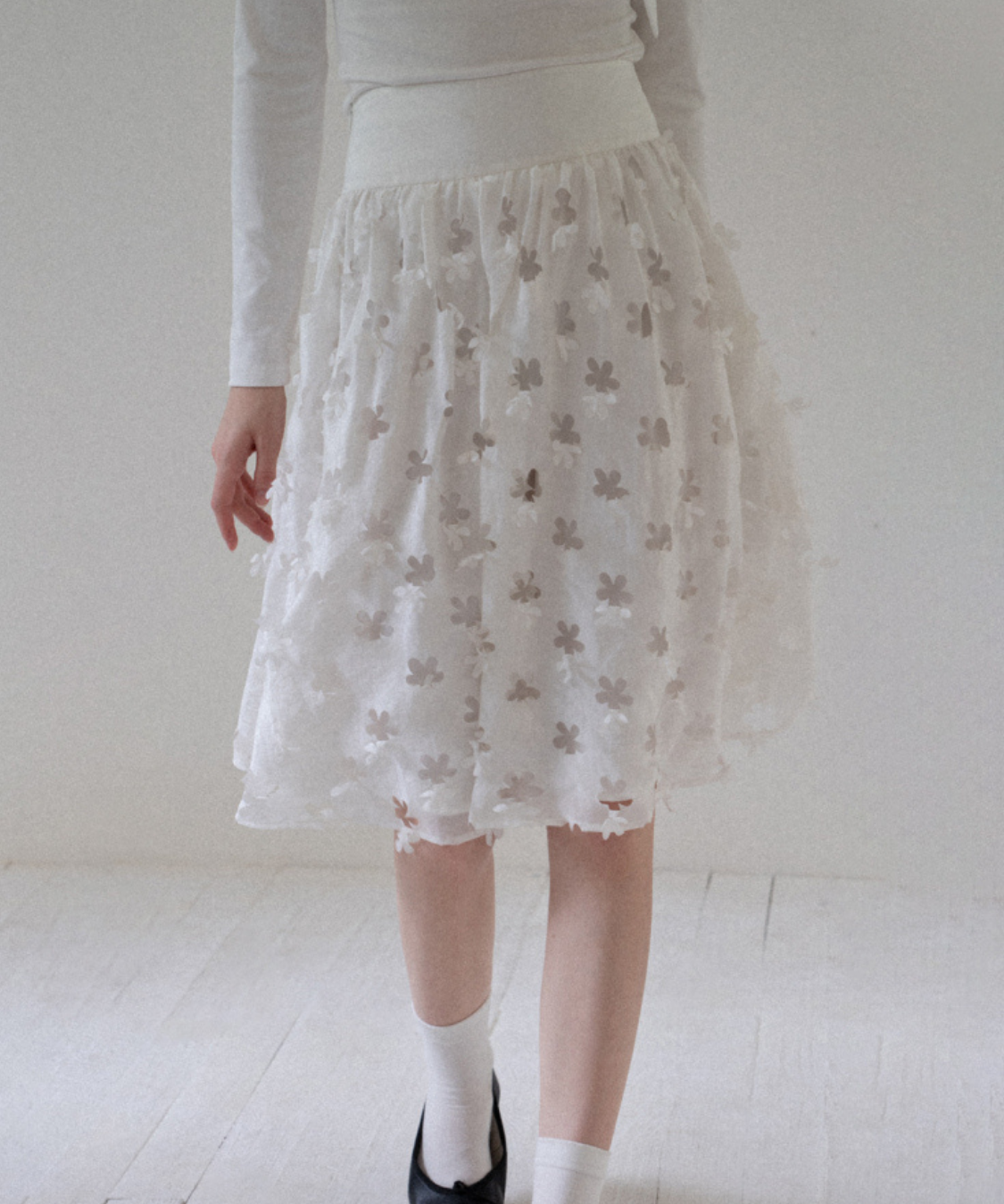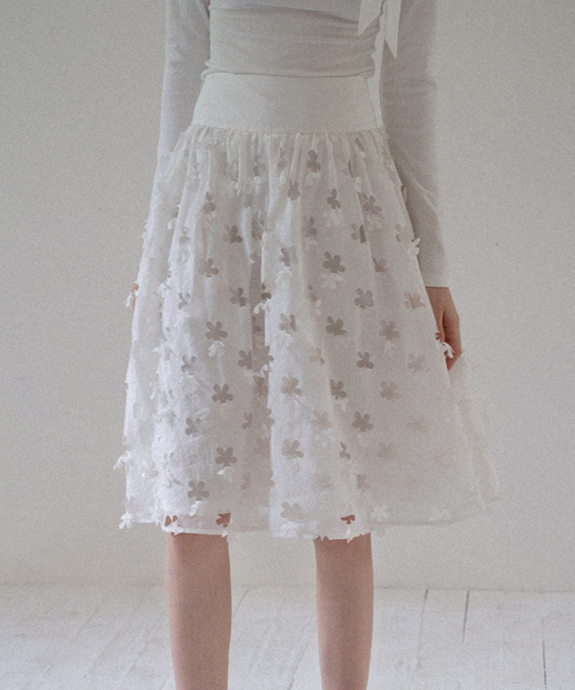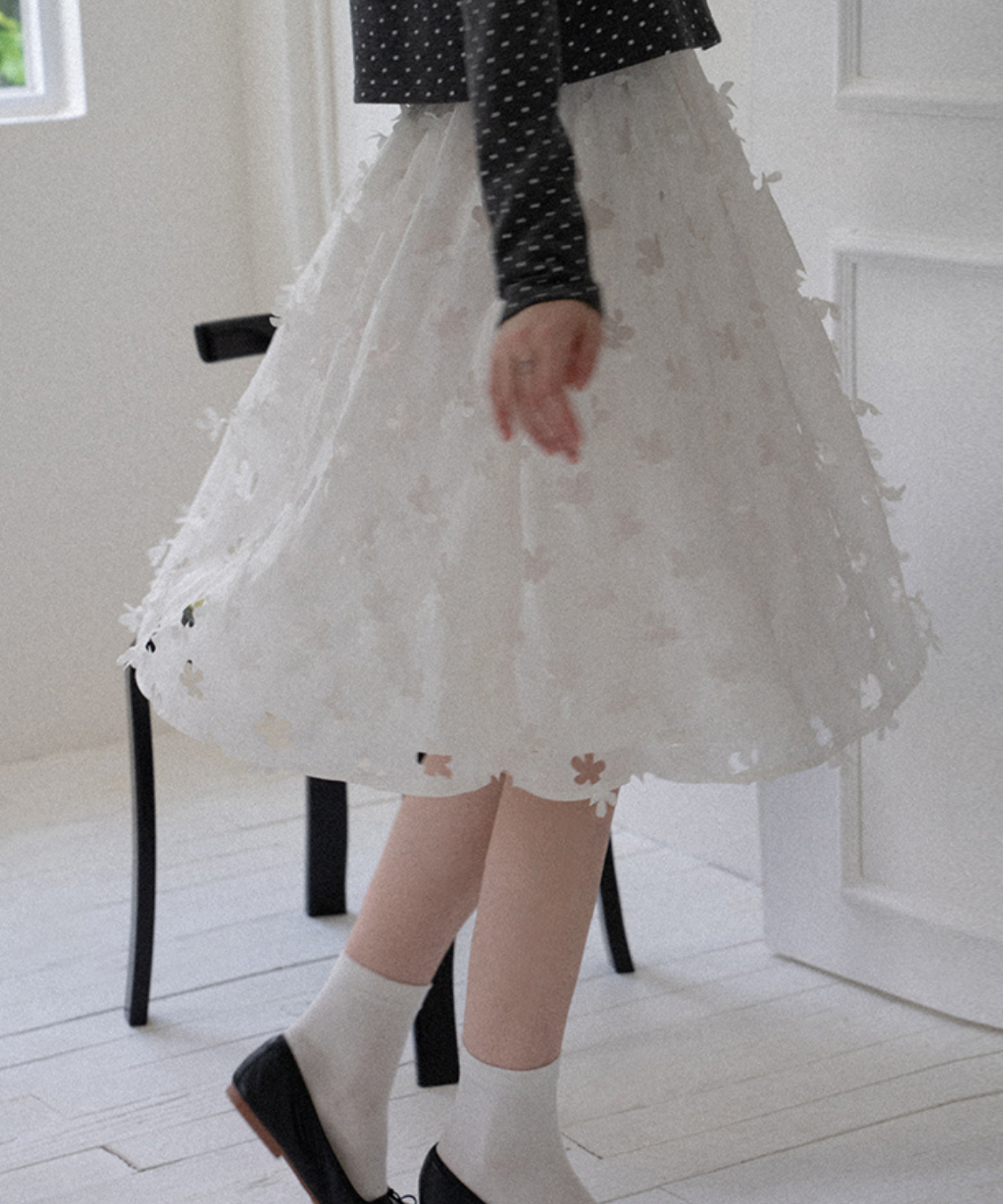 フラワーモチーフのカットワークが繊細で華やかな印象のスカートです。