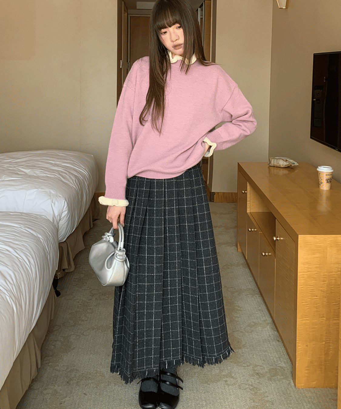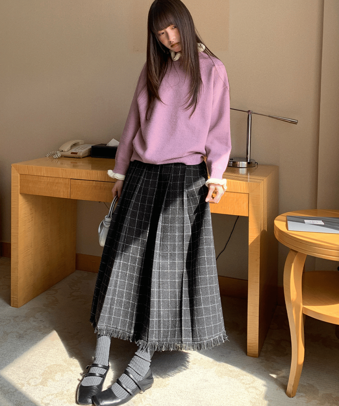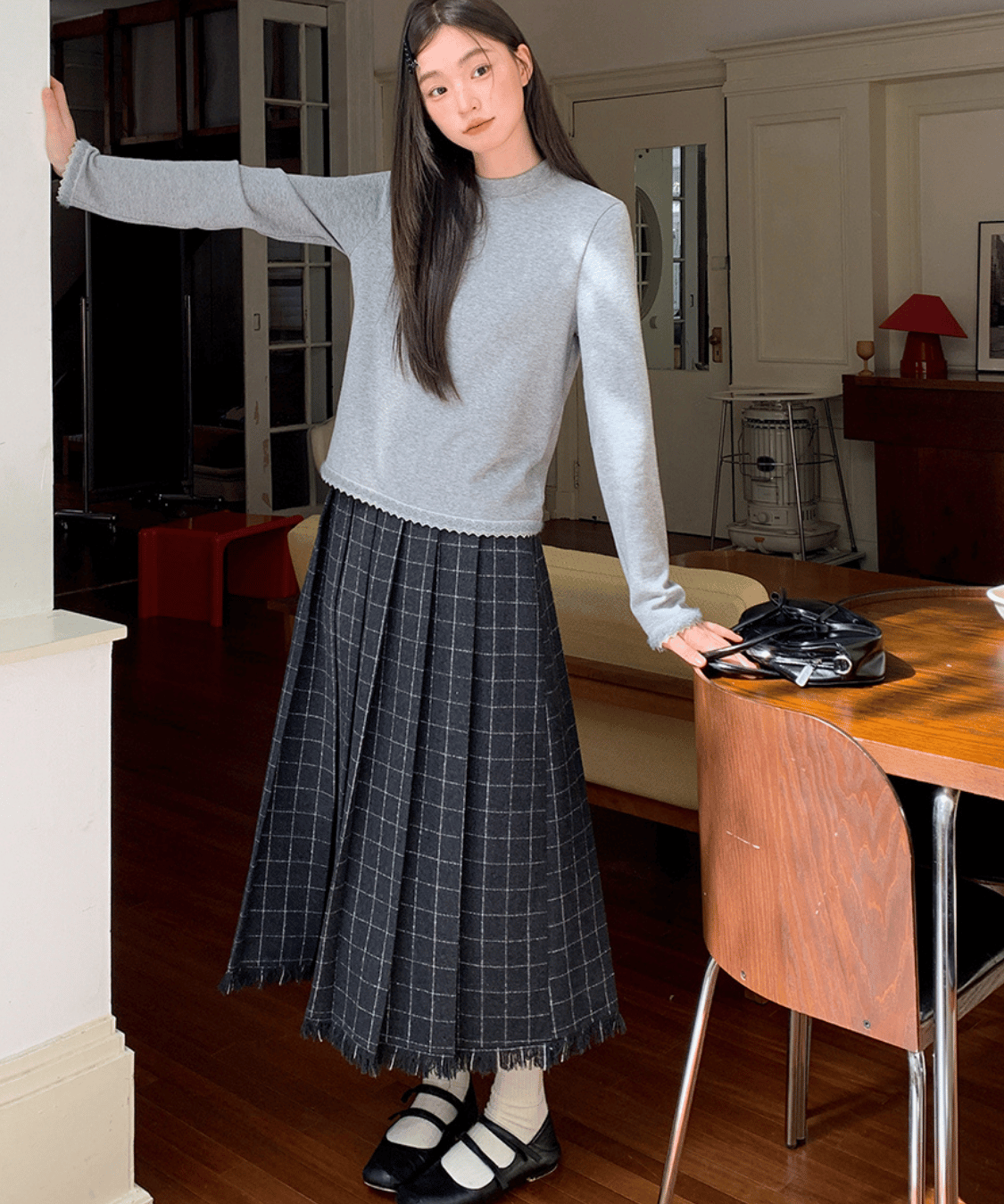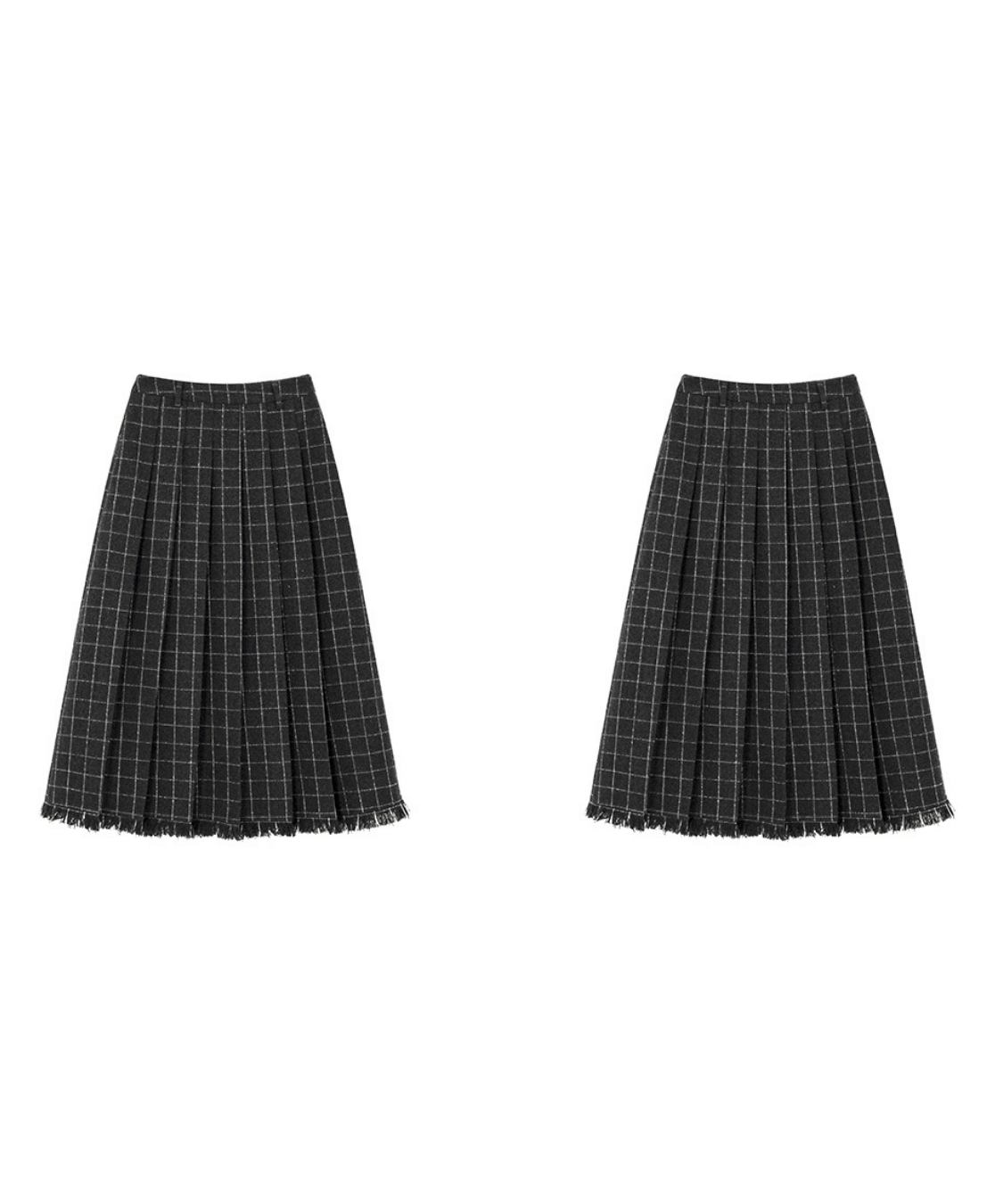 ウール調チェック柄裾フリンジプリーツスカート