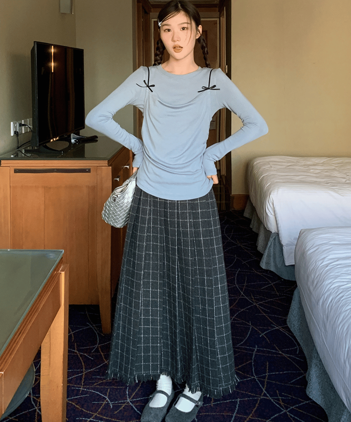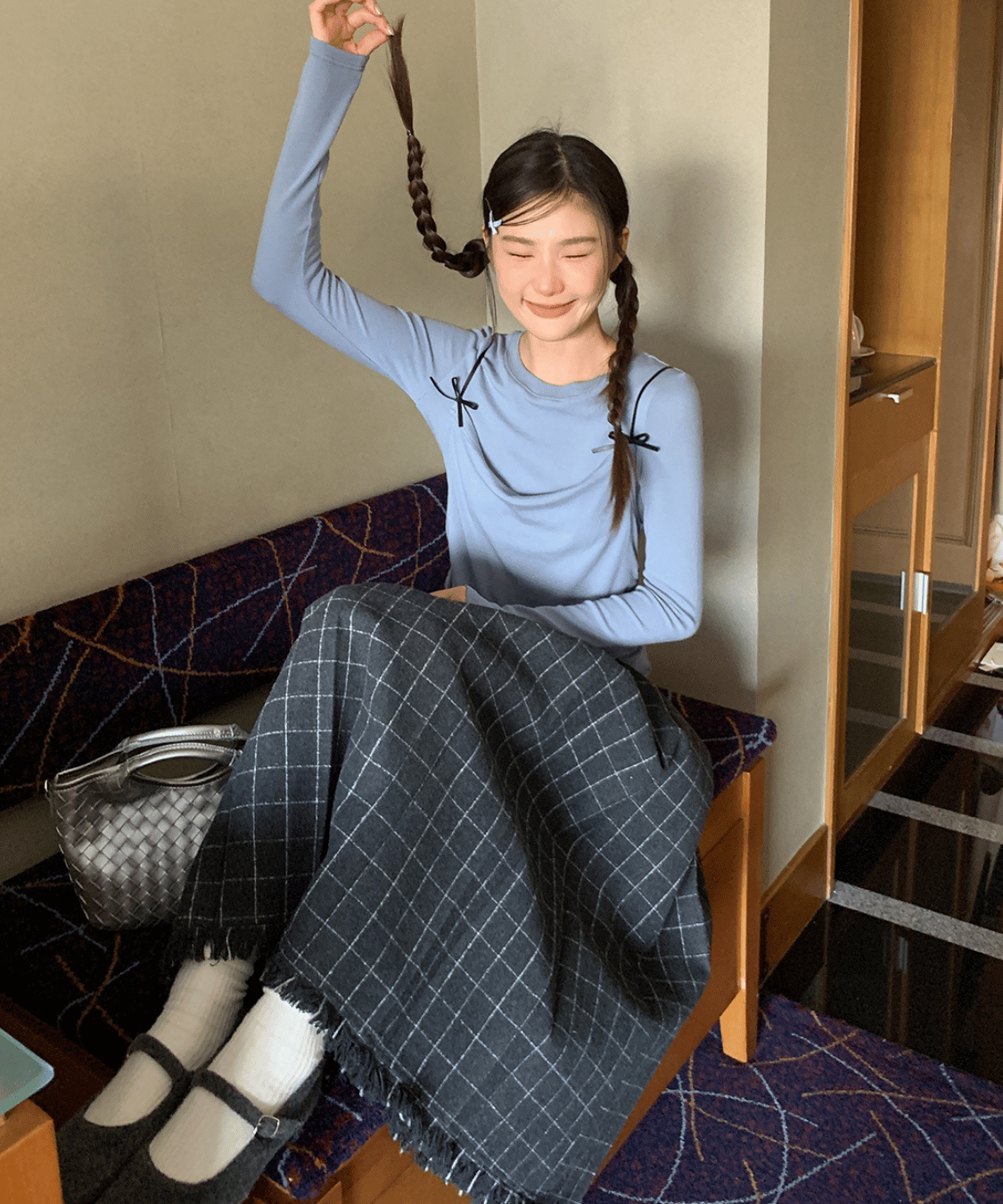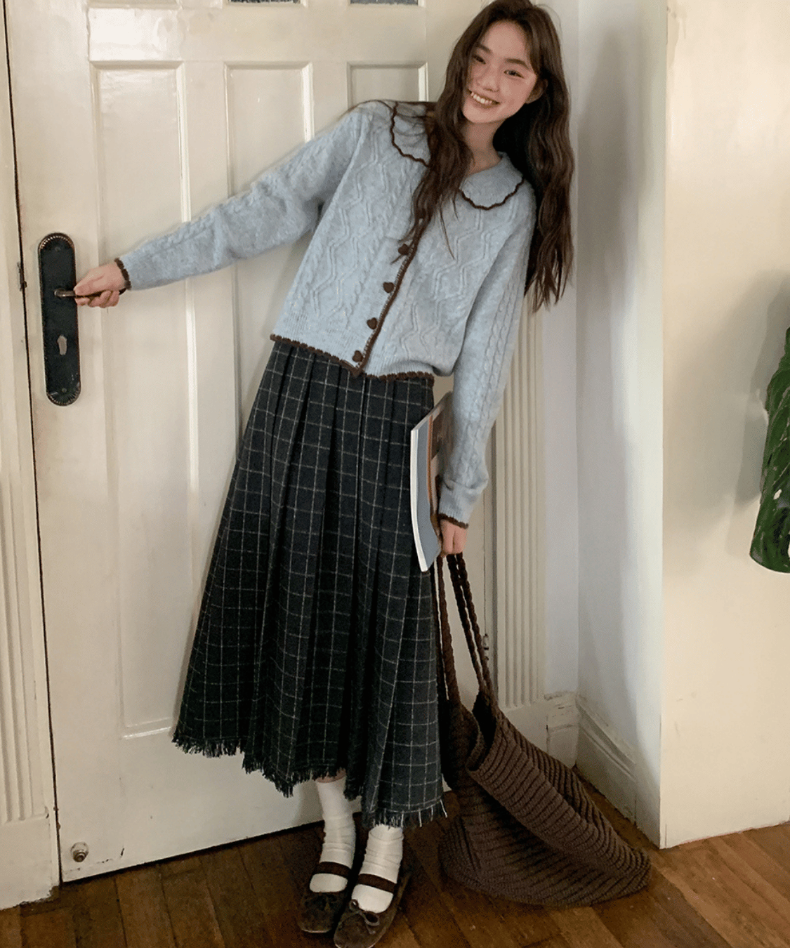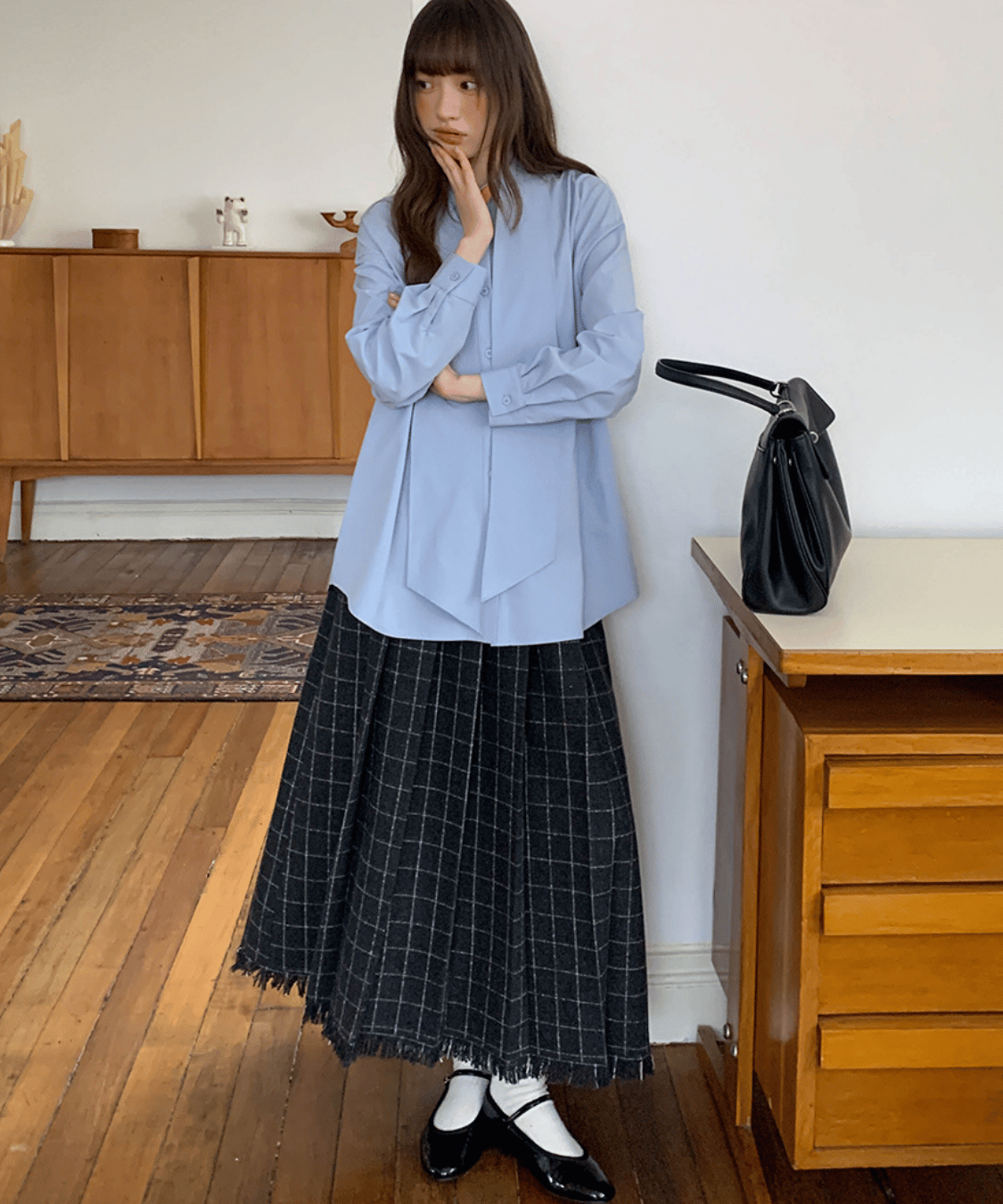 ウール調チェック柄裾フリンジプリーツスカート