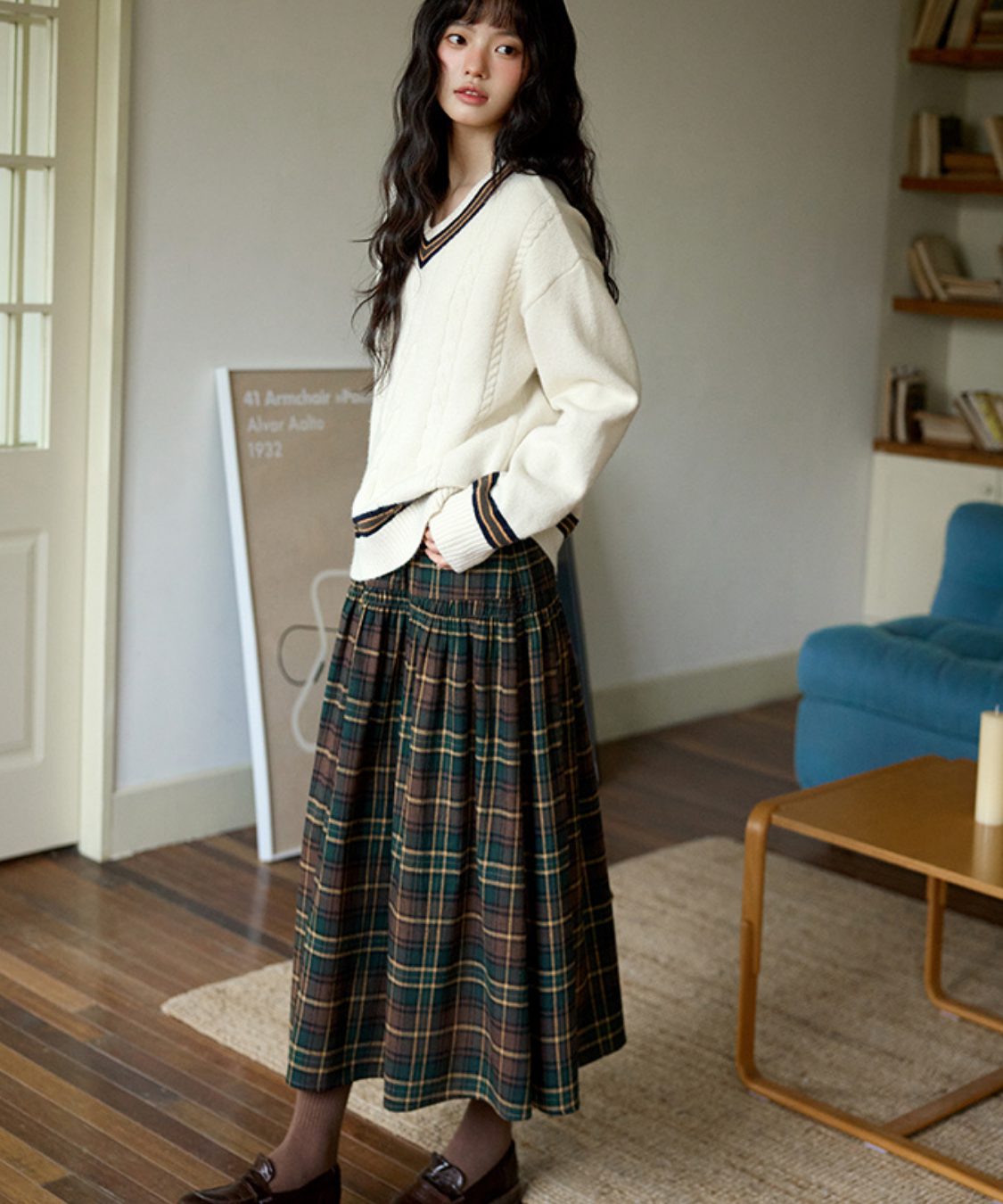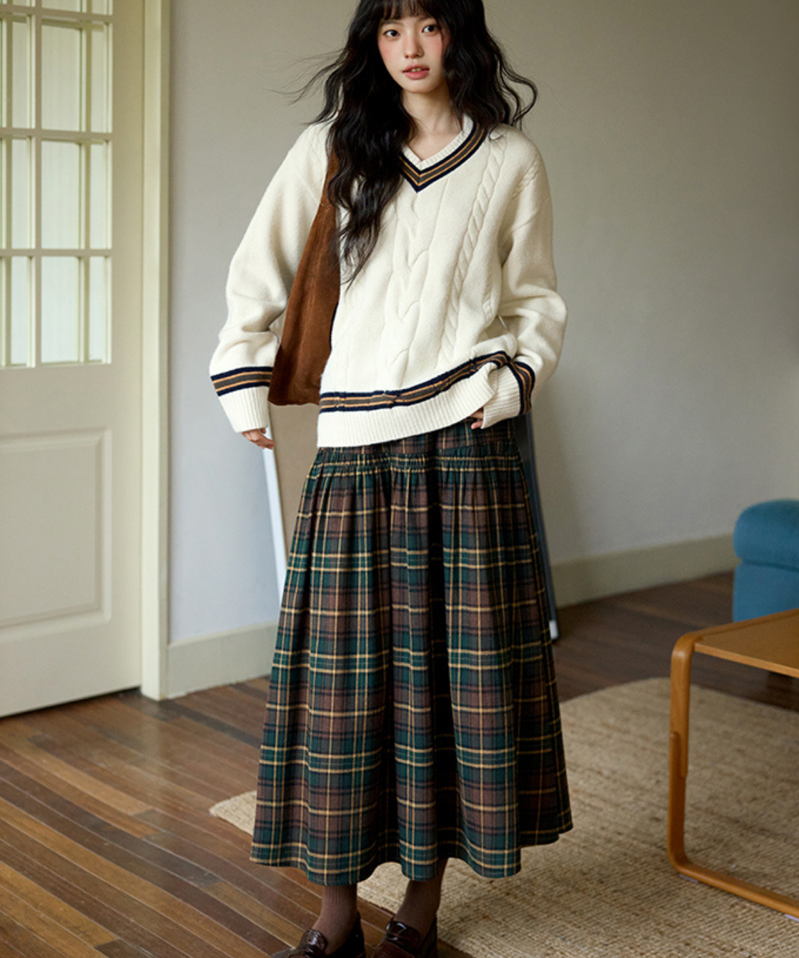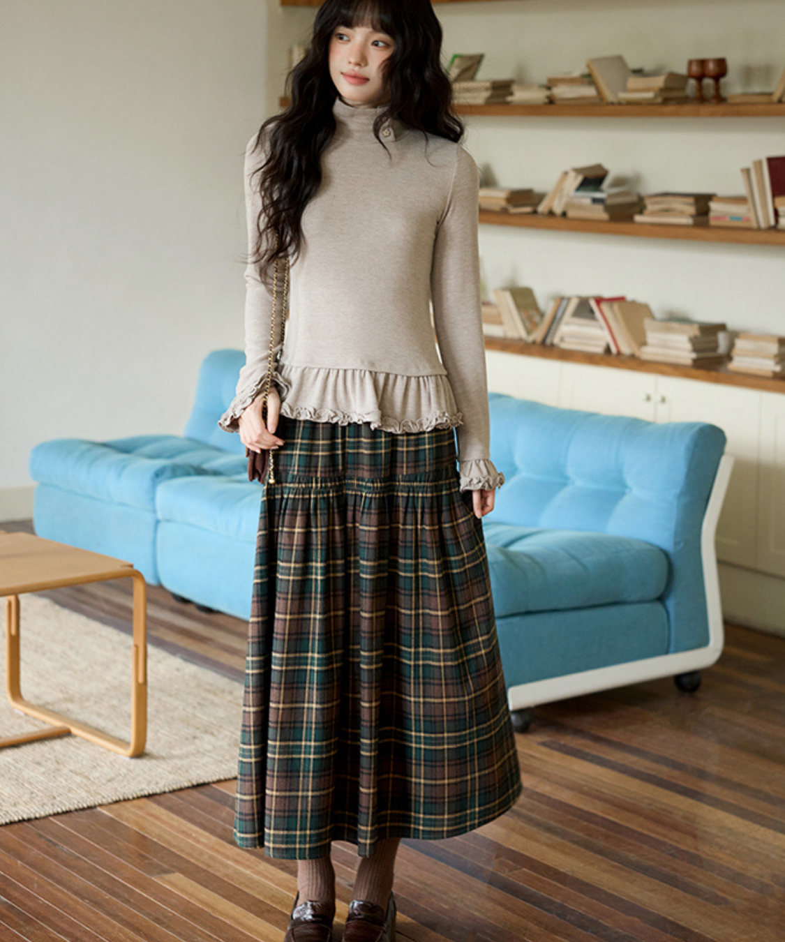 ウエスト切替チェックロングスカート