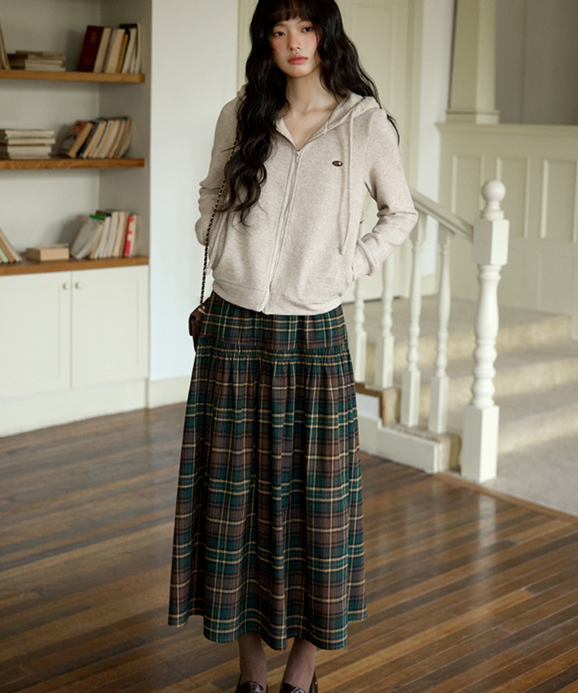 落ち着いた配色のチェック柄が大人可愛いロングスカートです。