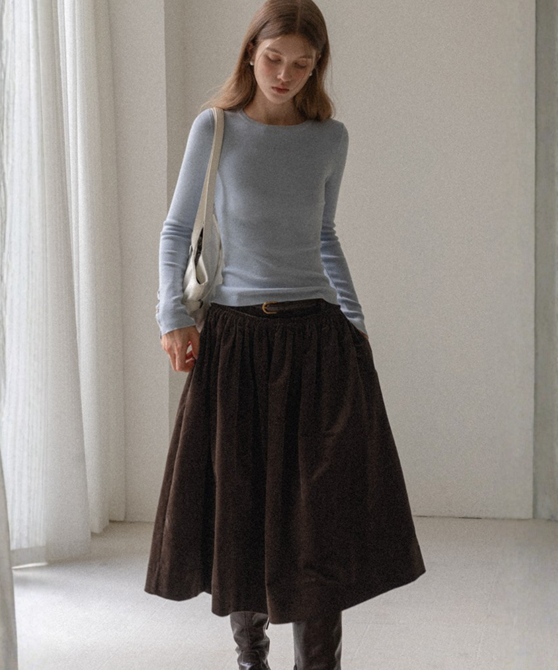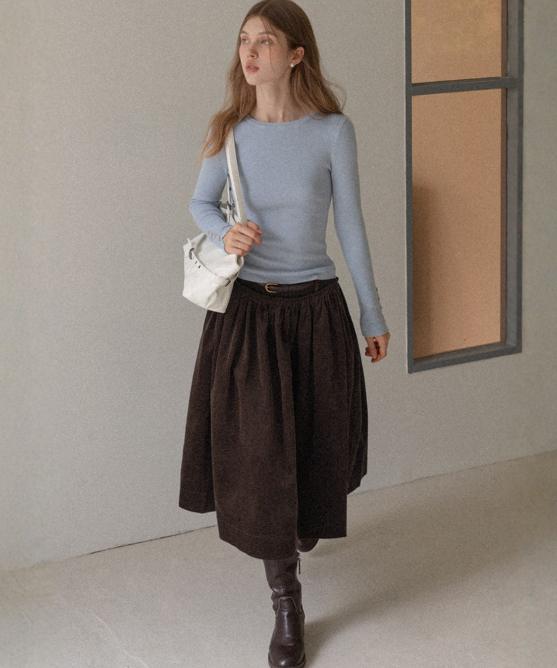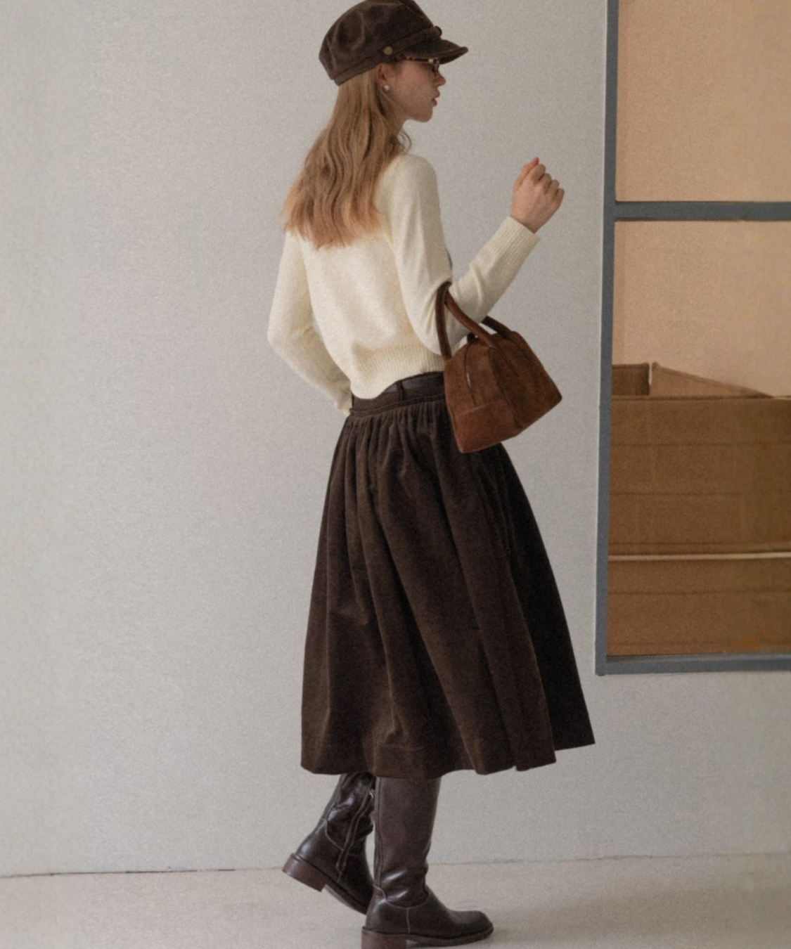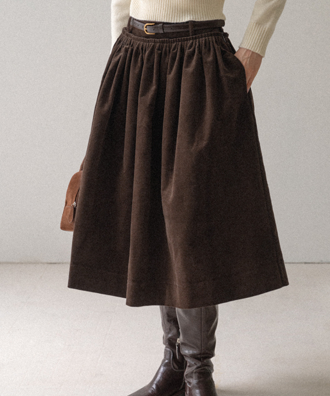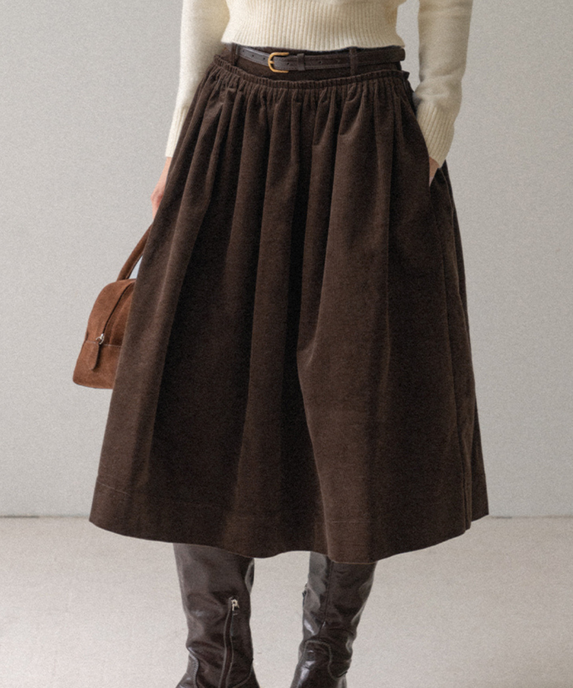 ふんわり広がるギャザーシルエットが魅力の、コーデュロイ素材のスカートです。