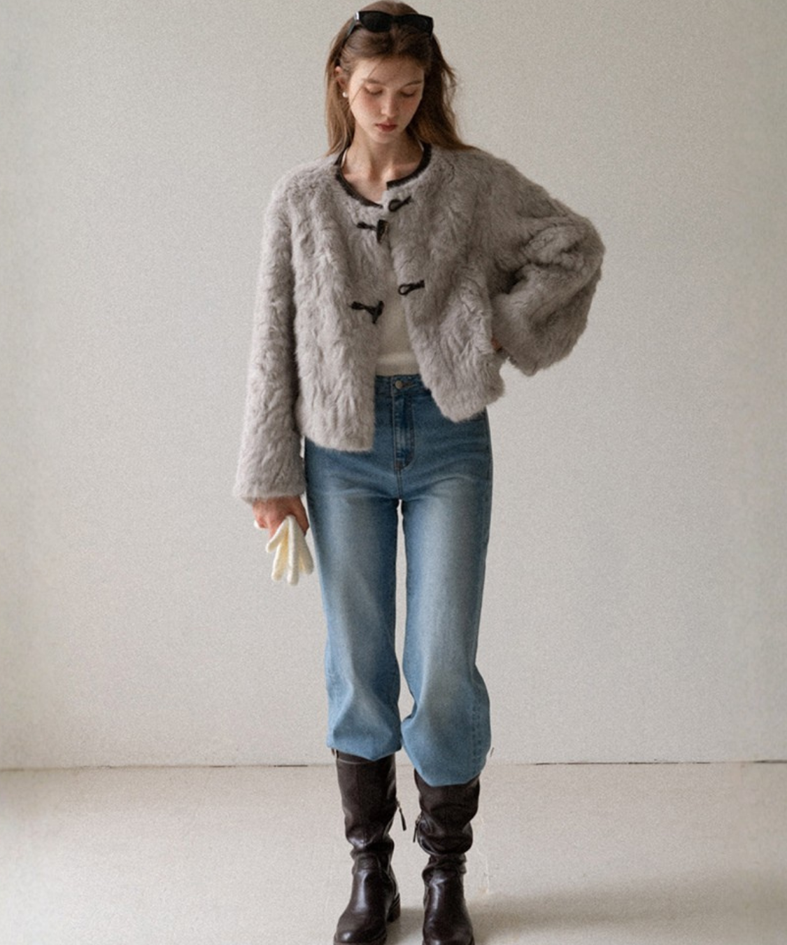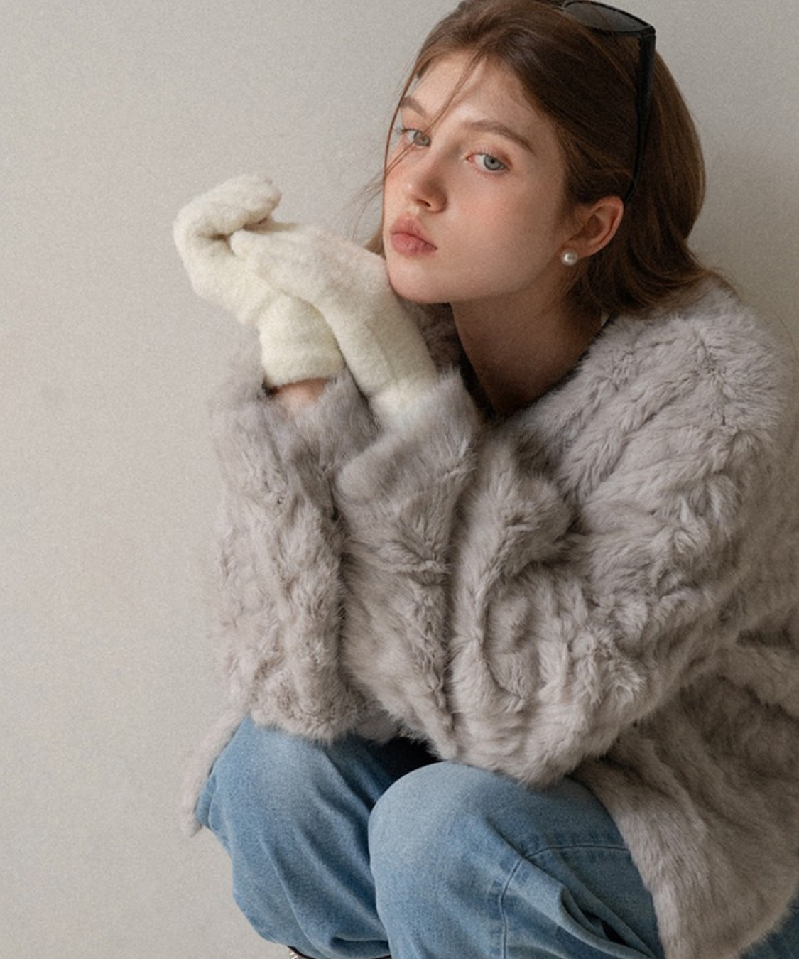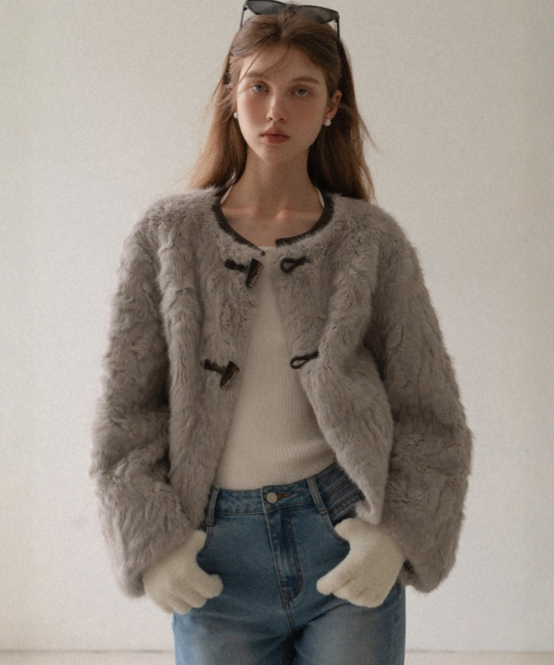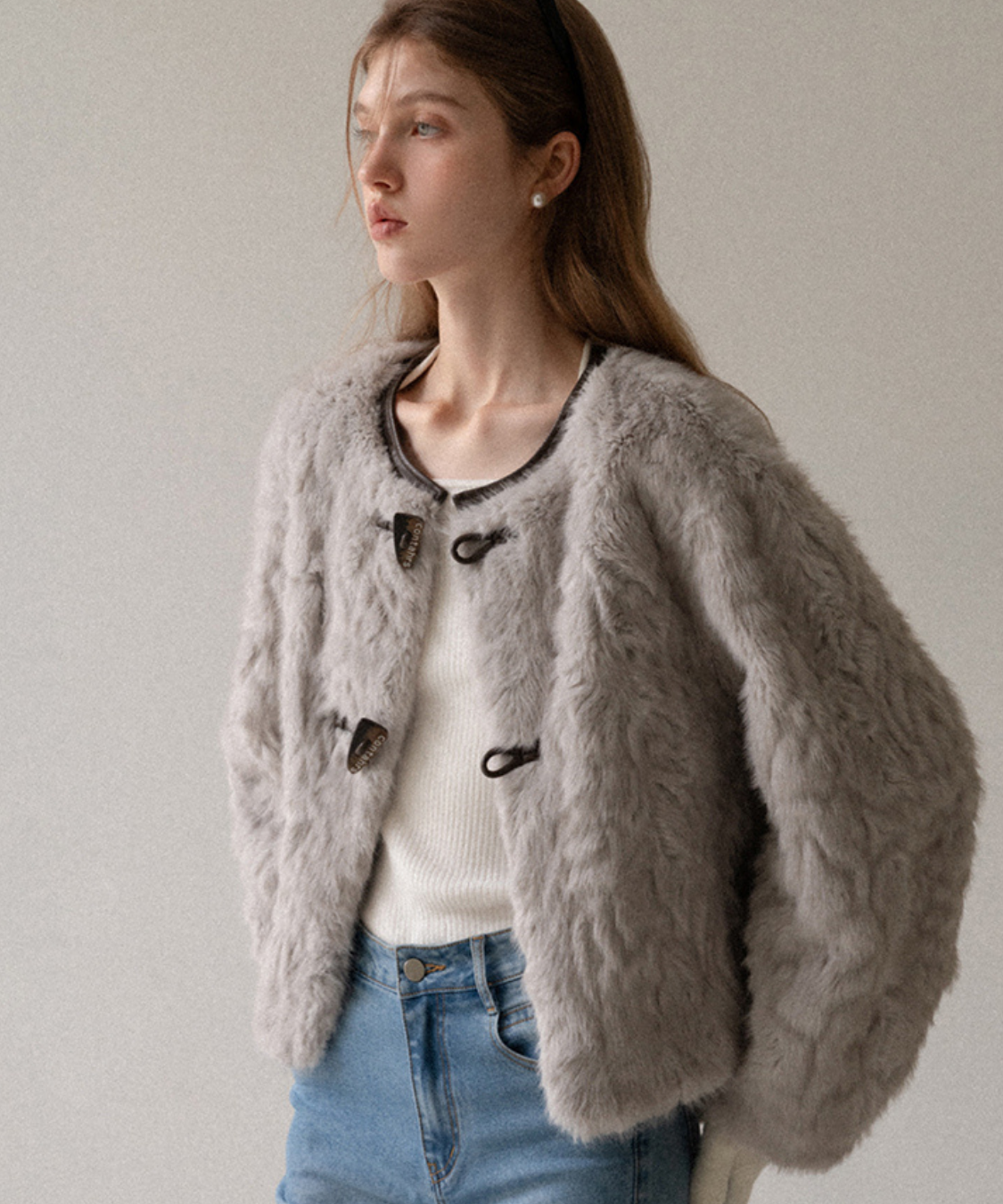 ふんわりとしたフェイクファー素材がシーズンムードを高めてくれるノーカラージャケットです。