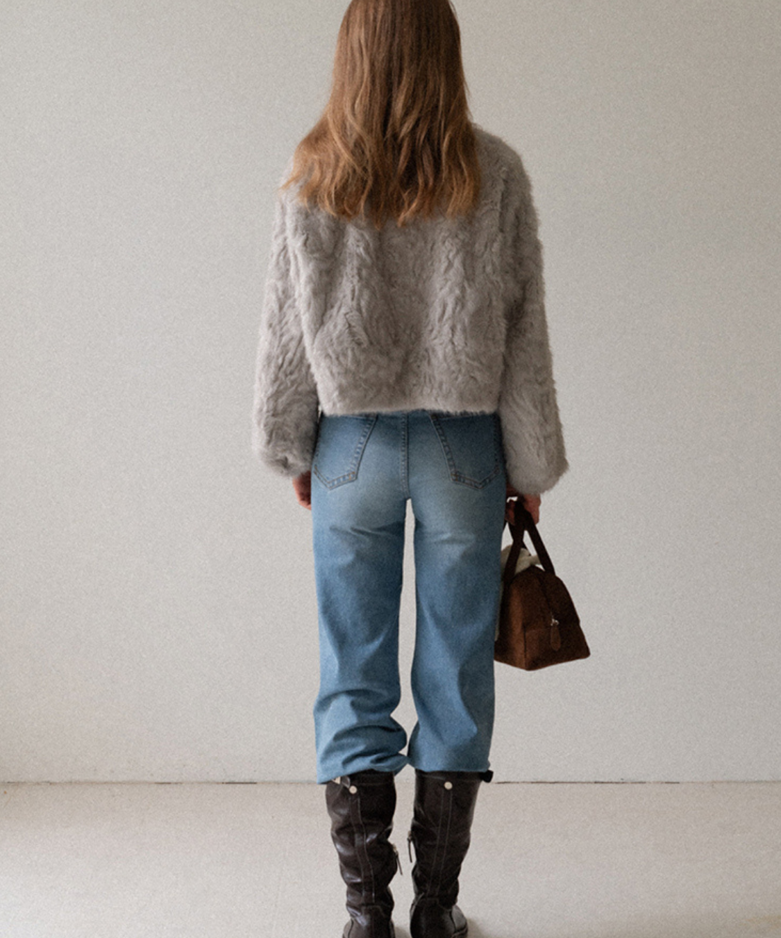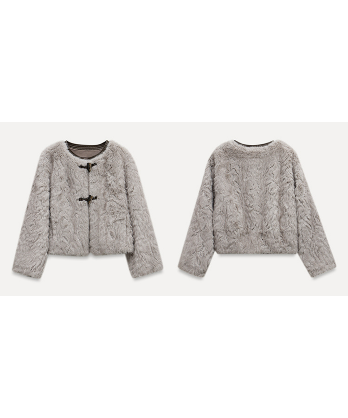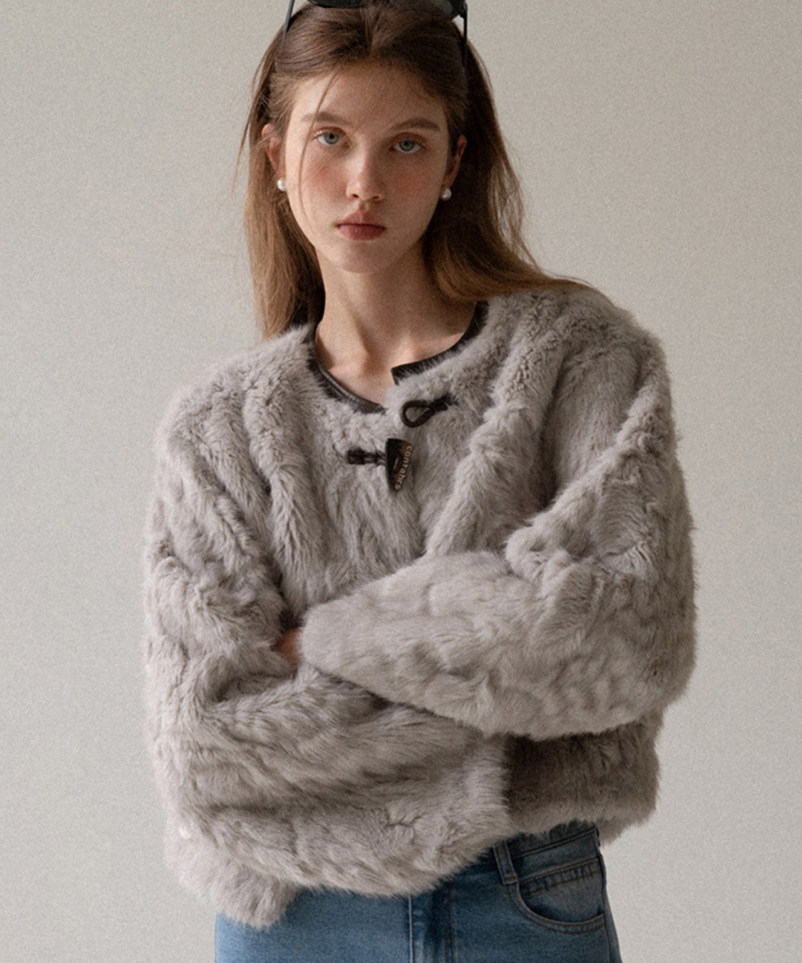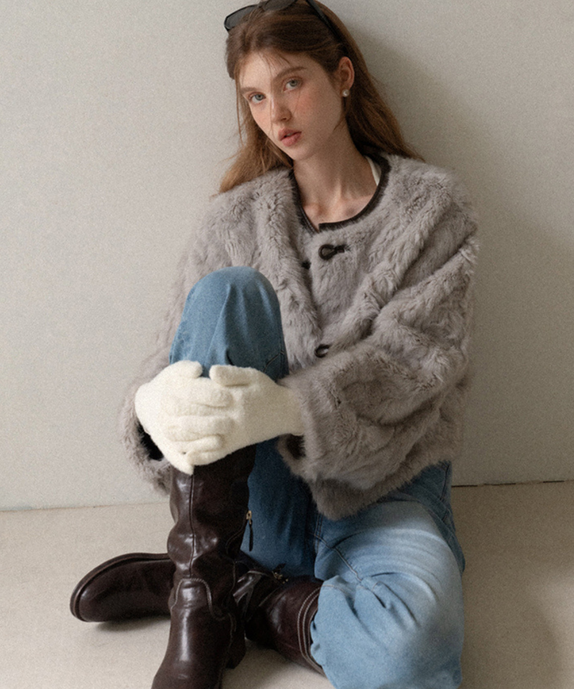 ふんわりとしたフェイクファー素材がシーズンムードを高めてくれるノーカラージャケットです。