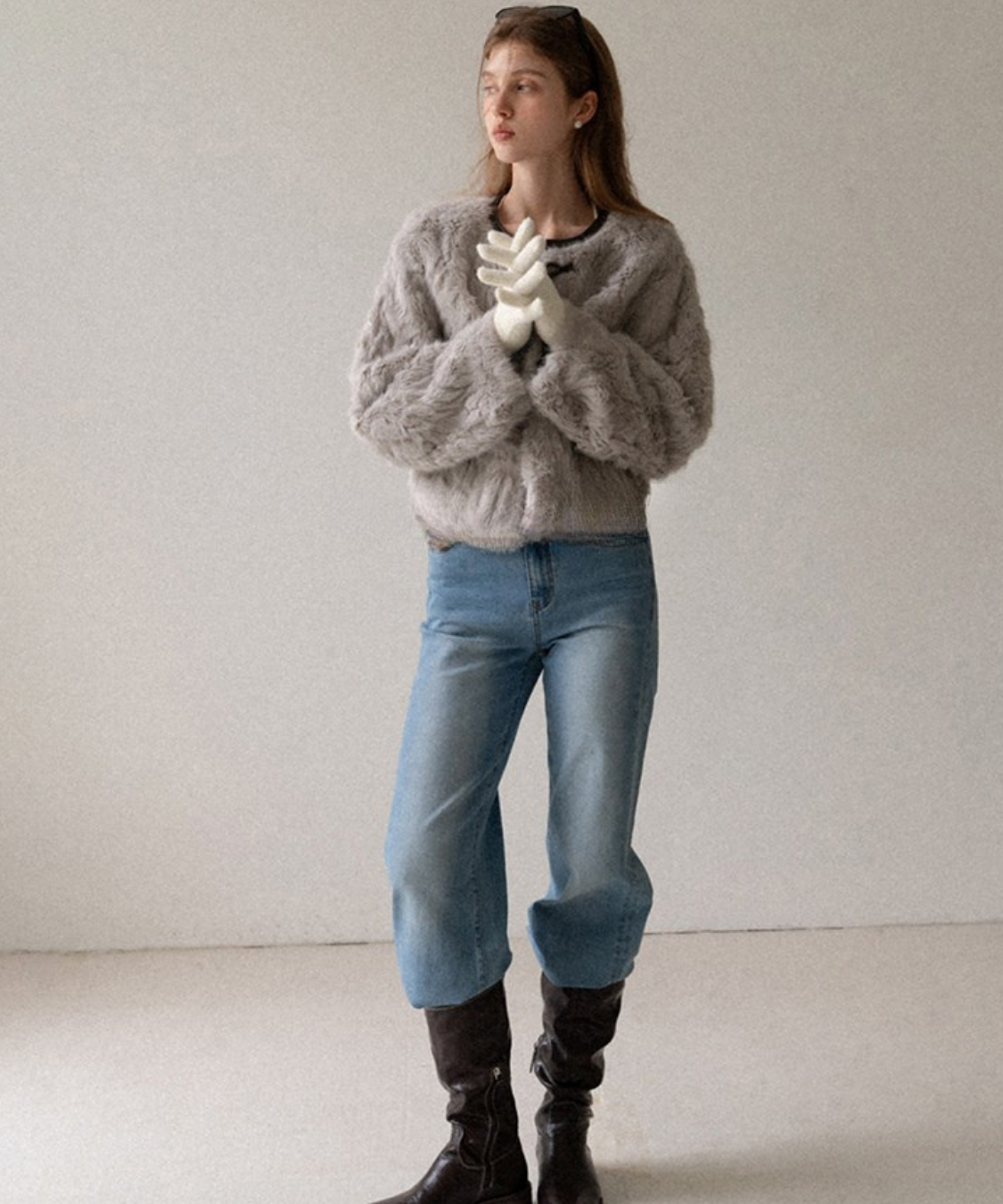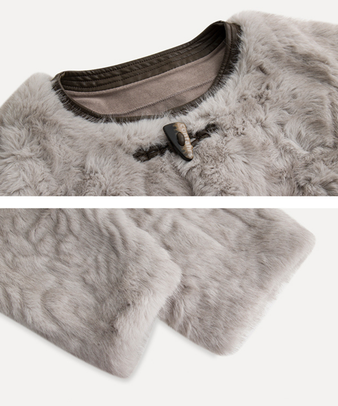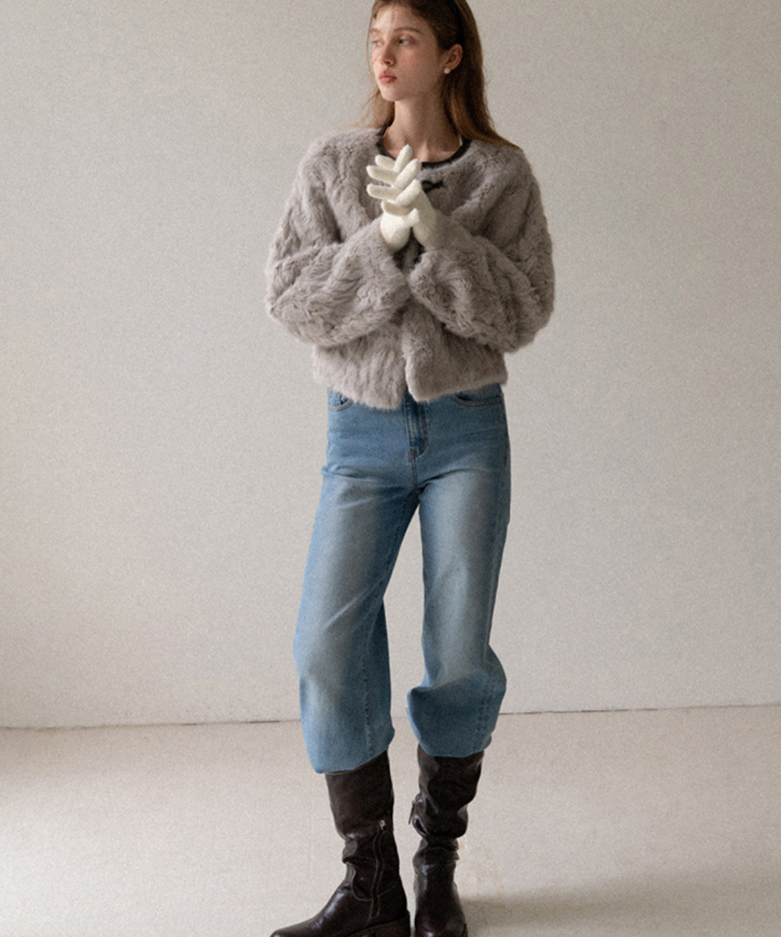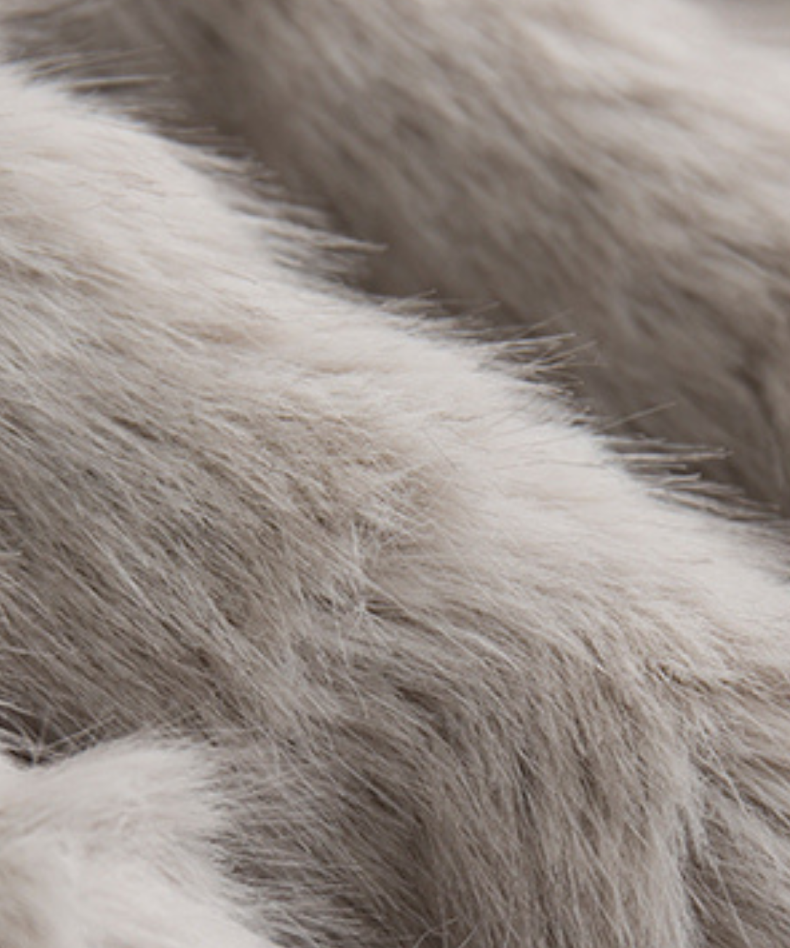 ふんわりとしたフェイクファー素材がシーズンムードを高めてくれるノーカラージャケットです。