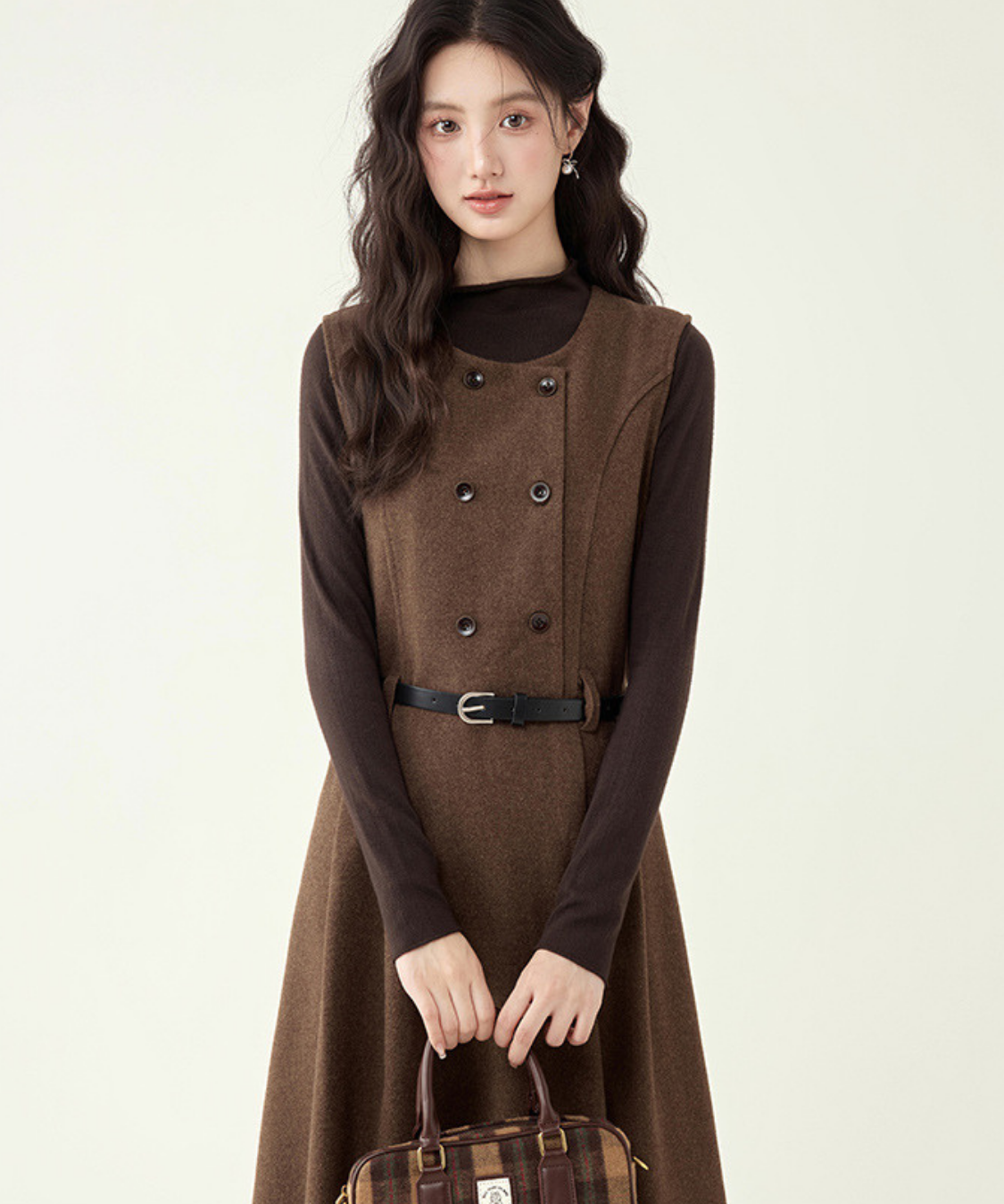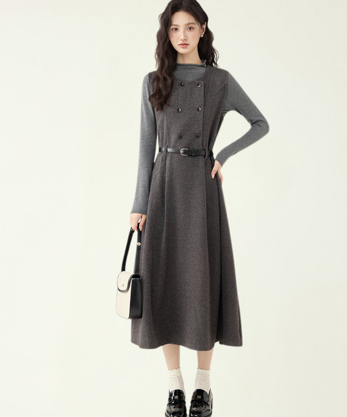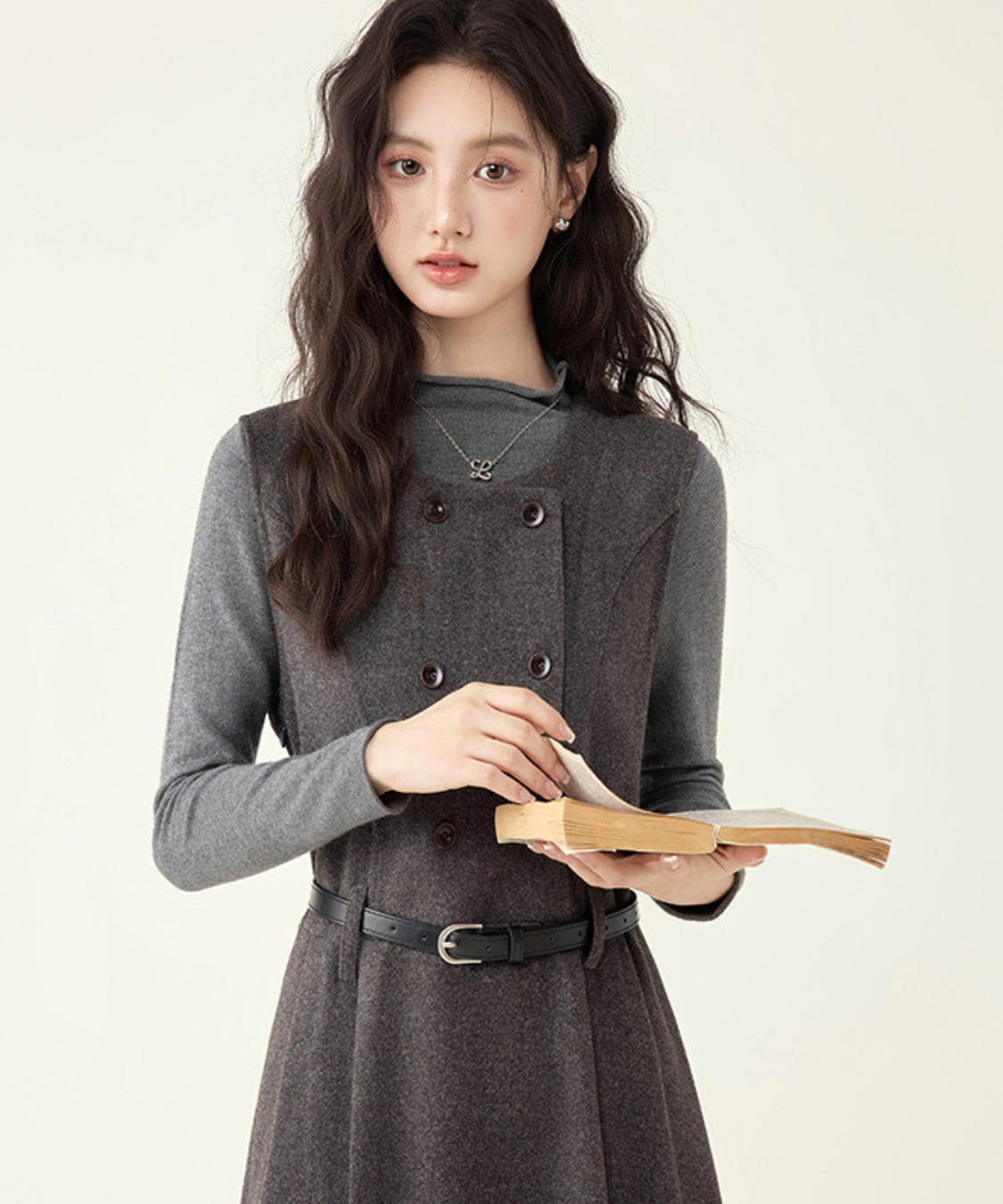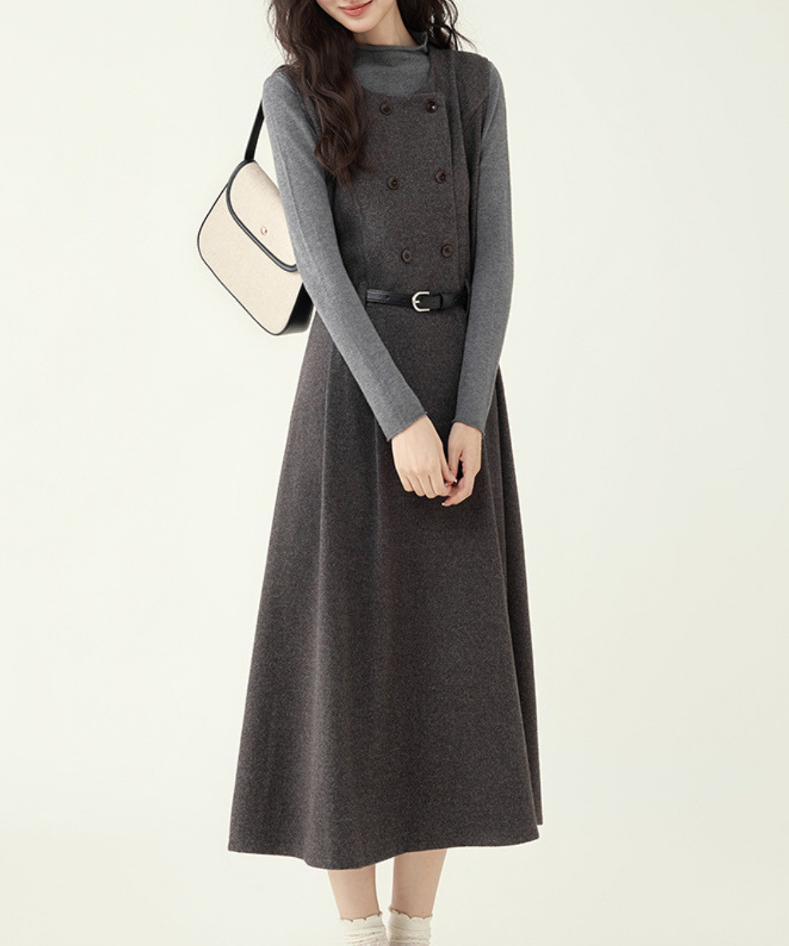 ダブルボタンウール調ジャンパースカート+リブトップス 2点セット