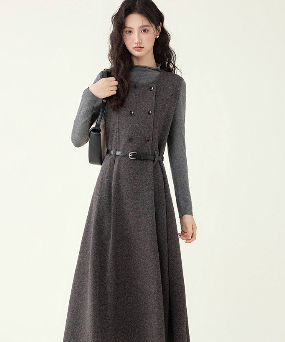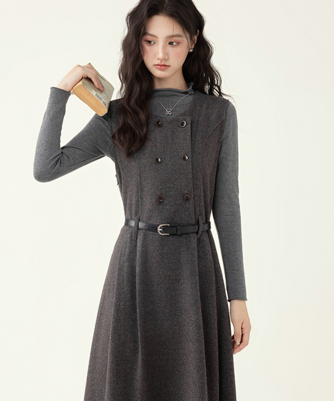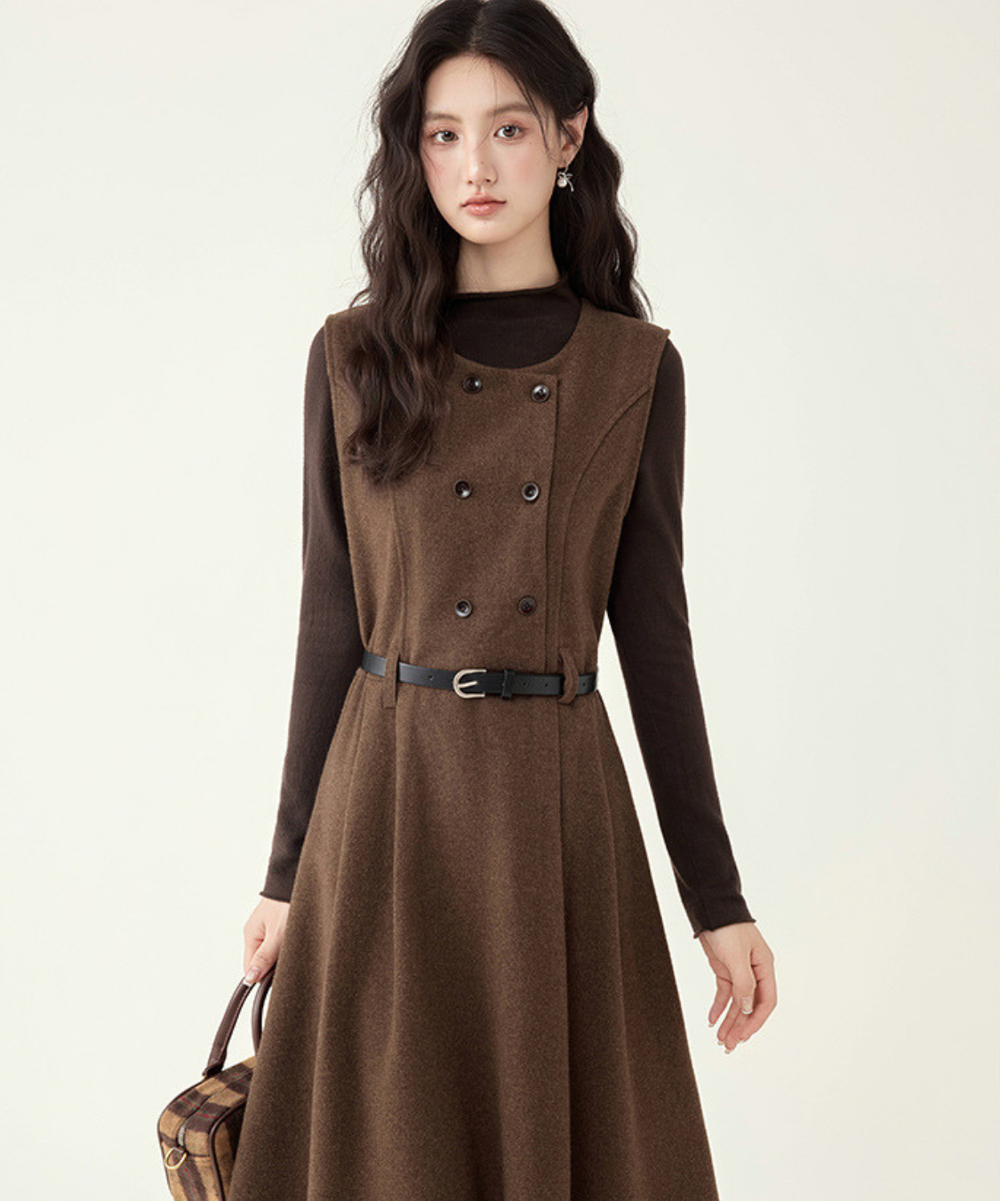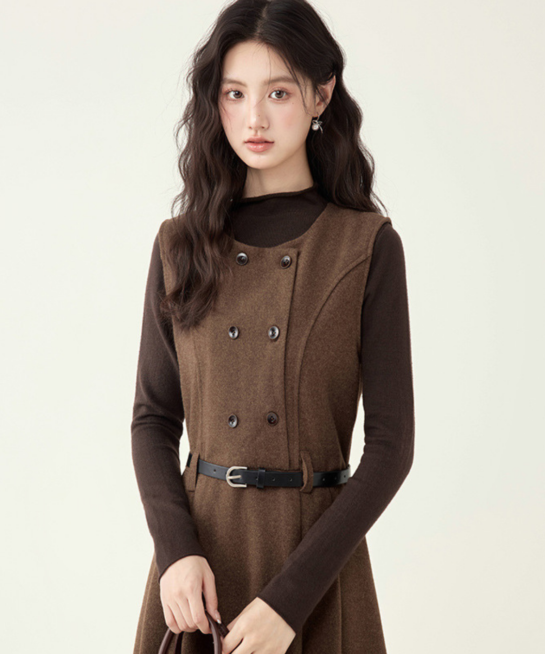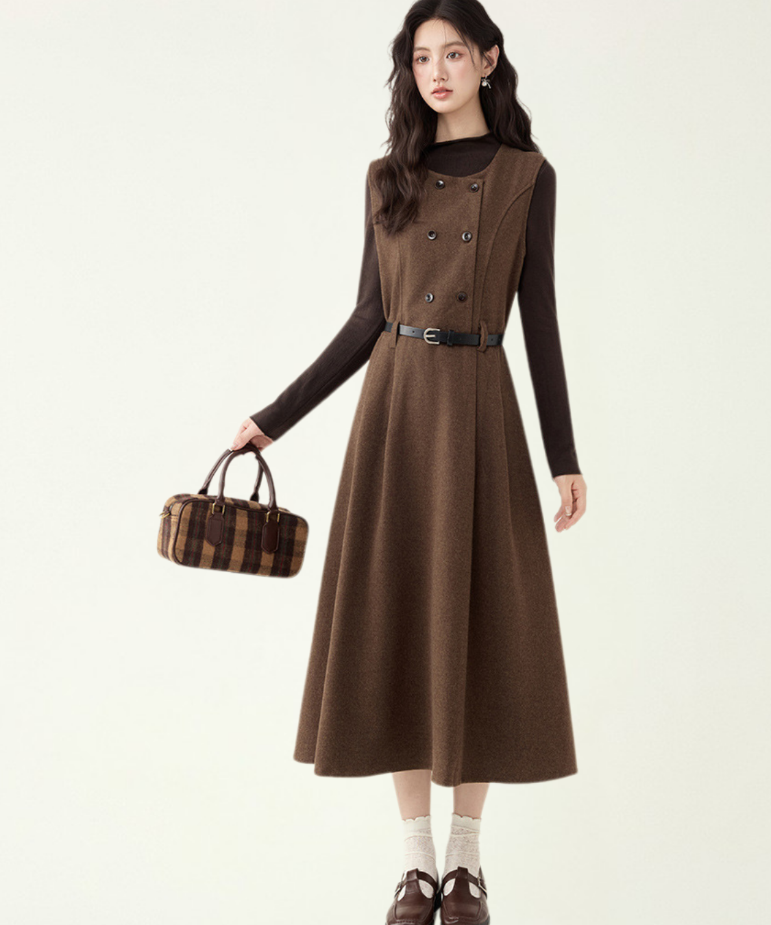 ダブルボタンウール調ジャンパースカート+リブトップス 2点セット