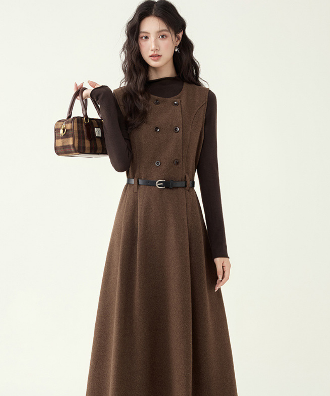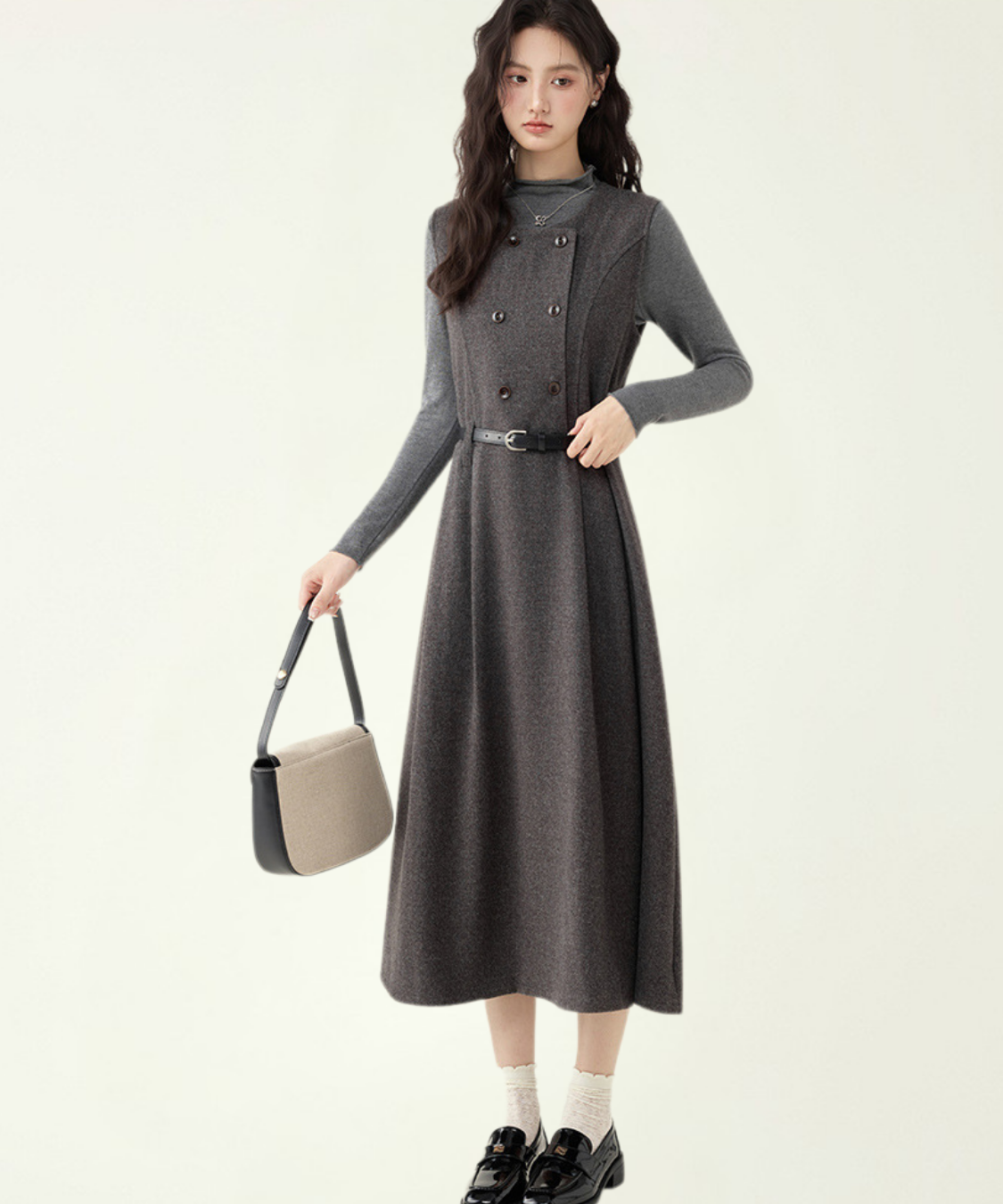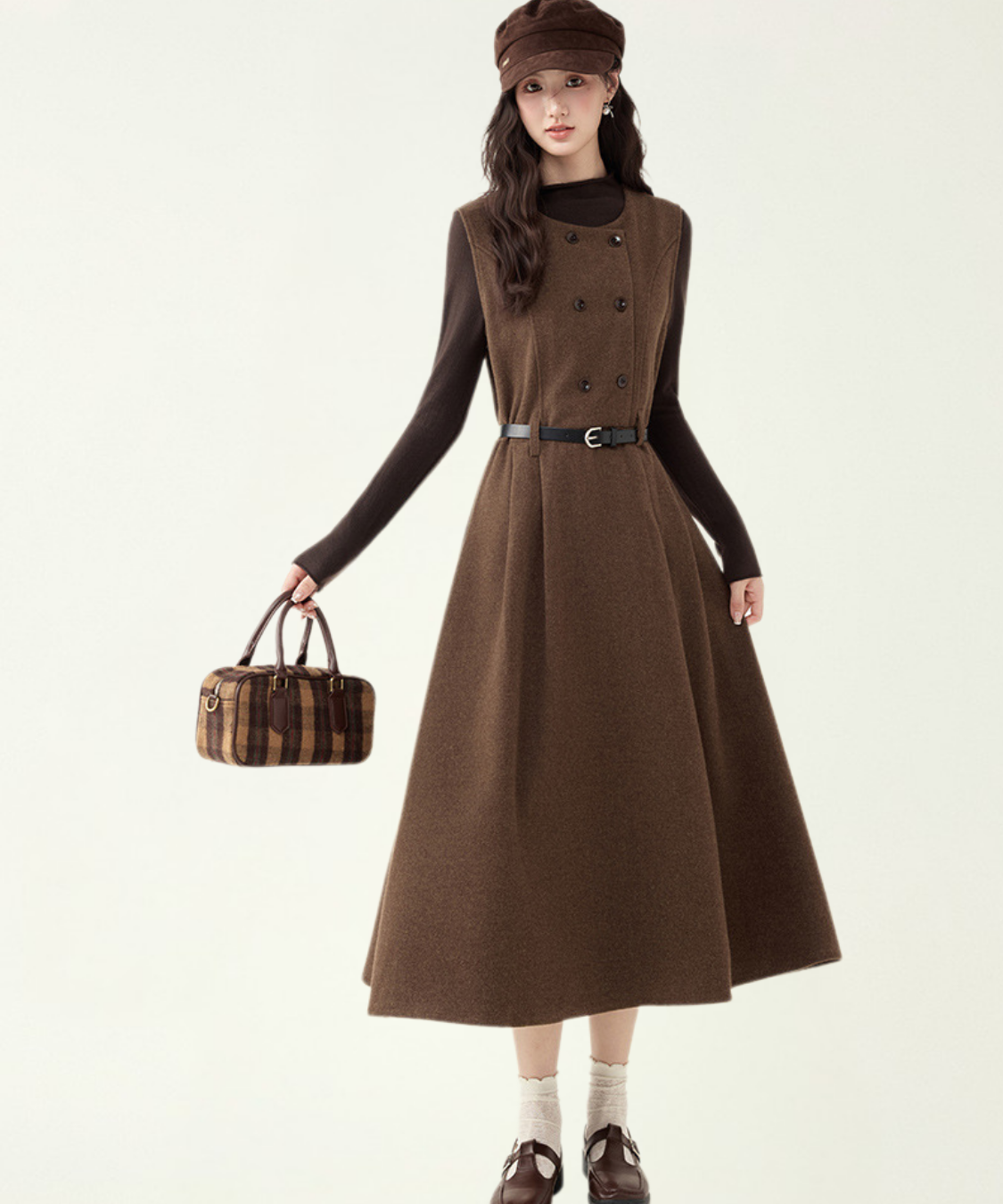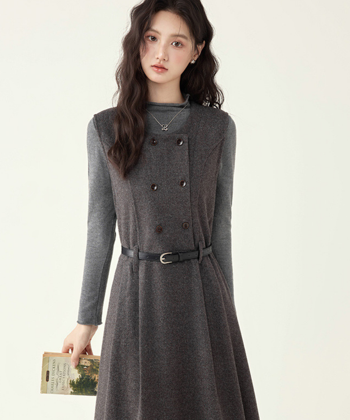 ダブルボタンウール調ジャンパースカート+リブトップス 2点セット