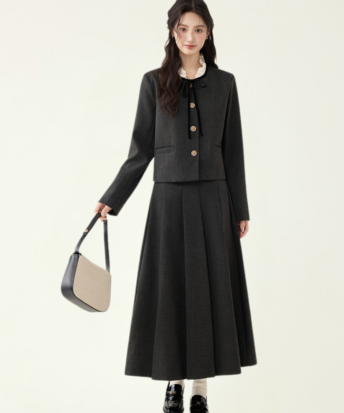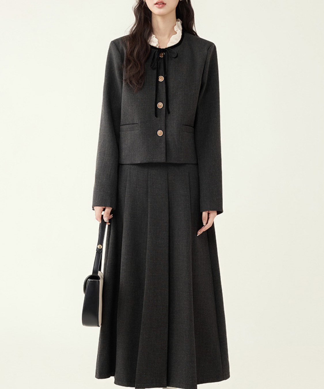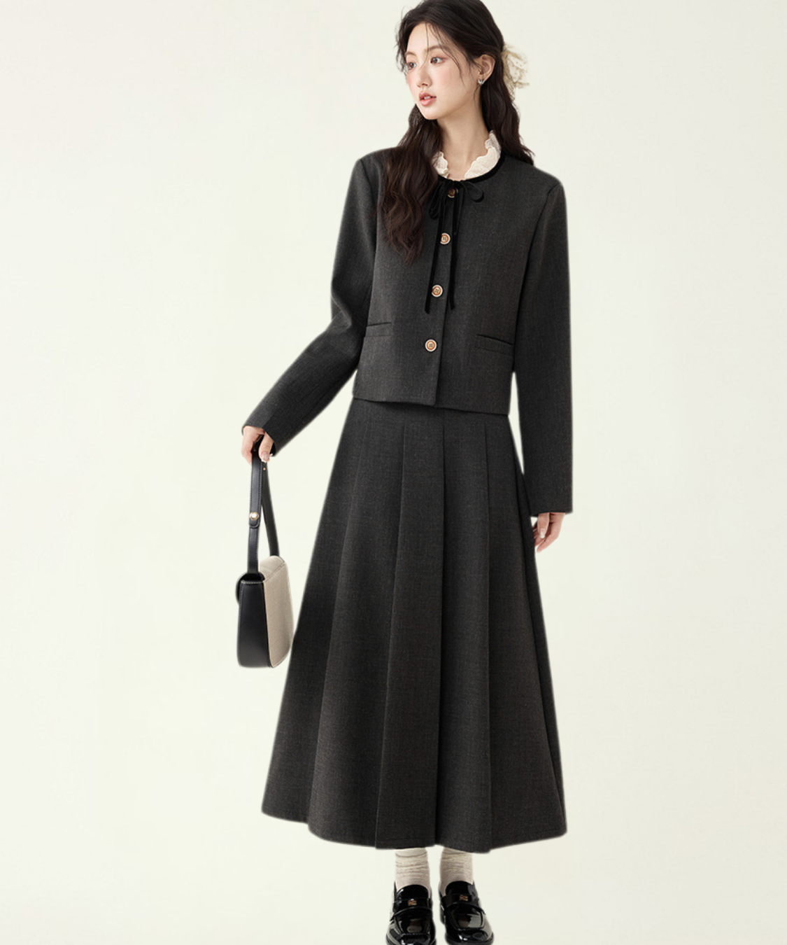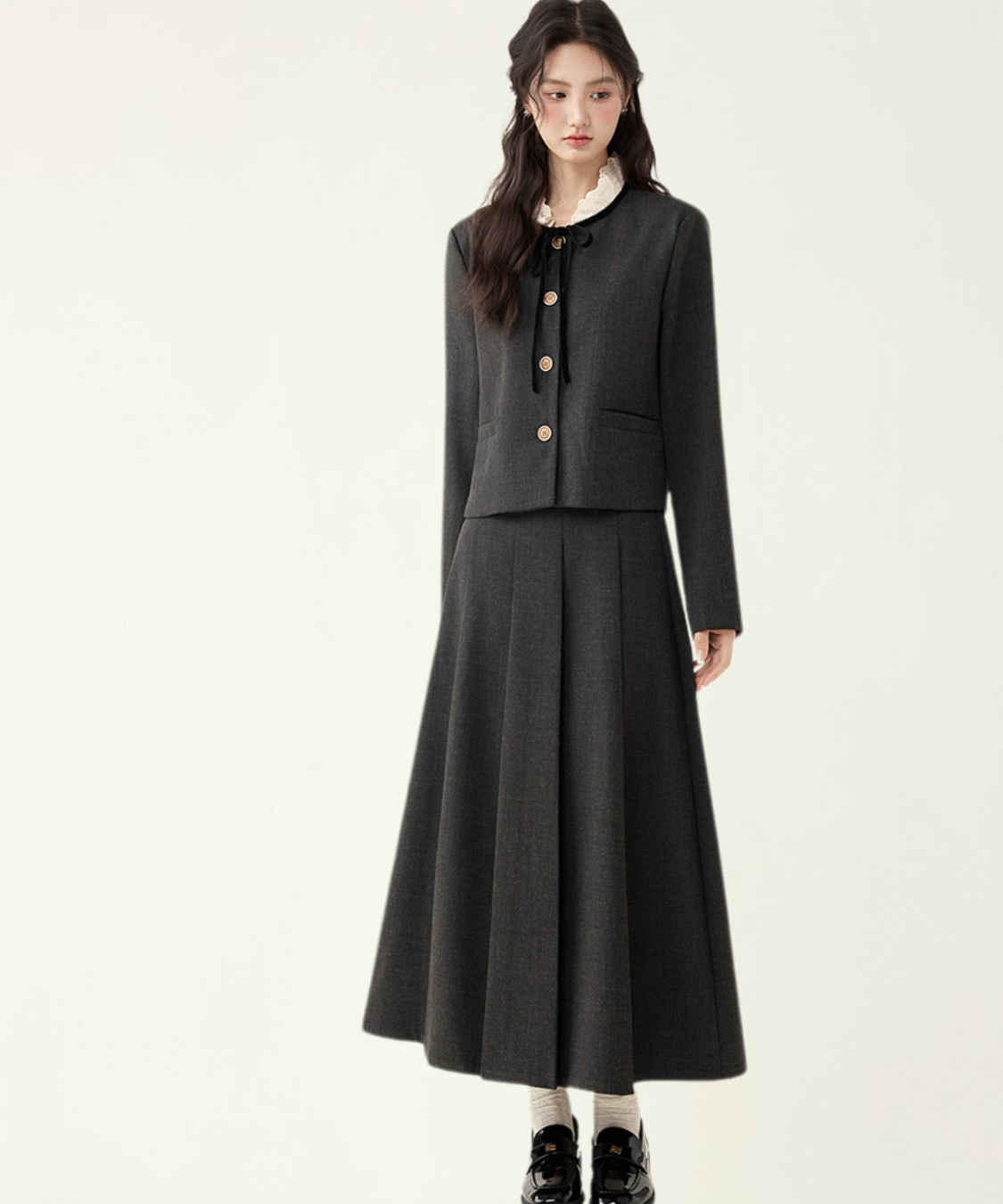 ウール調リボンタイショートジャケット+ロングスカート 2点セット