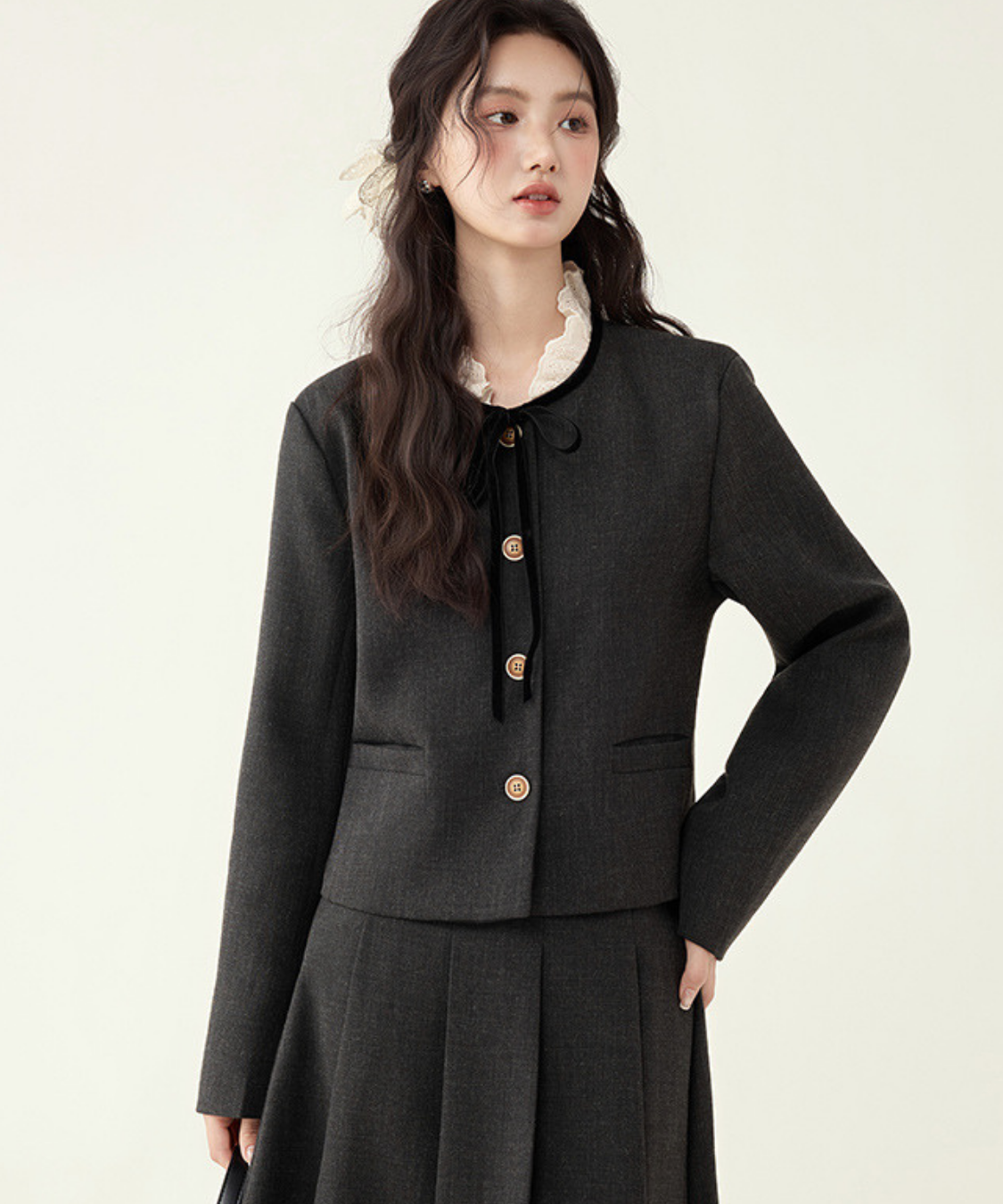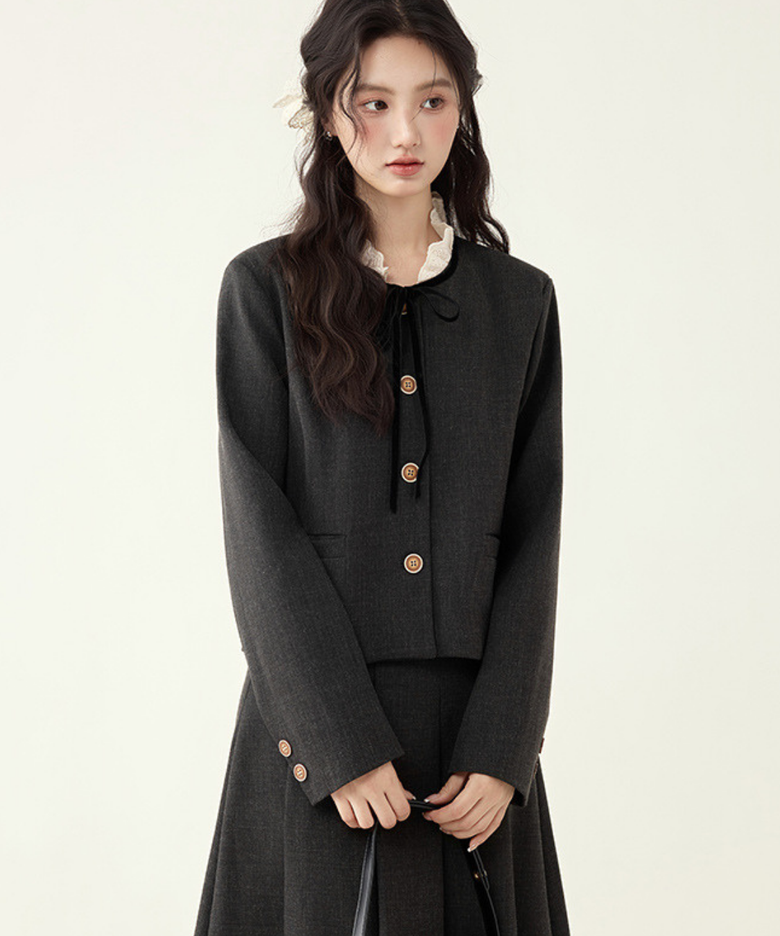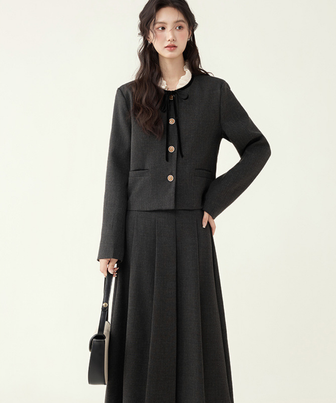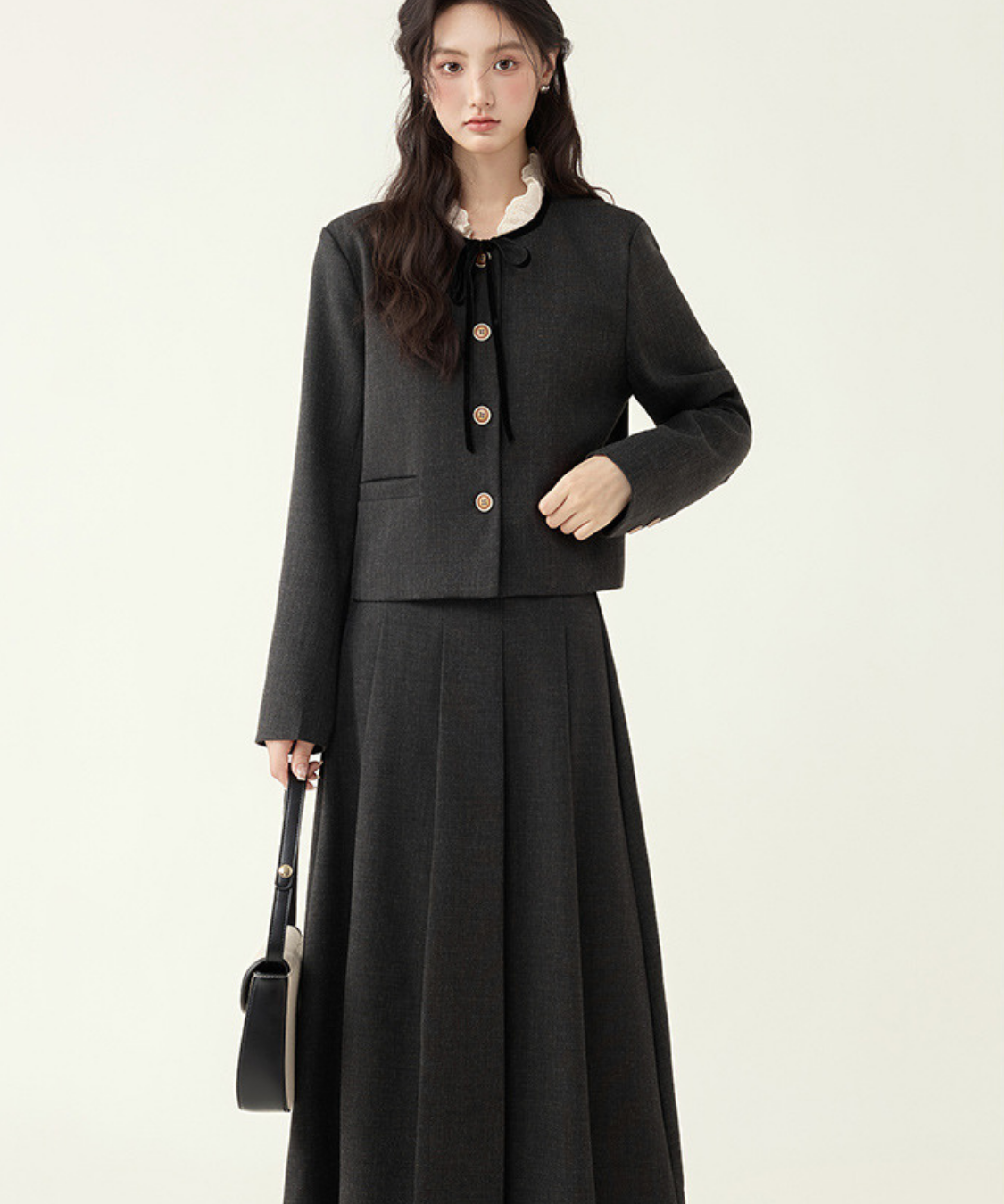 ウール調リボンタイショートジャケット+ロングスカート 2点セット