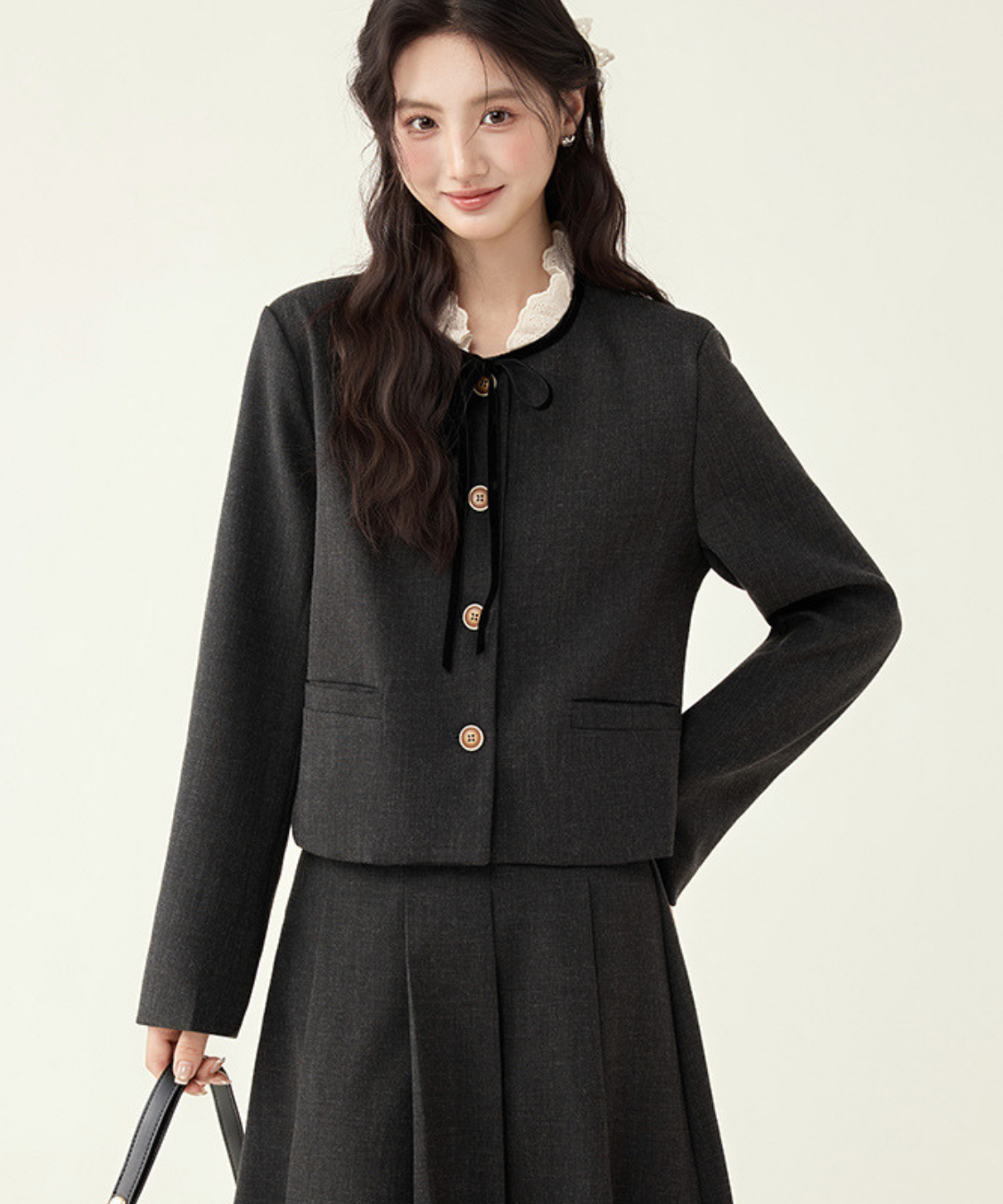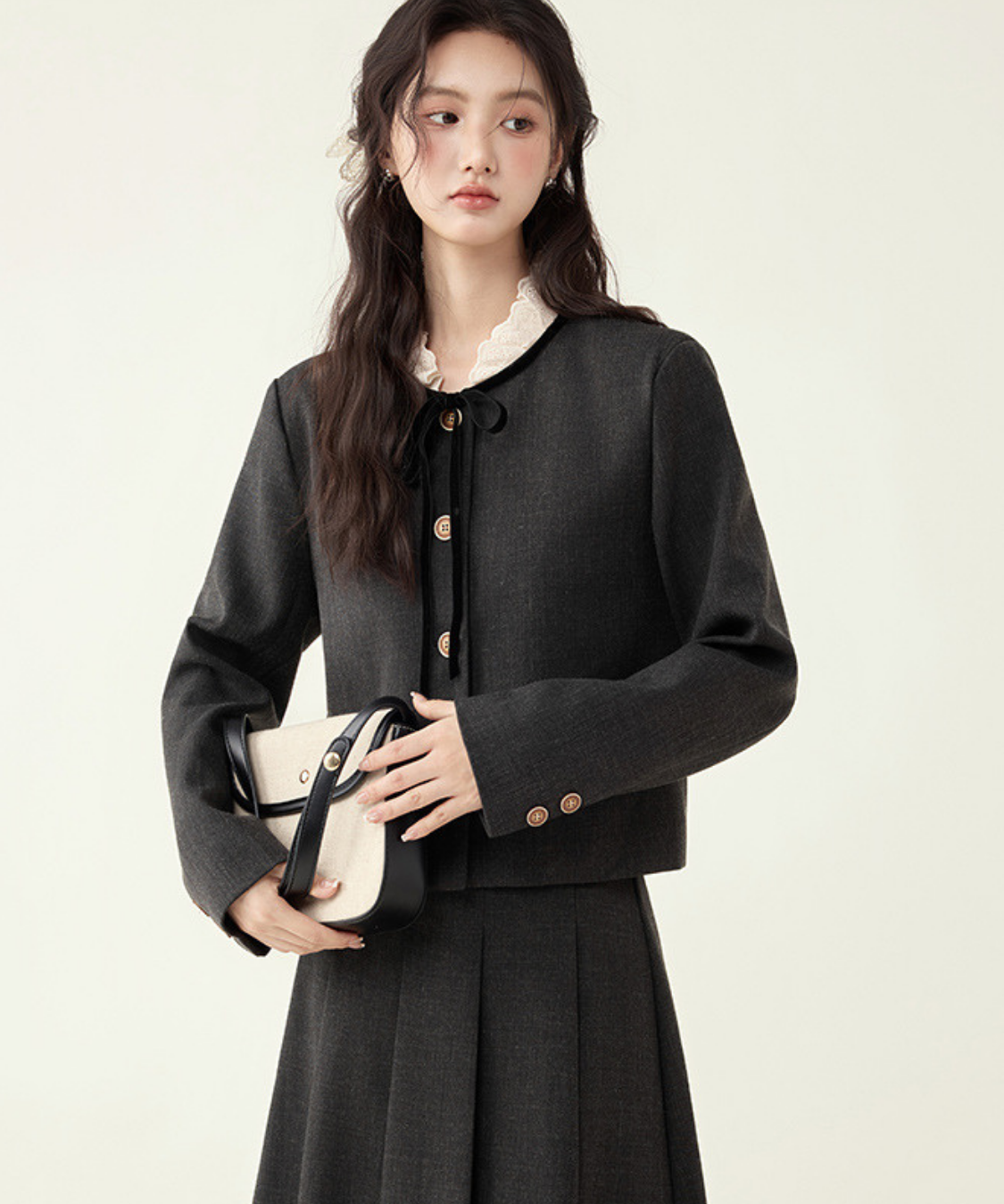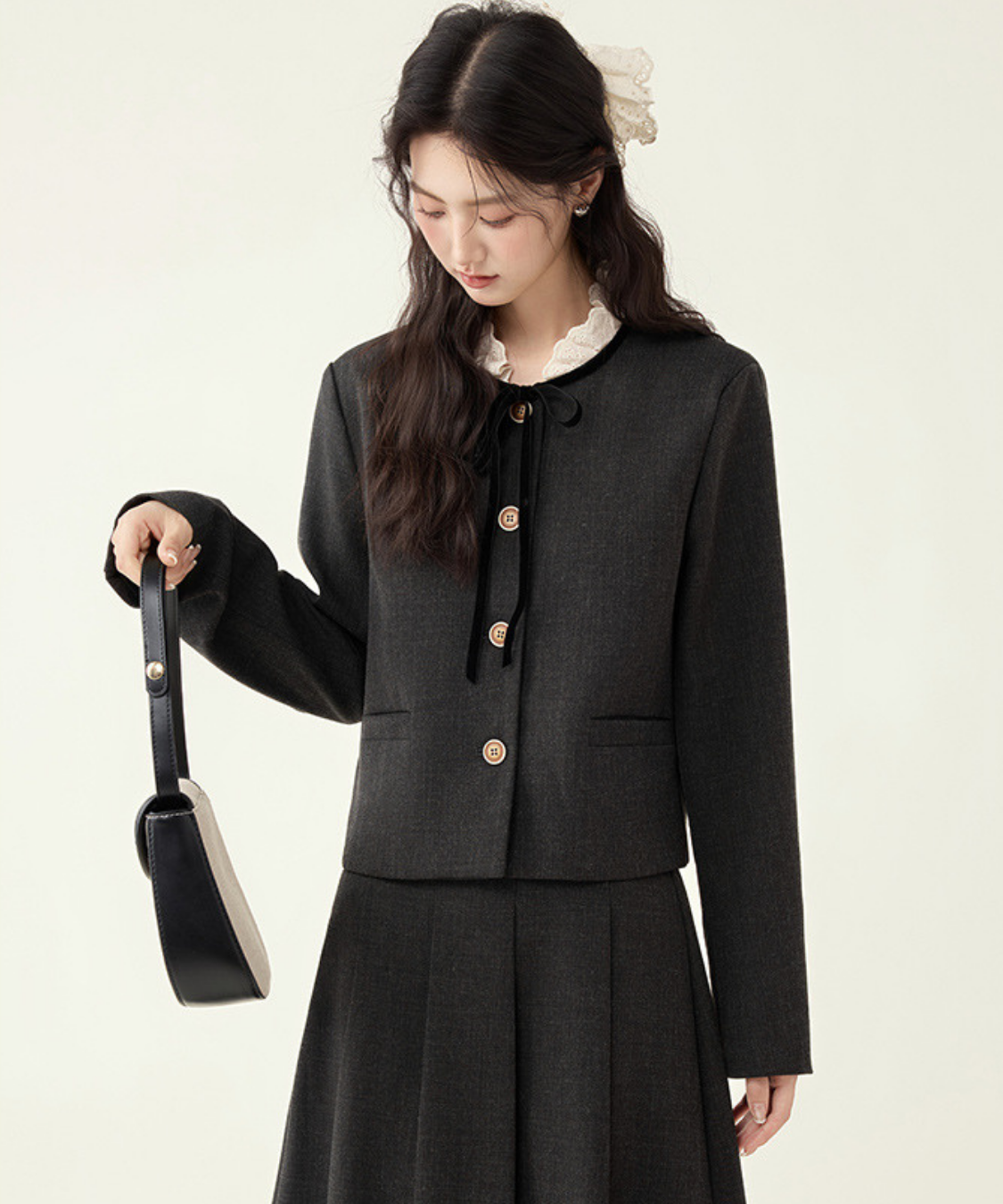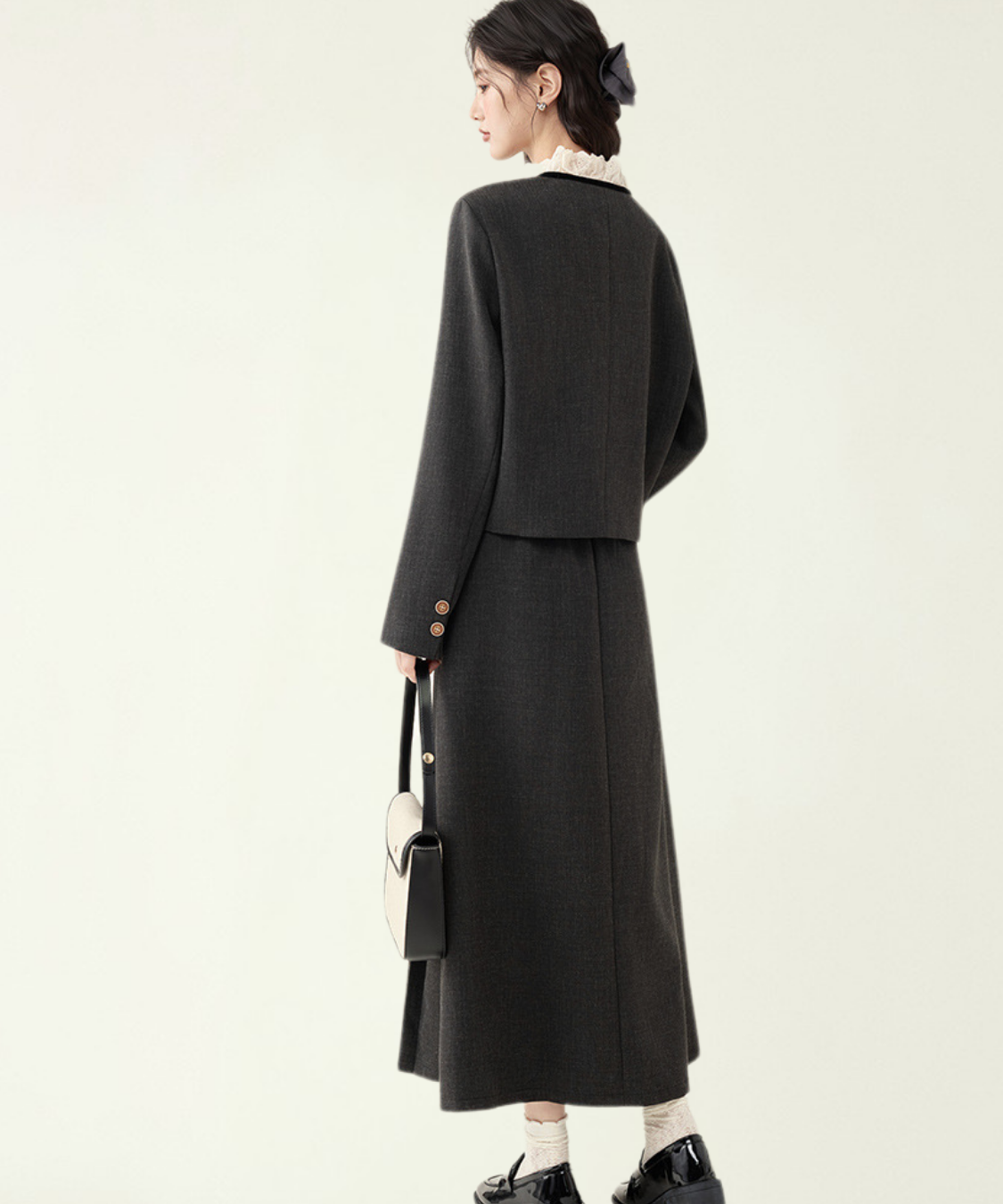 ウール調リボンタイショートジャケット+ロングスカート 2点セット