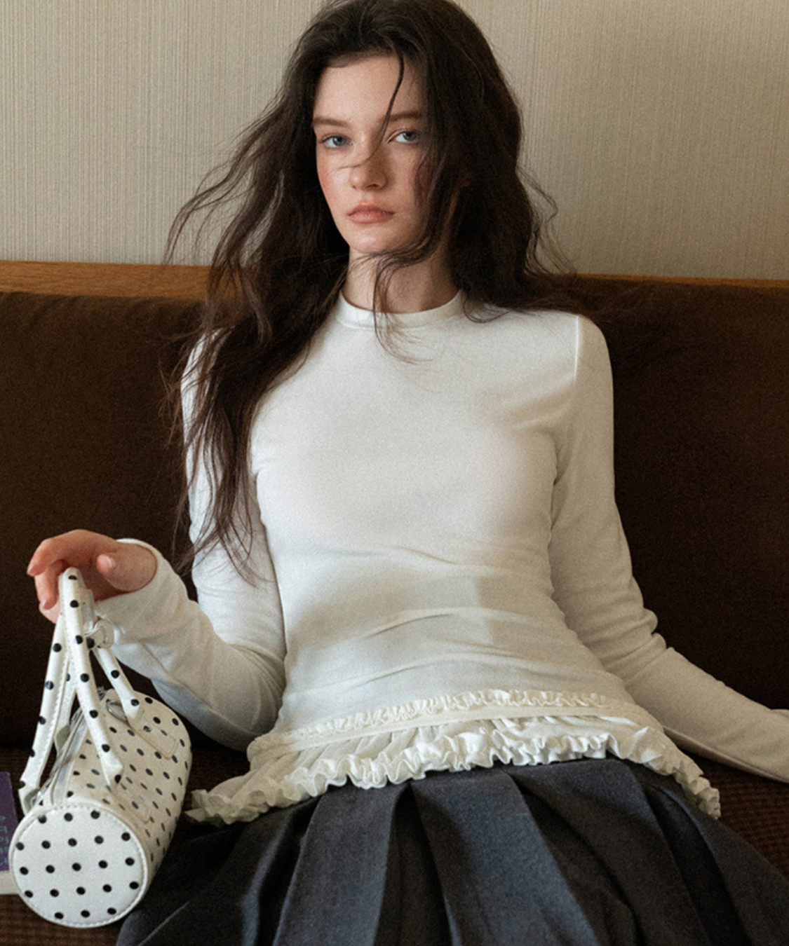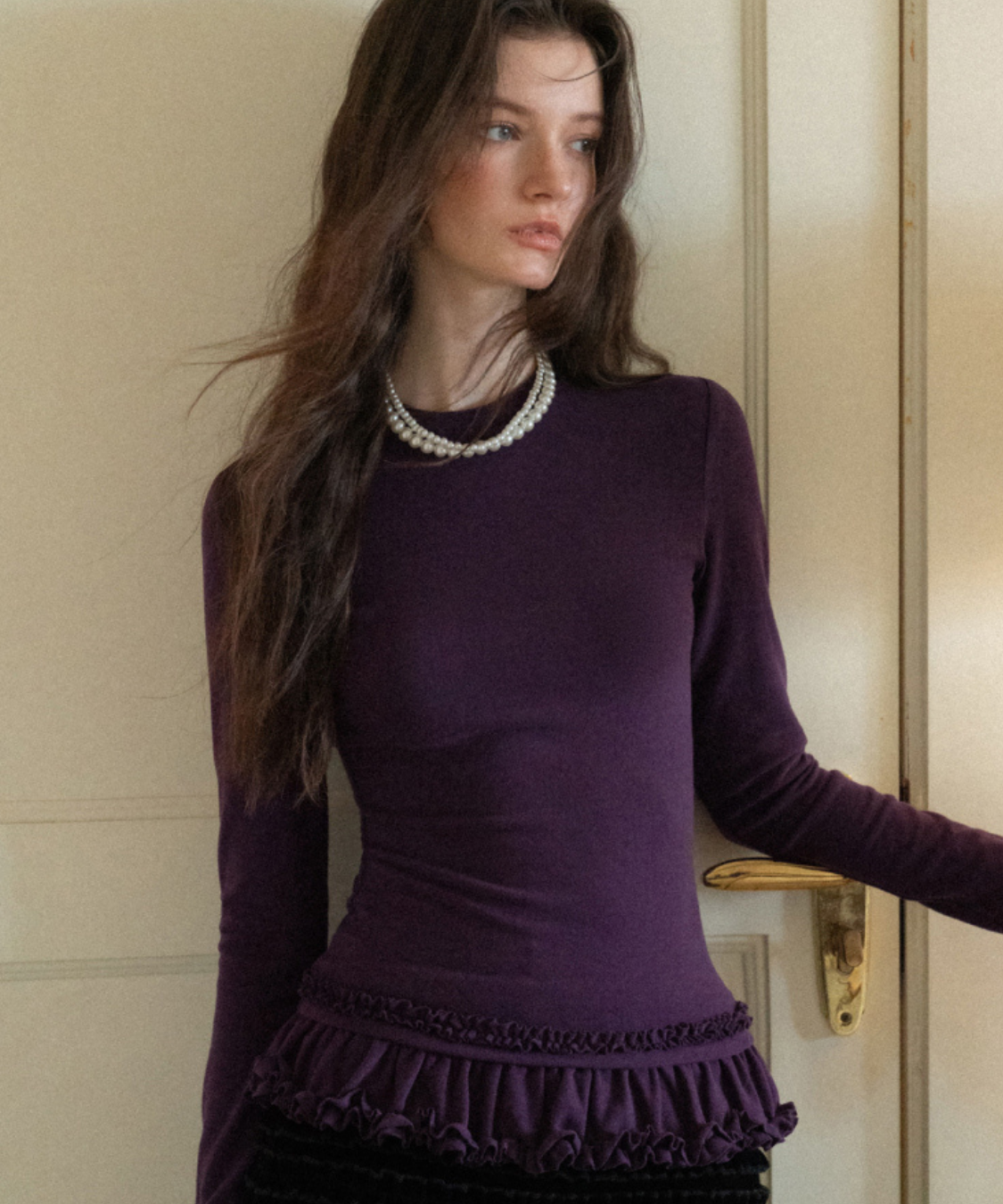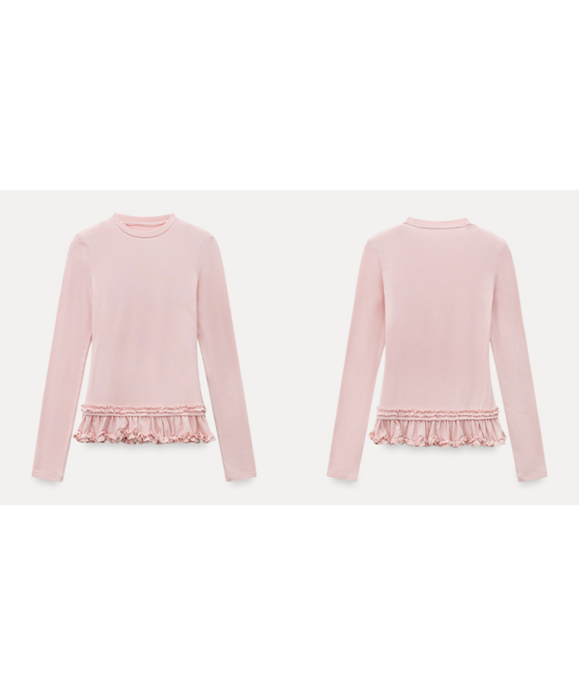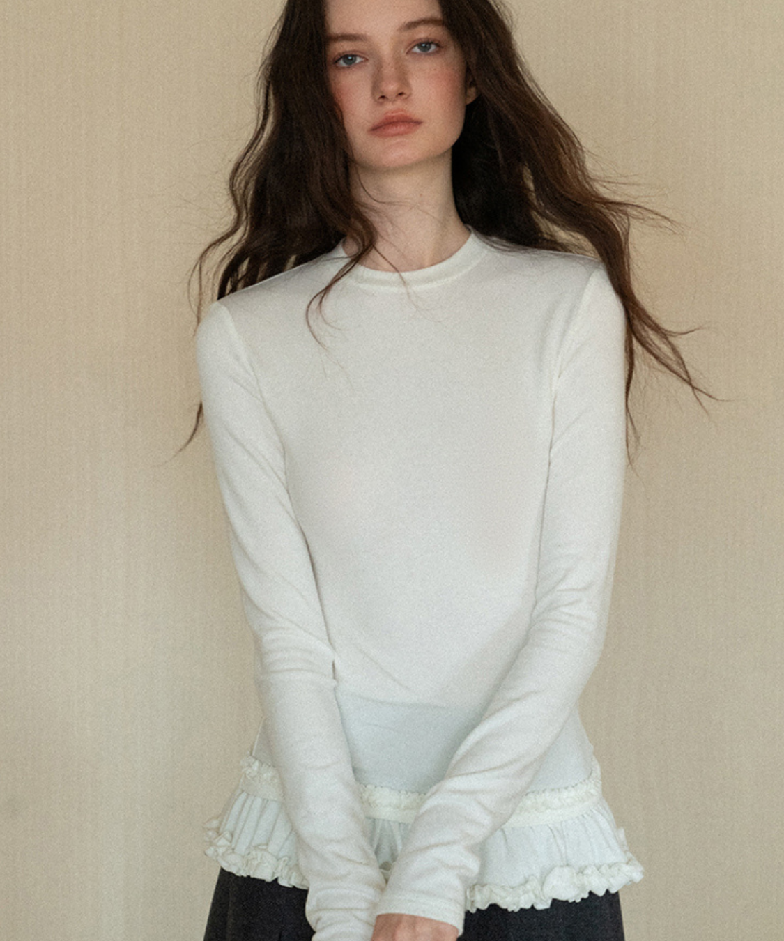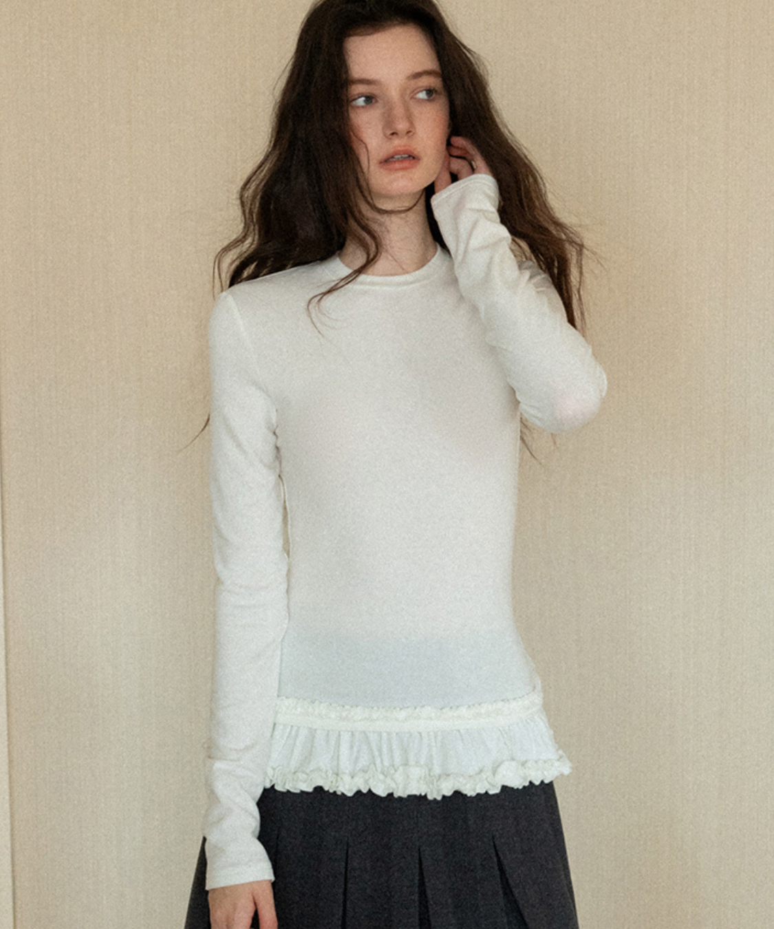裾のダブルフリルが目を引く、フェミニンムードたっぷりのカットソーです。