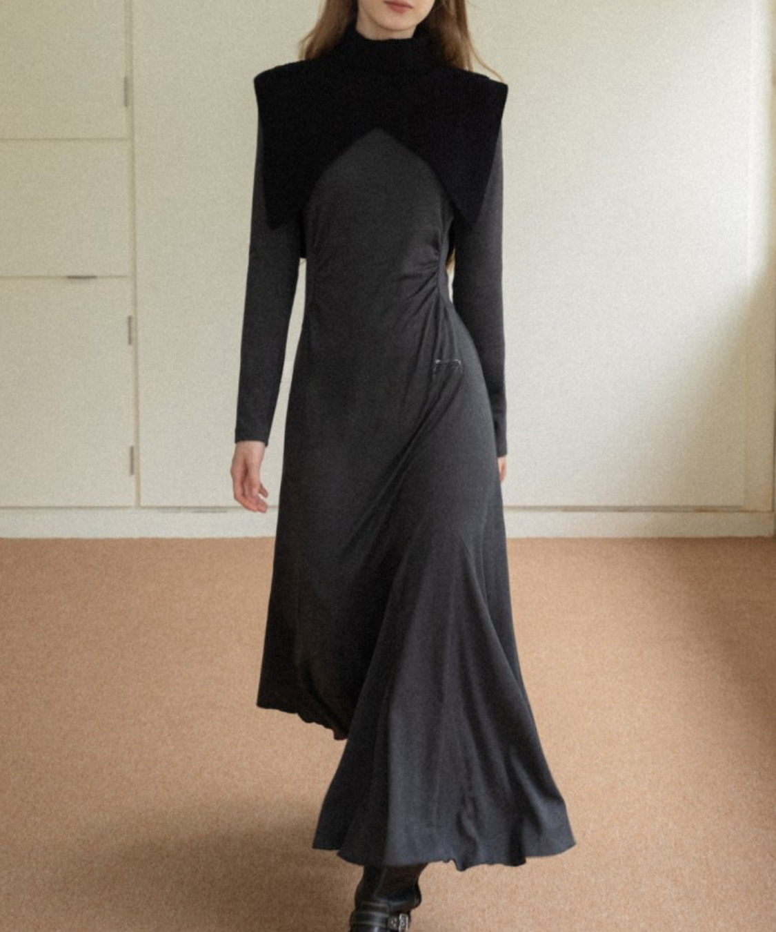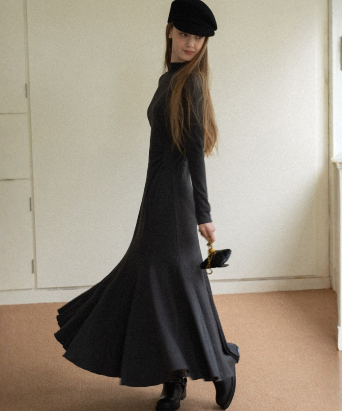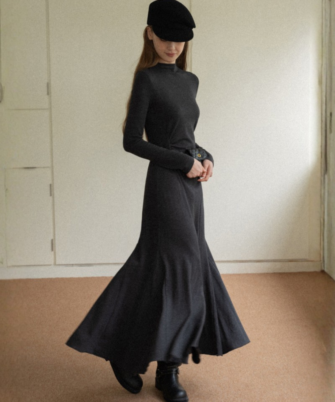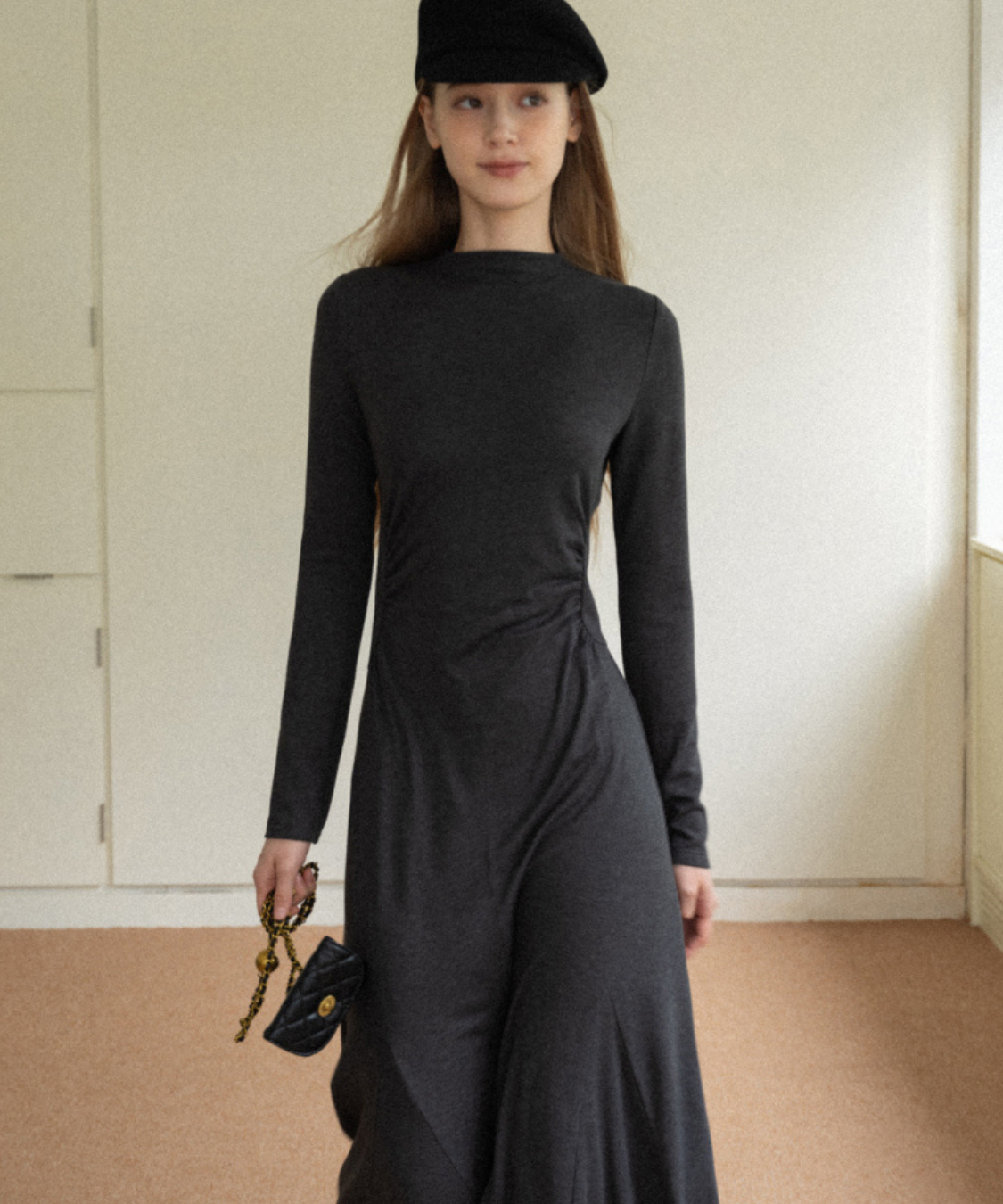 シンプルながらも洗練された印象を与えるモックネックデザインのワンピースです。