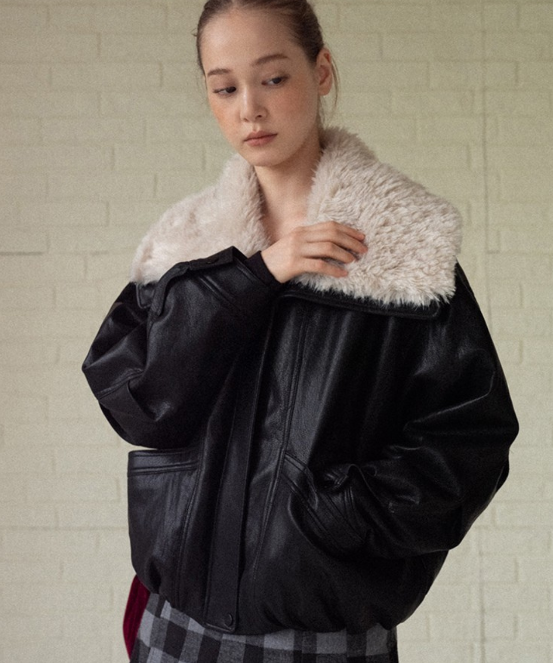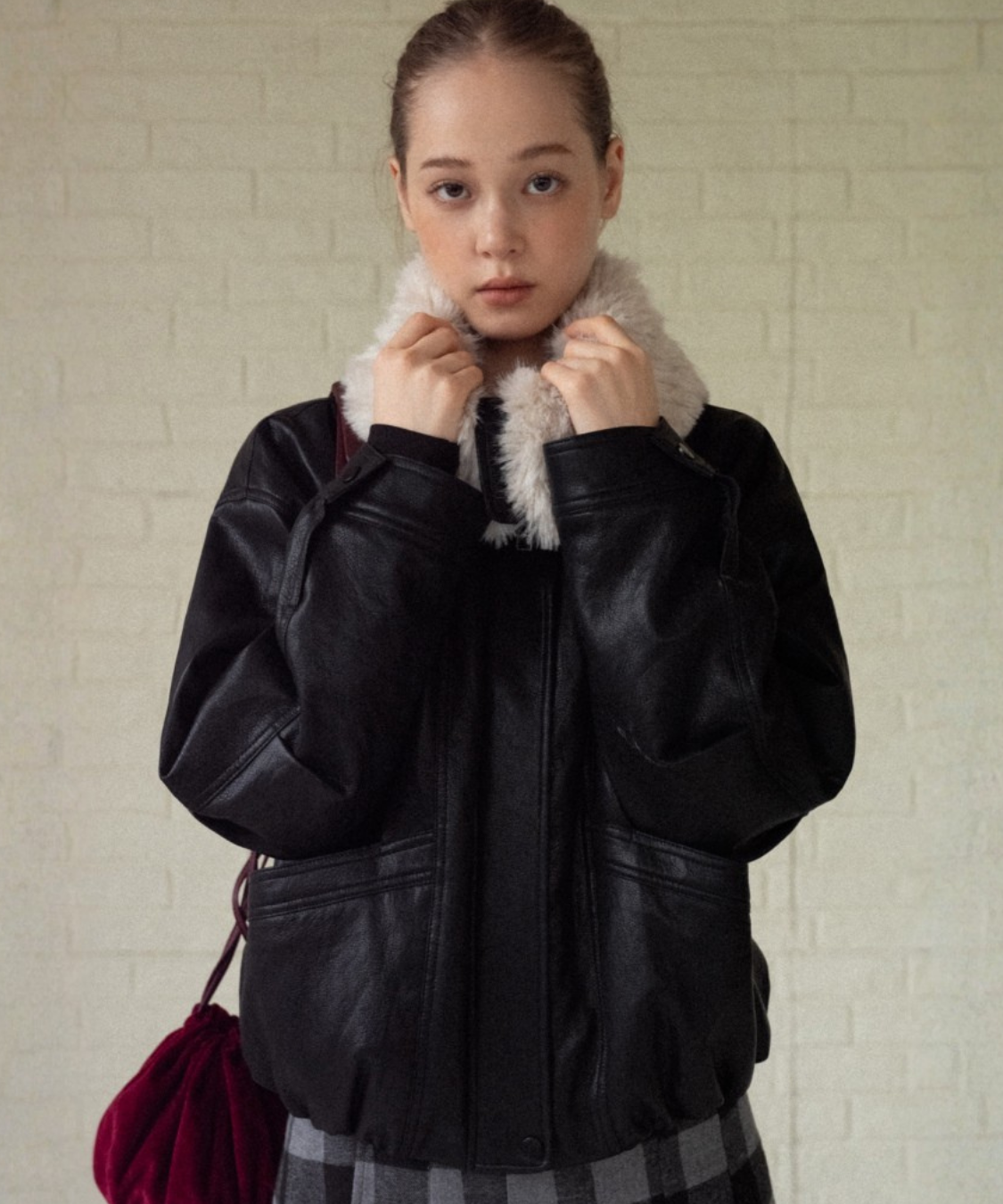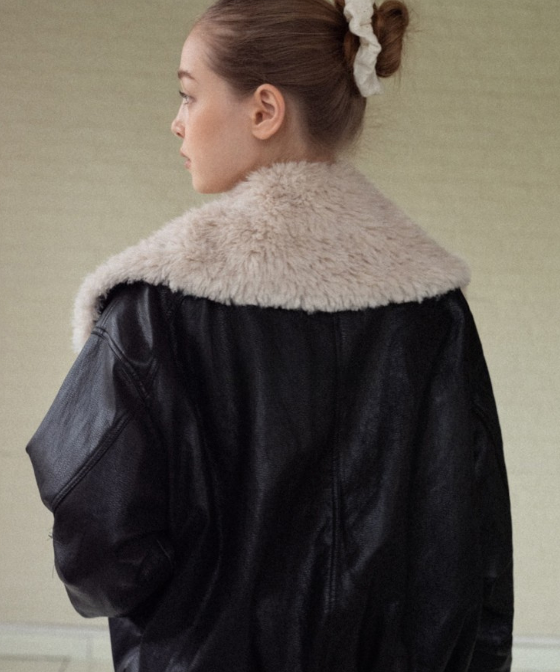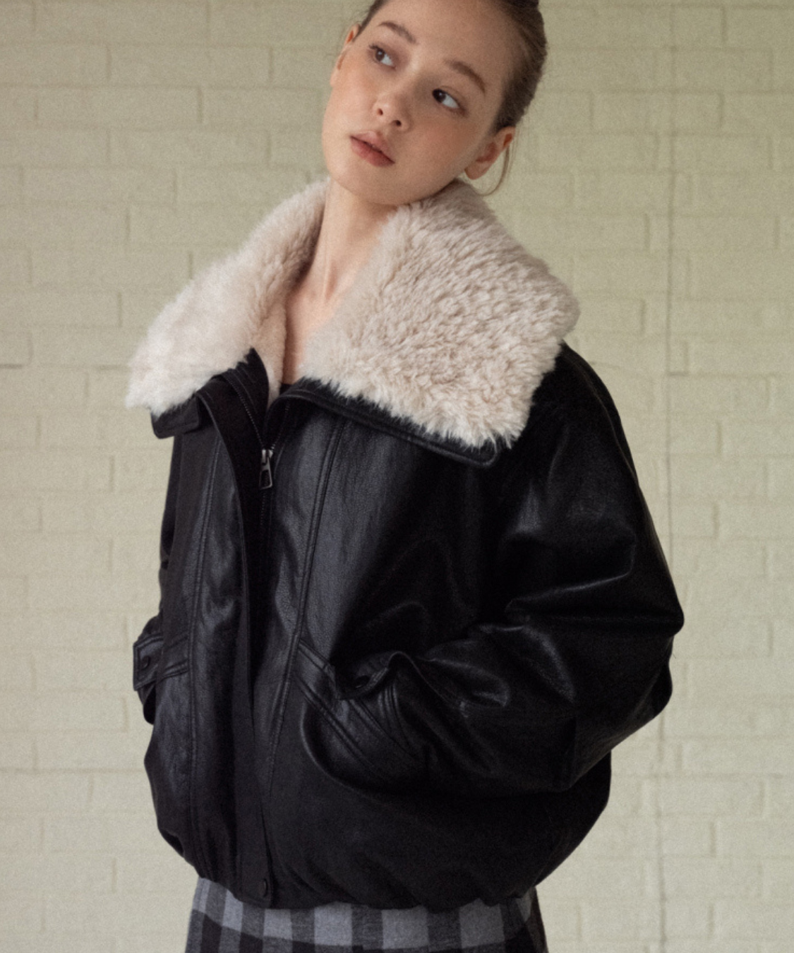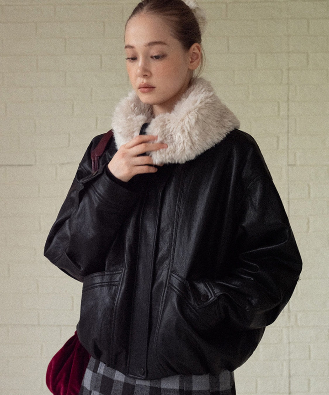 たっぷりとしたボリュームのボアカラーが目を惹くフェイクレザージャケットです。