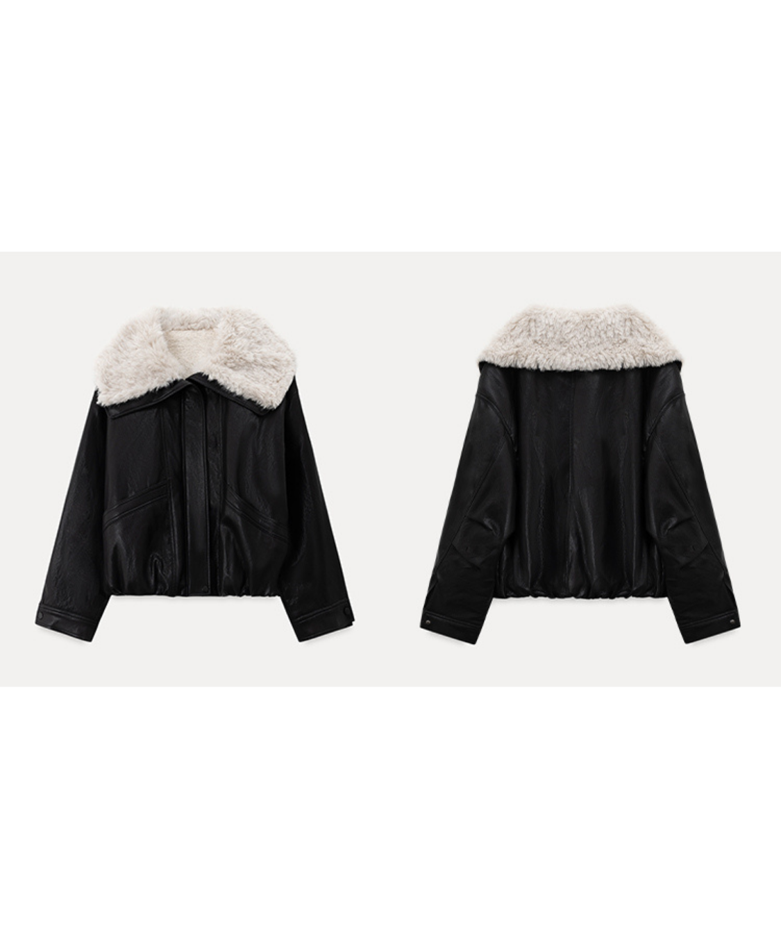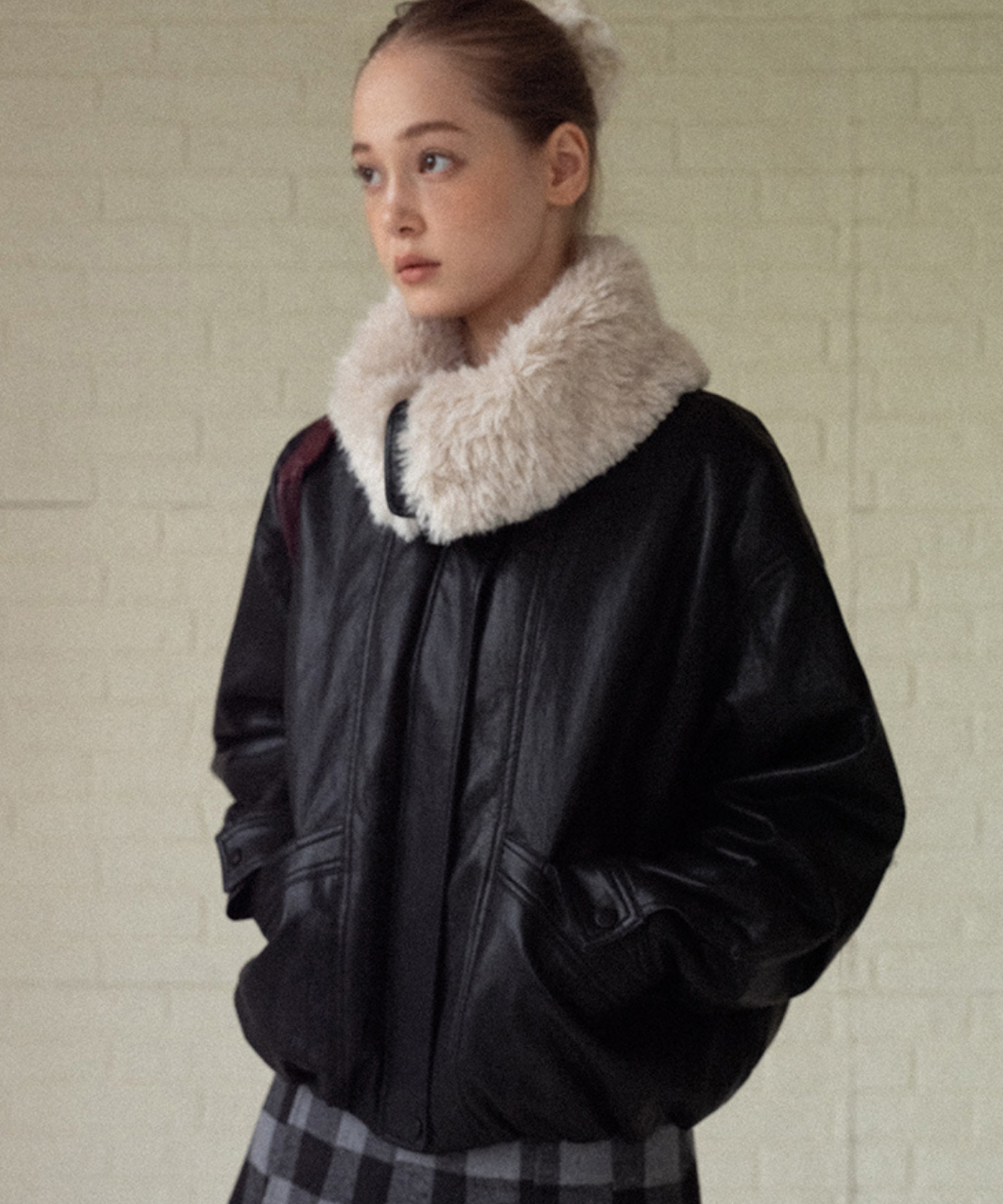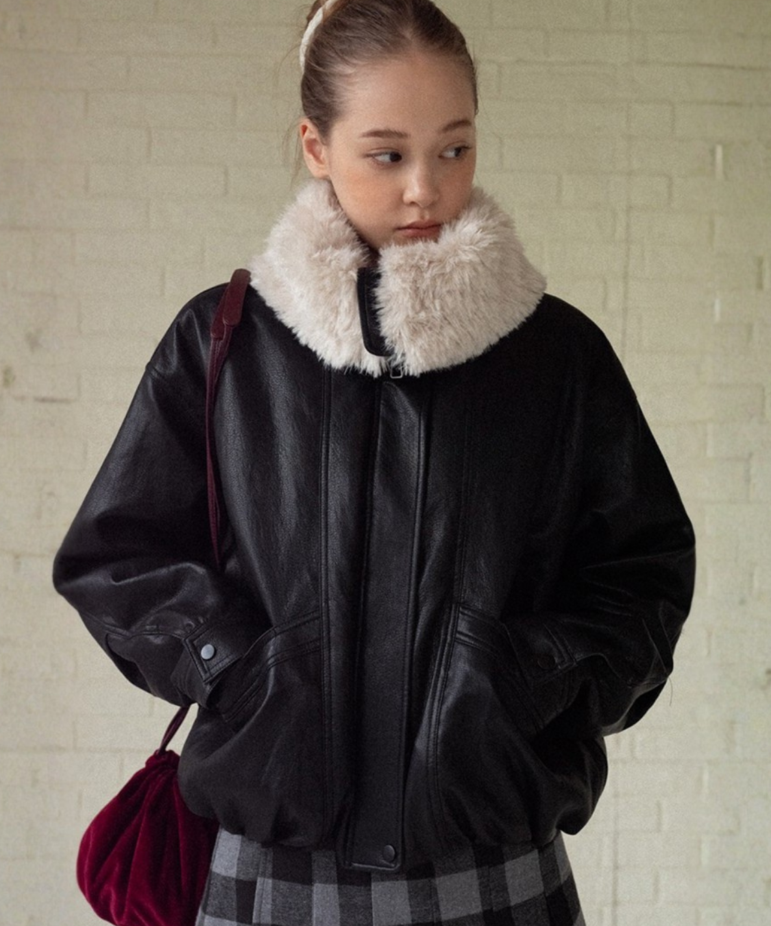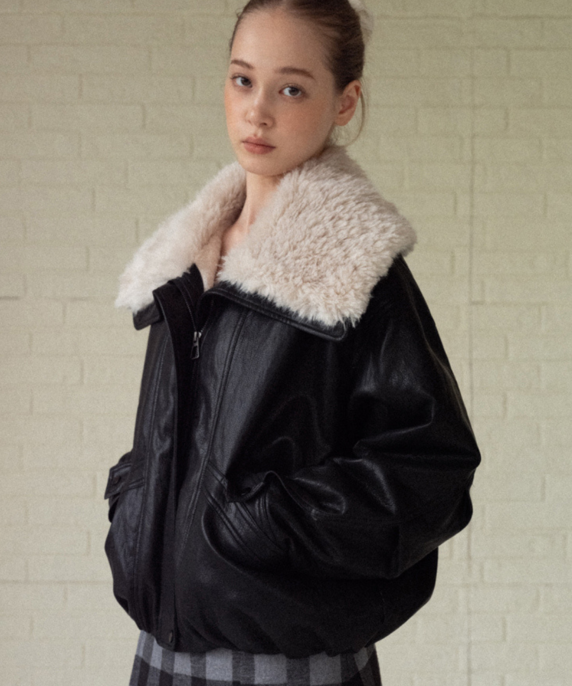 たっぷりとしたボリュームのボアカラーが目を惹くフェイクレザージャケットです。