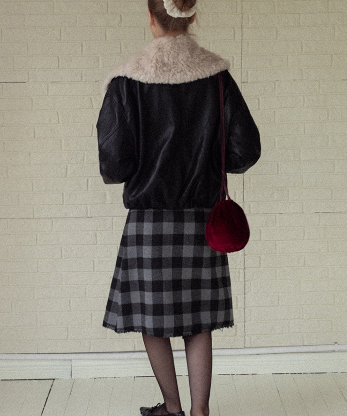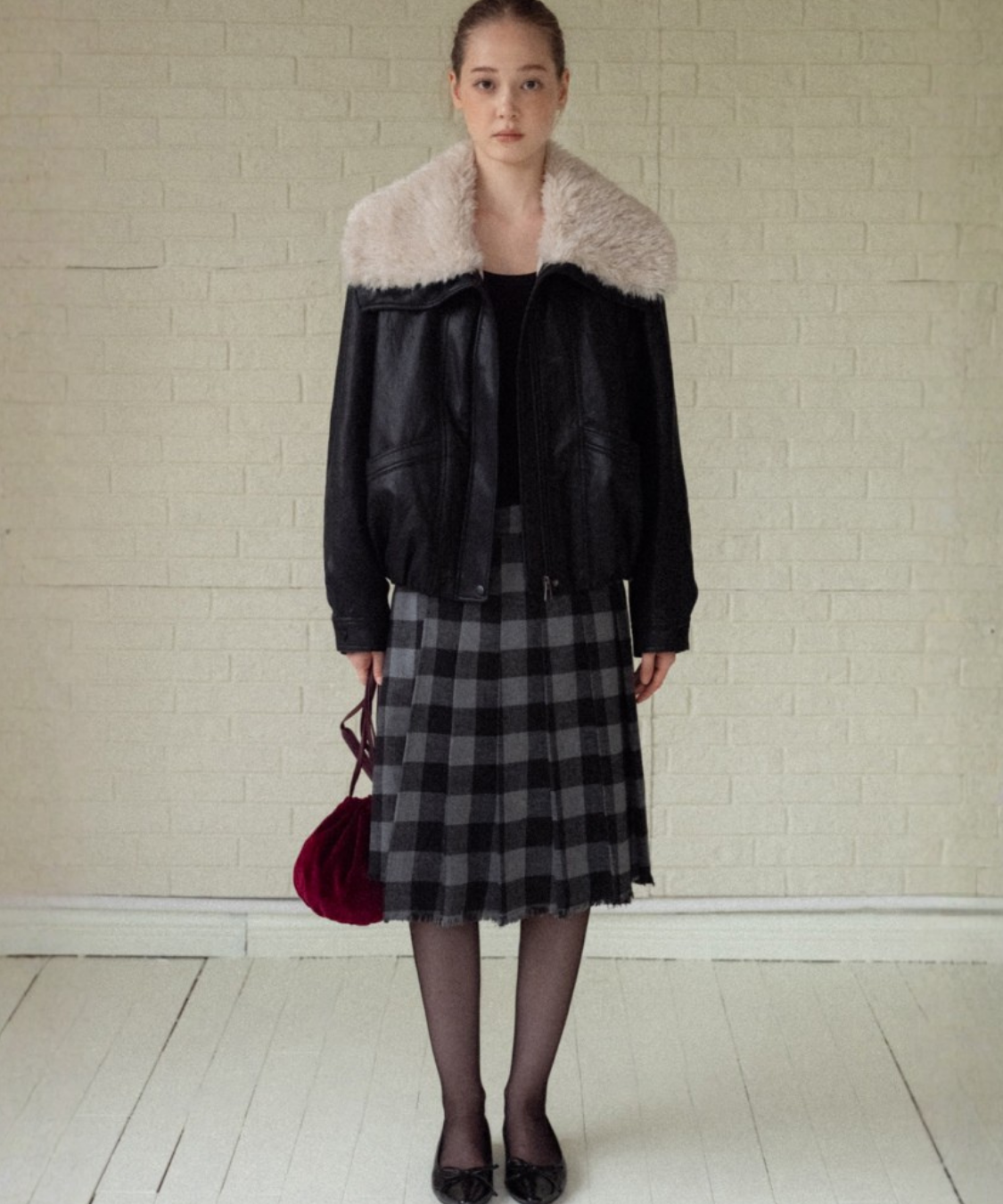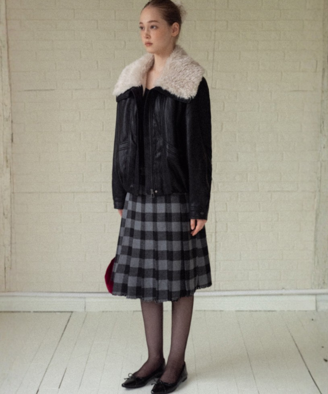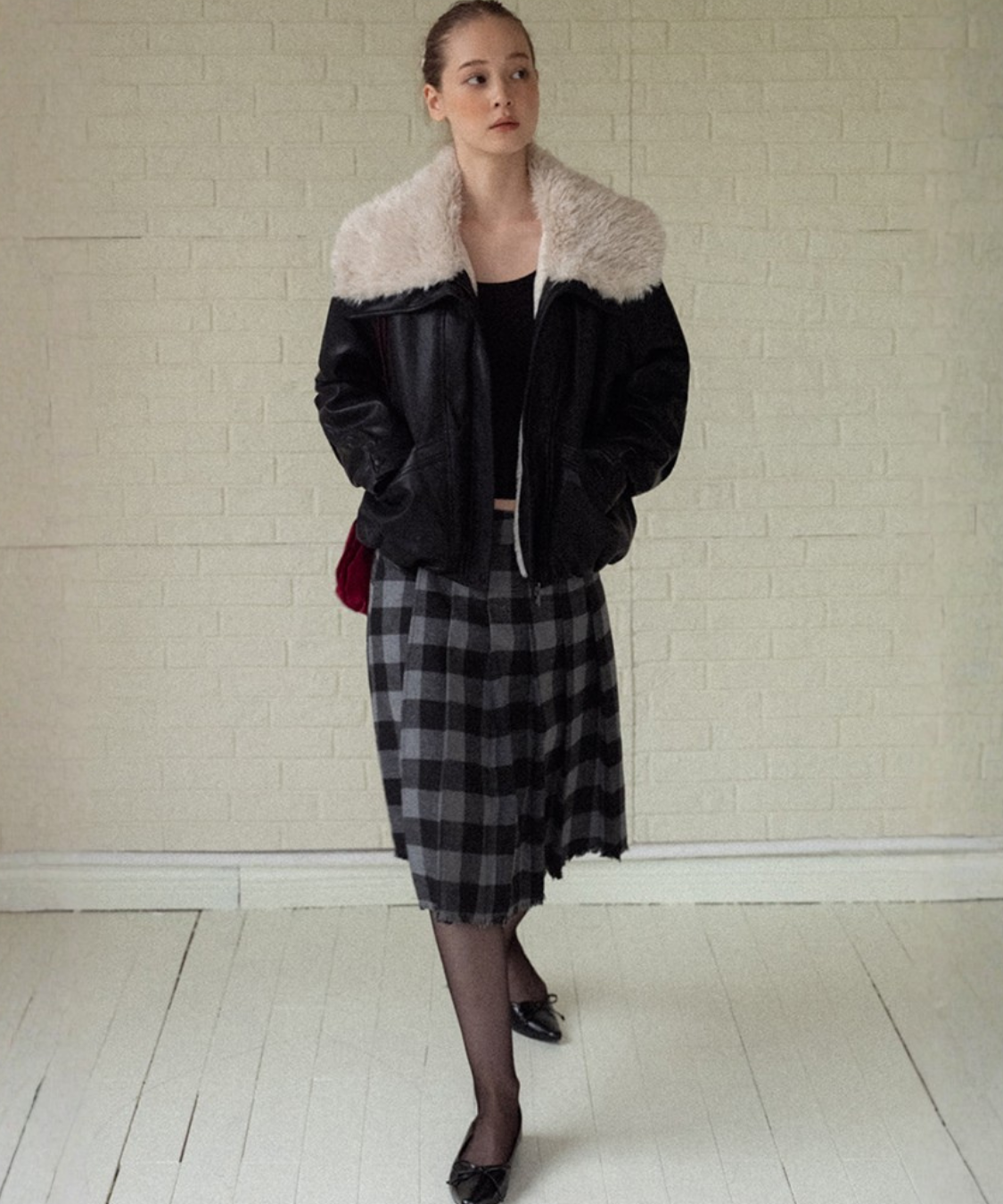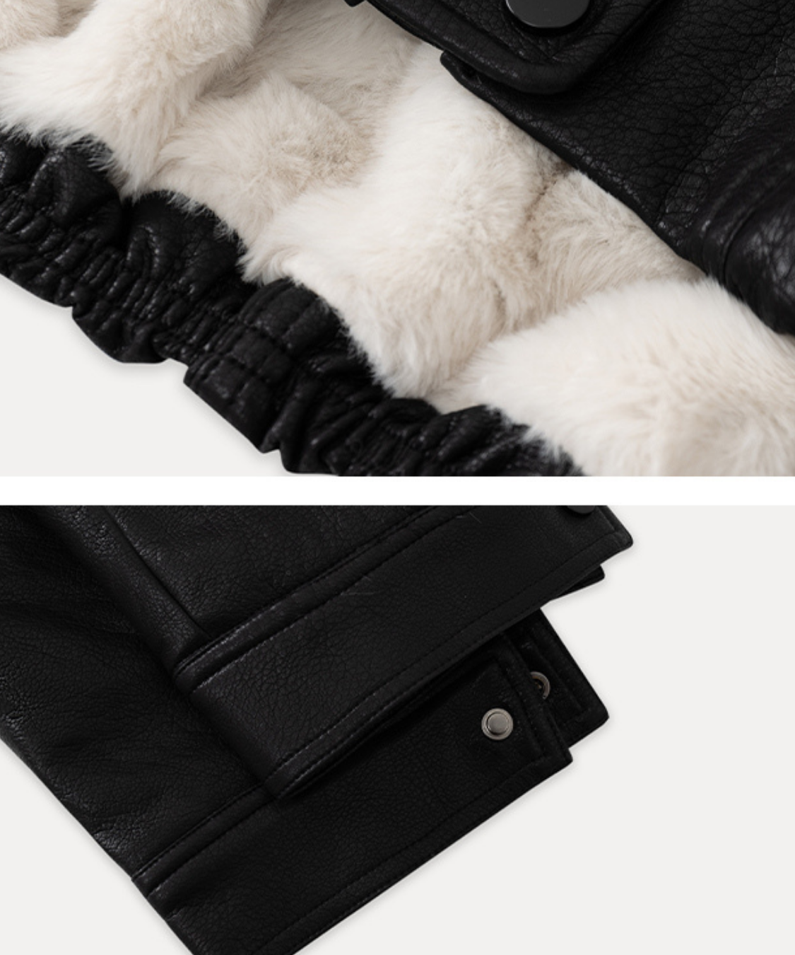 たっぷりとしたボリュームのボアカラーが目を惹くフェイクレザージャケットです。