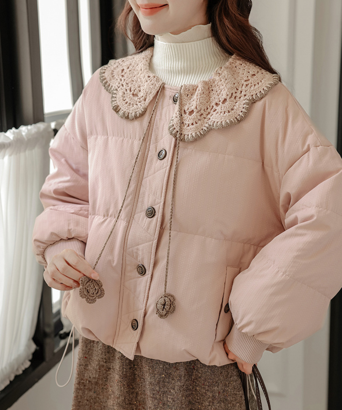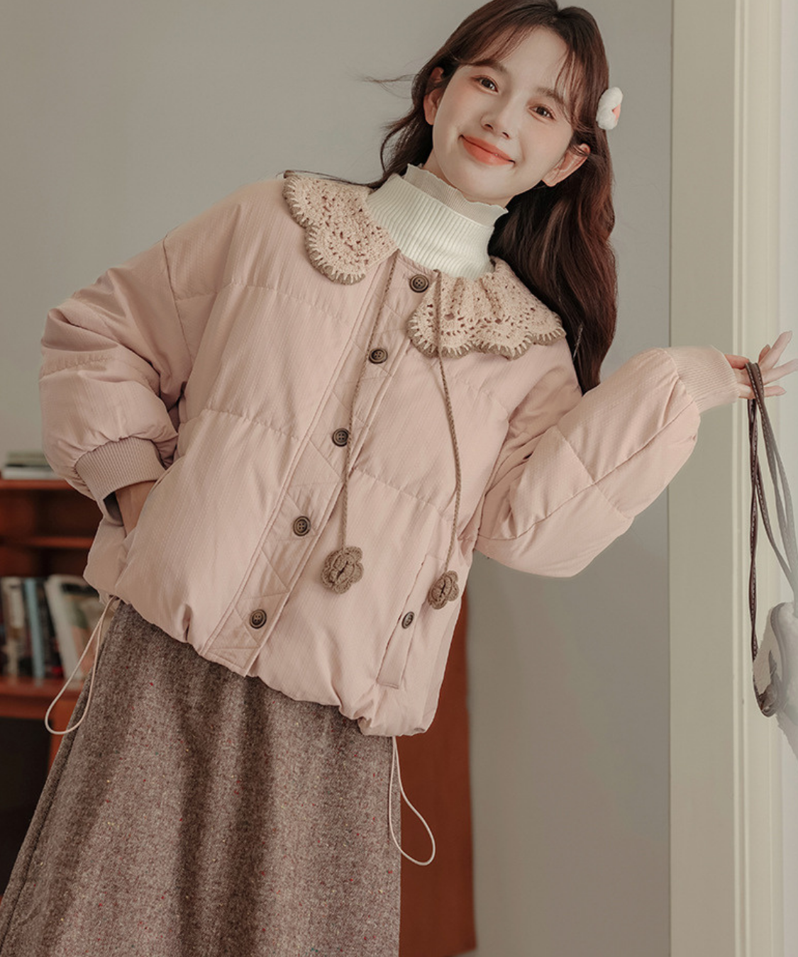 かぎ編み風のスカラップ襟がクラシカルな雰囲気を演出するカーディガンです。