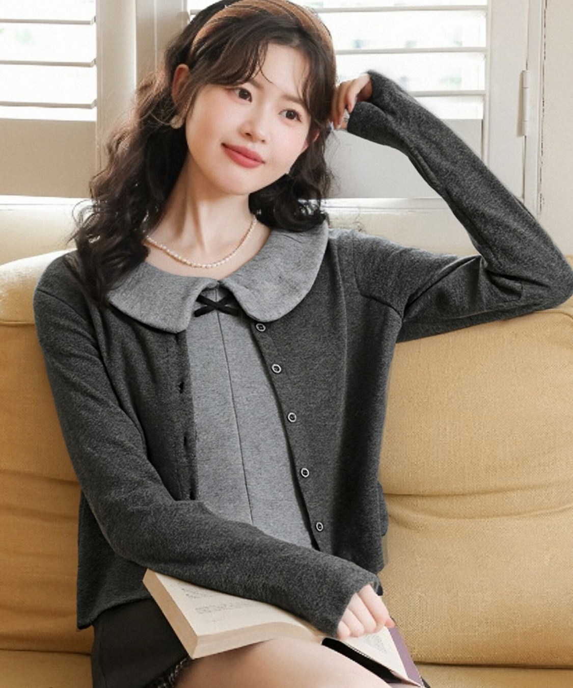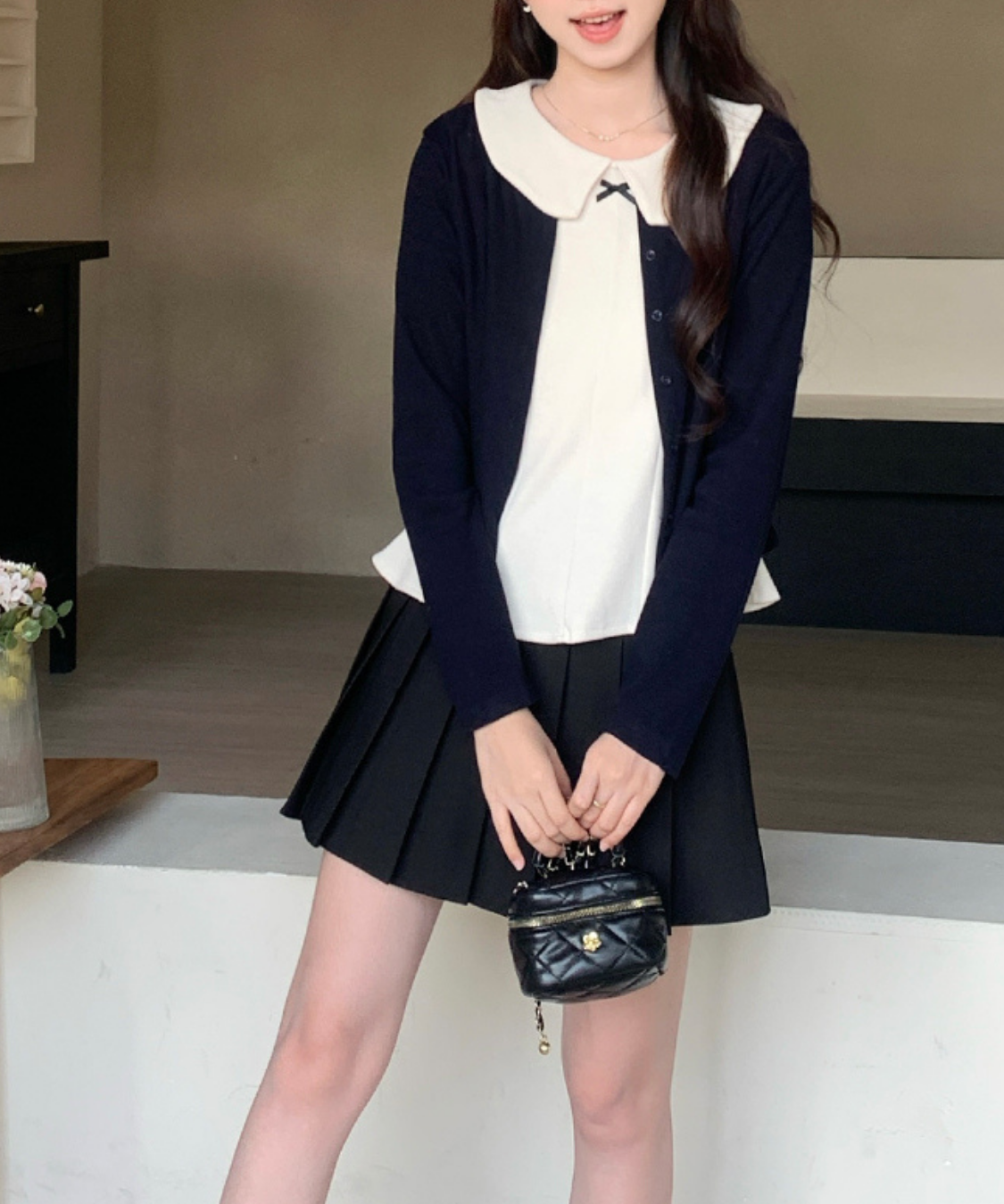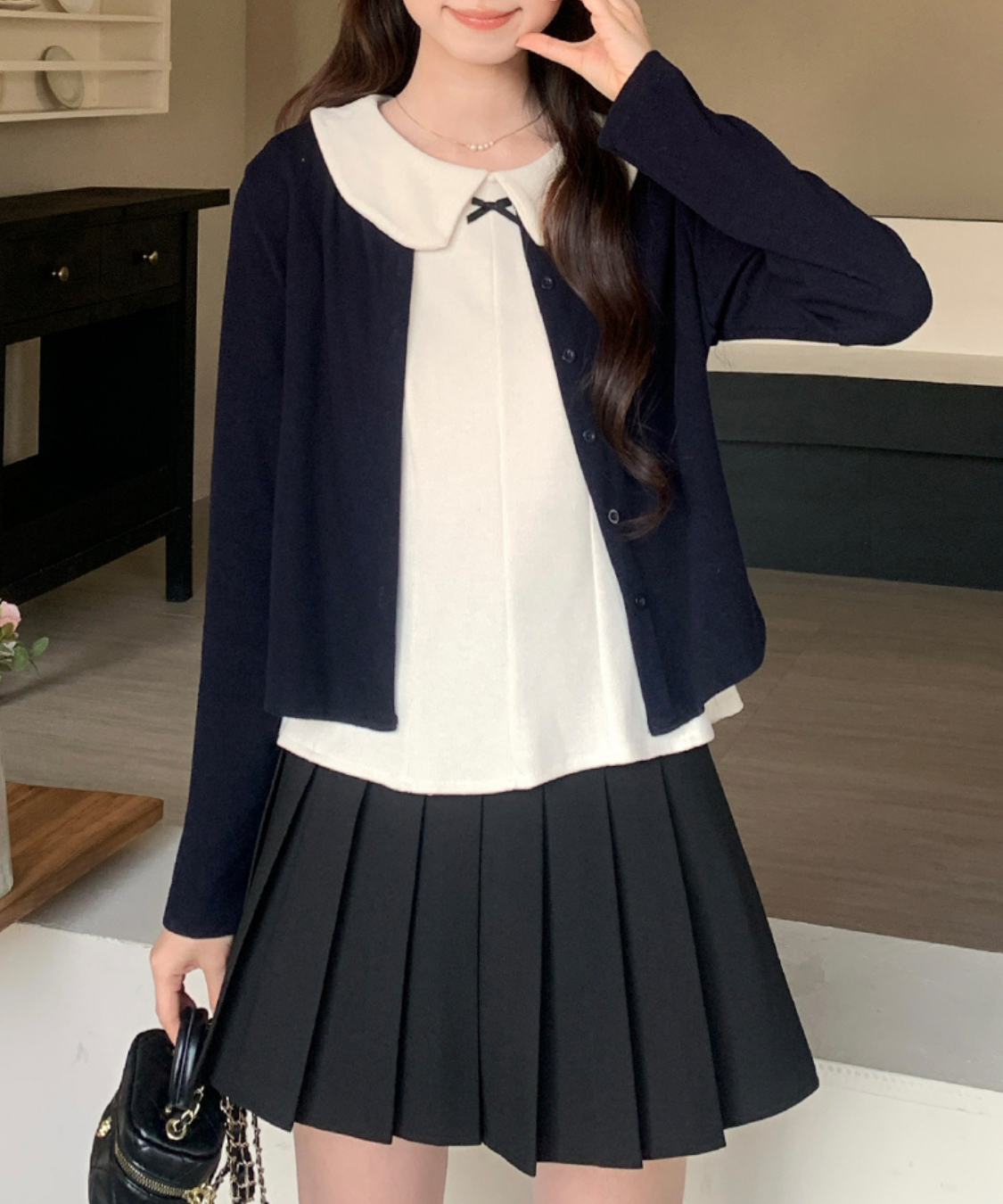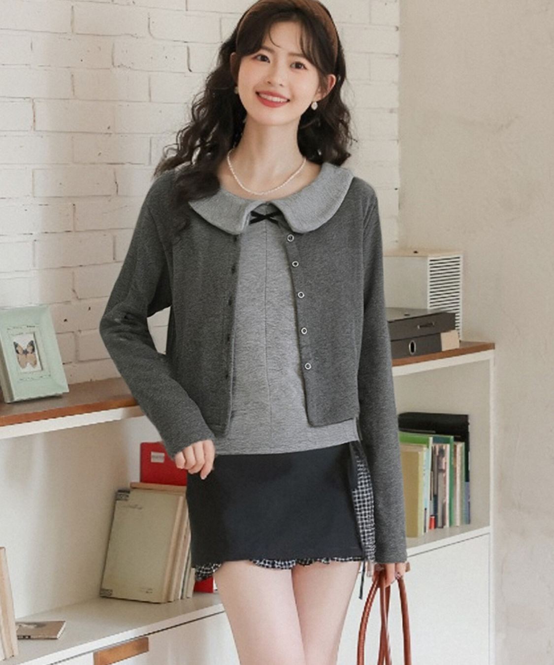 丸襟とさりげないリボンがポイントのノースリーブトップスと、カーディガンのセットです。