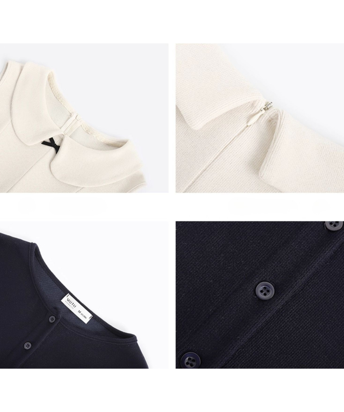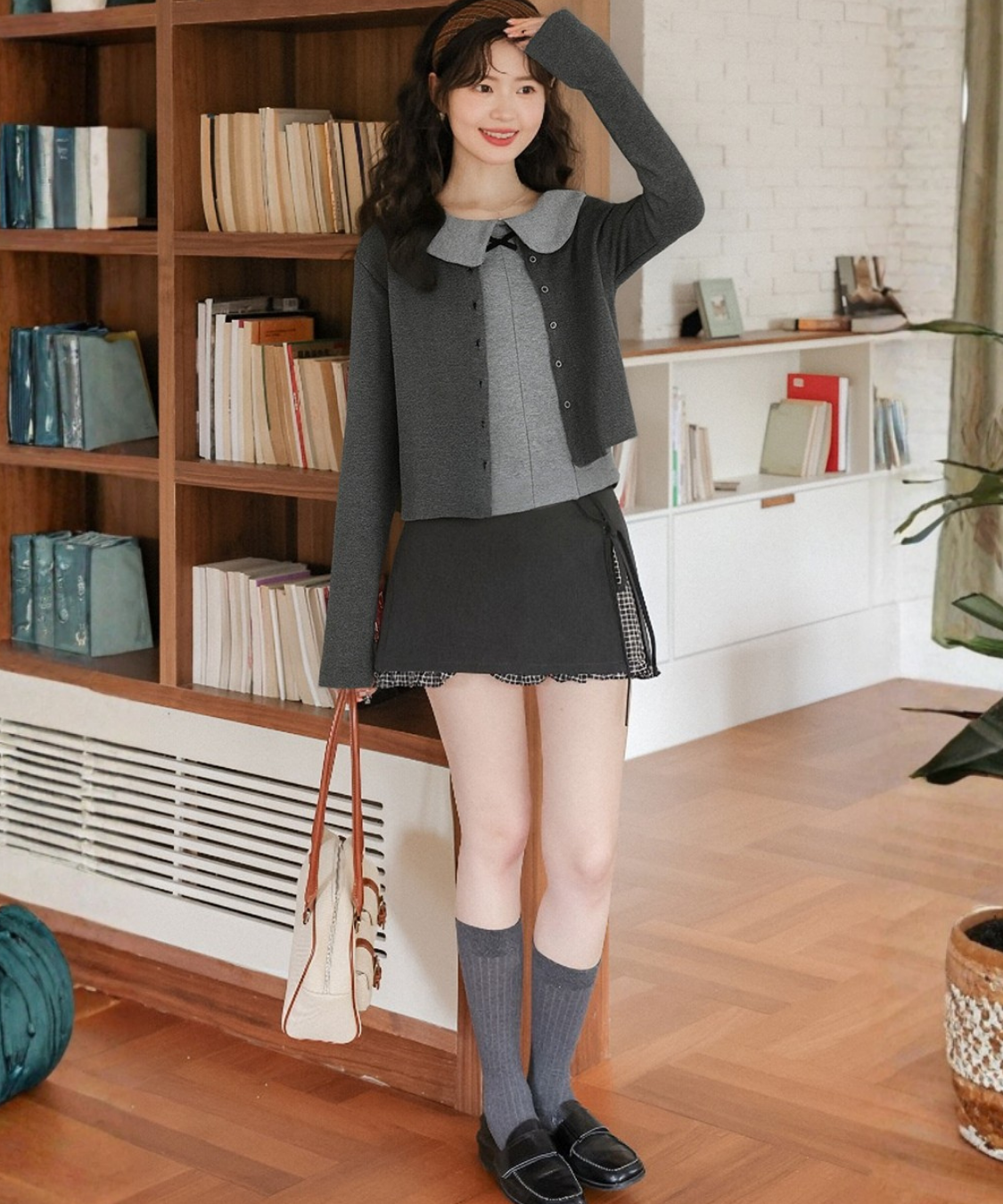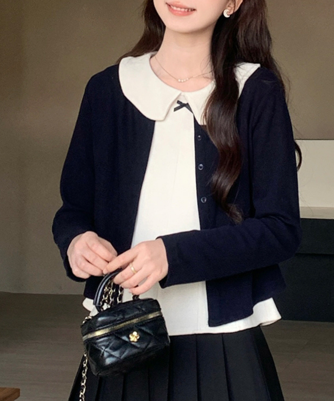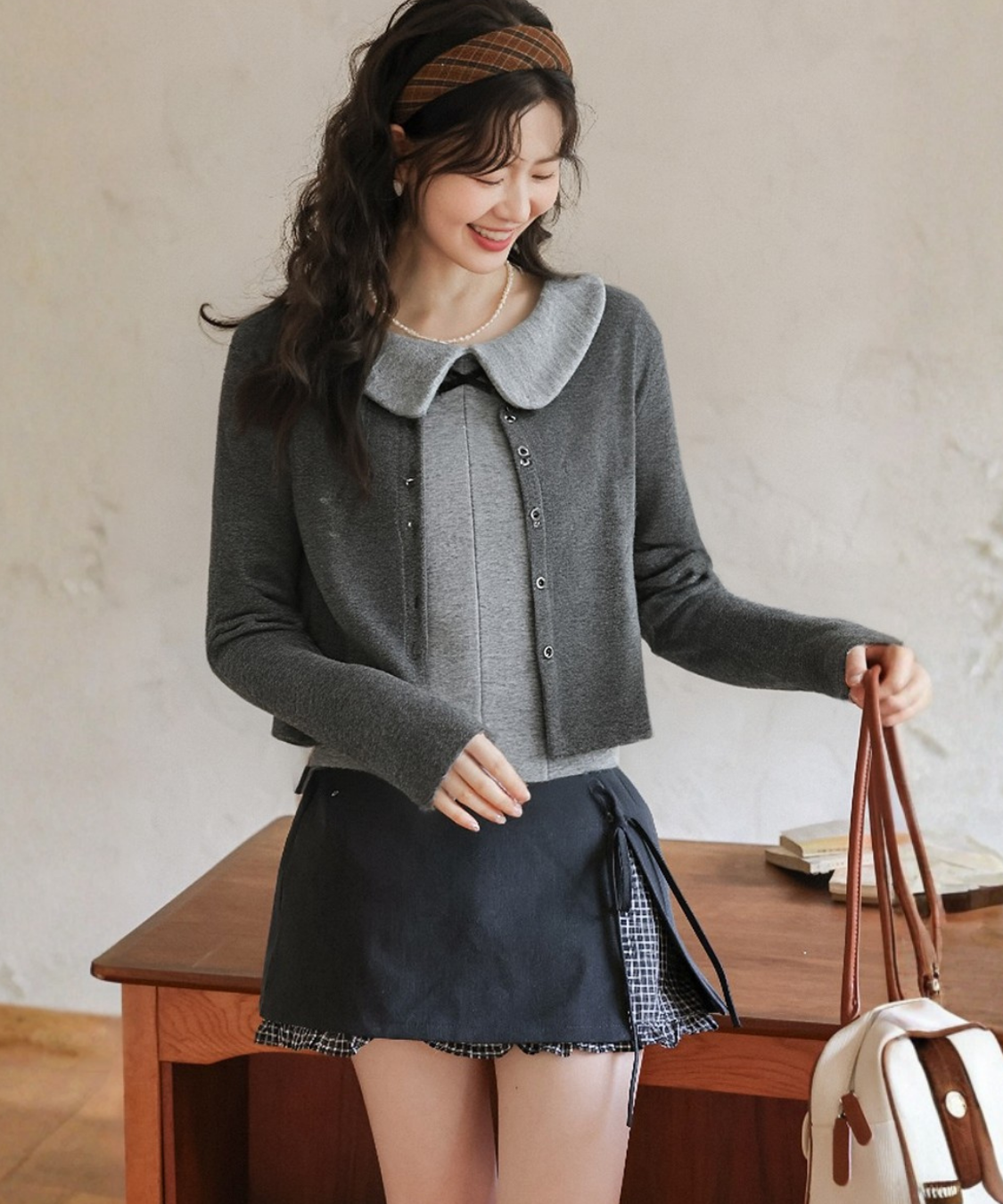 丸襟とさりげないリボンがポイントのノースリーブトップスと、カーディガンのセットです。