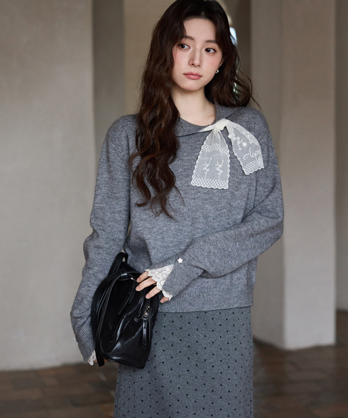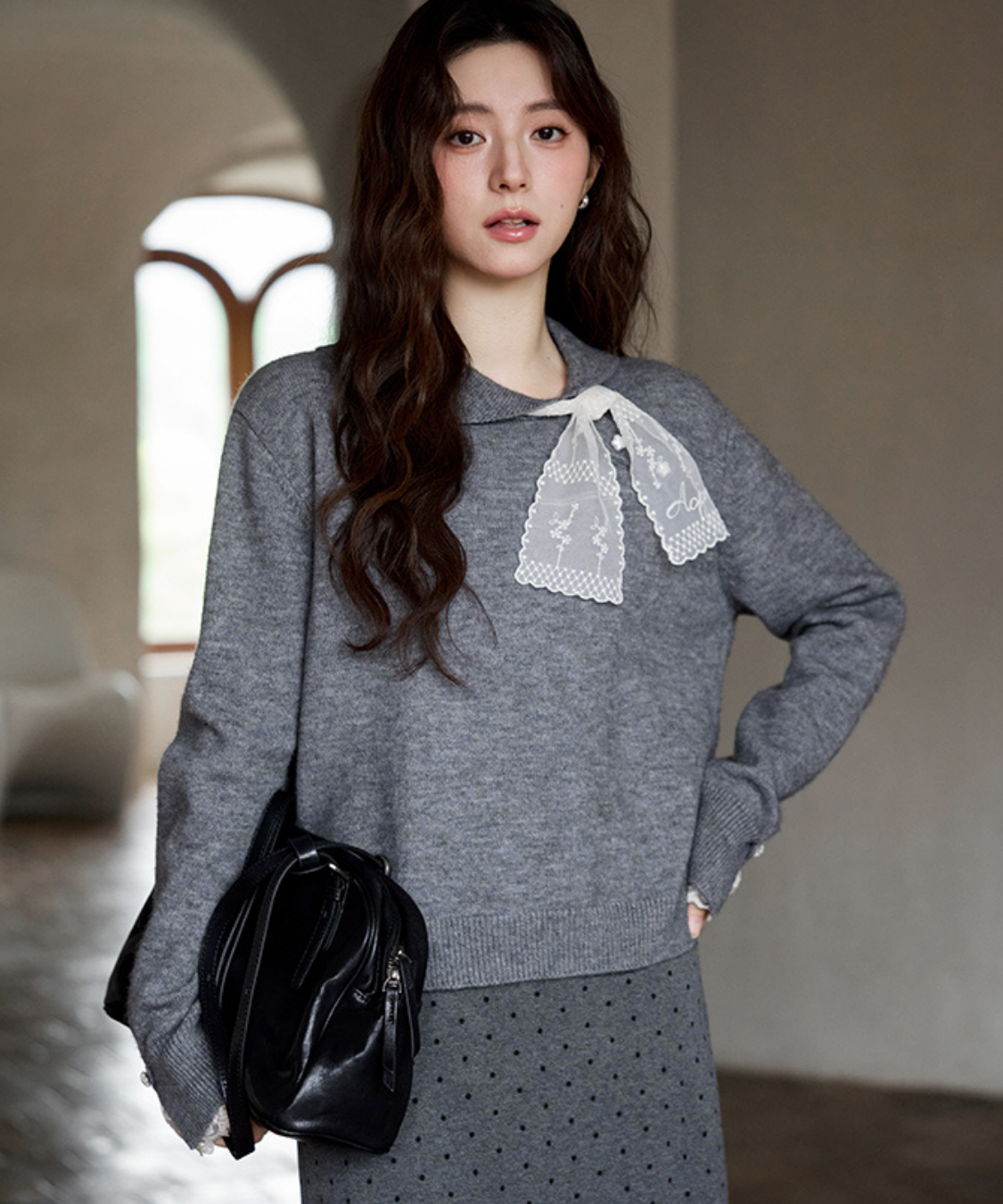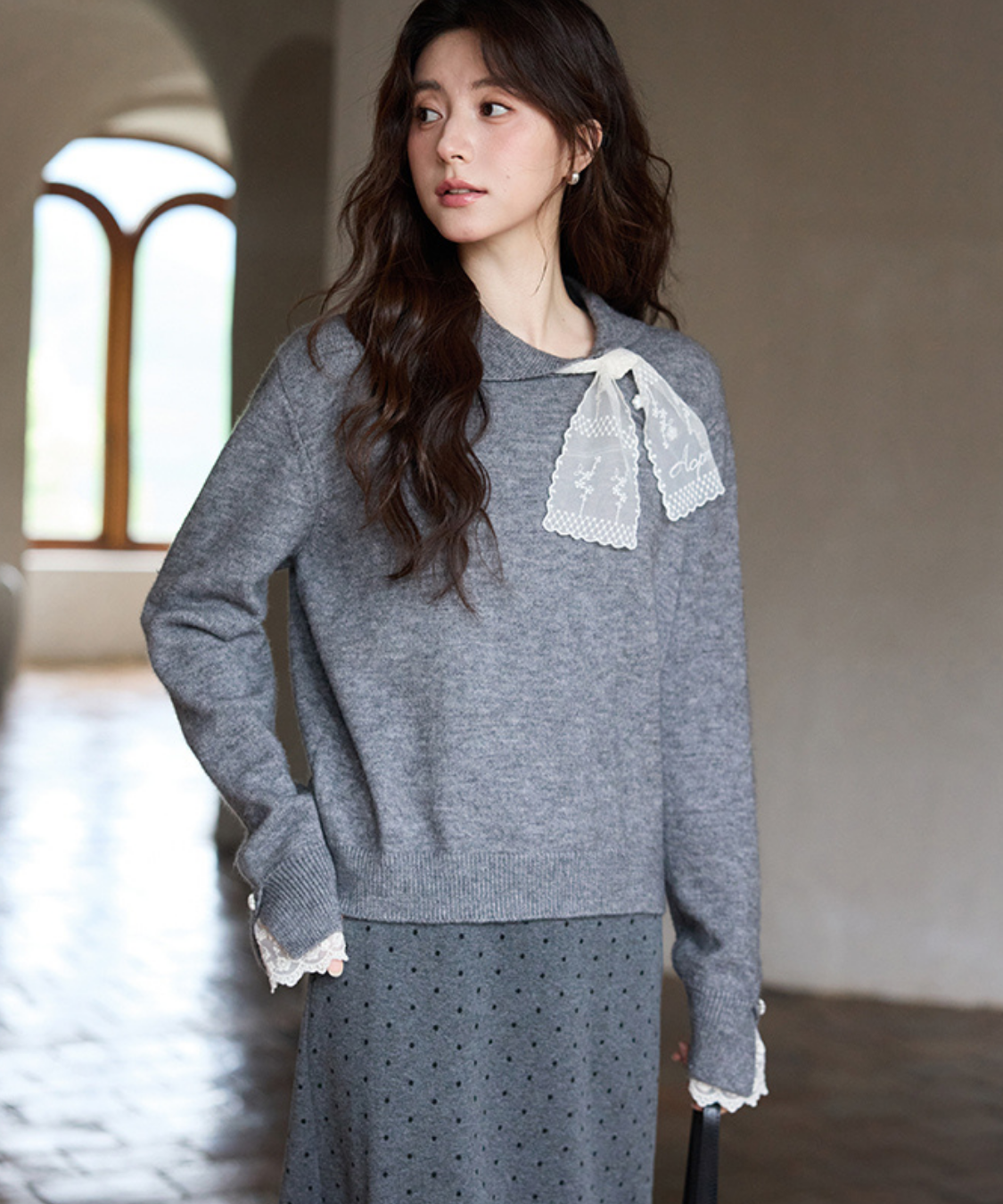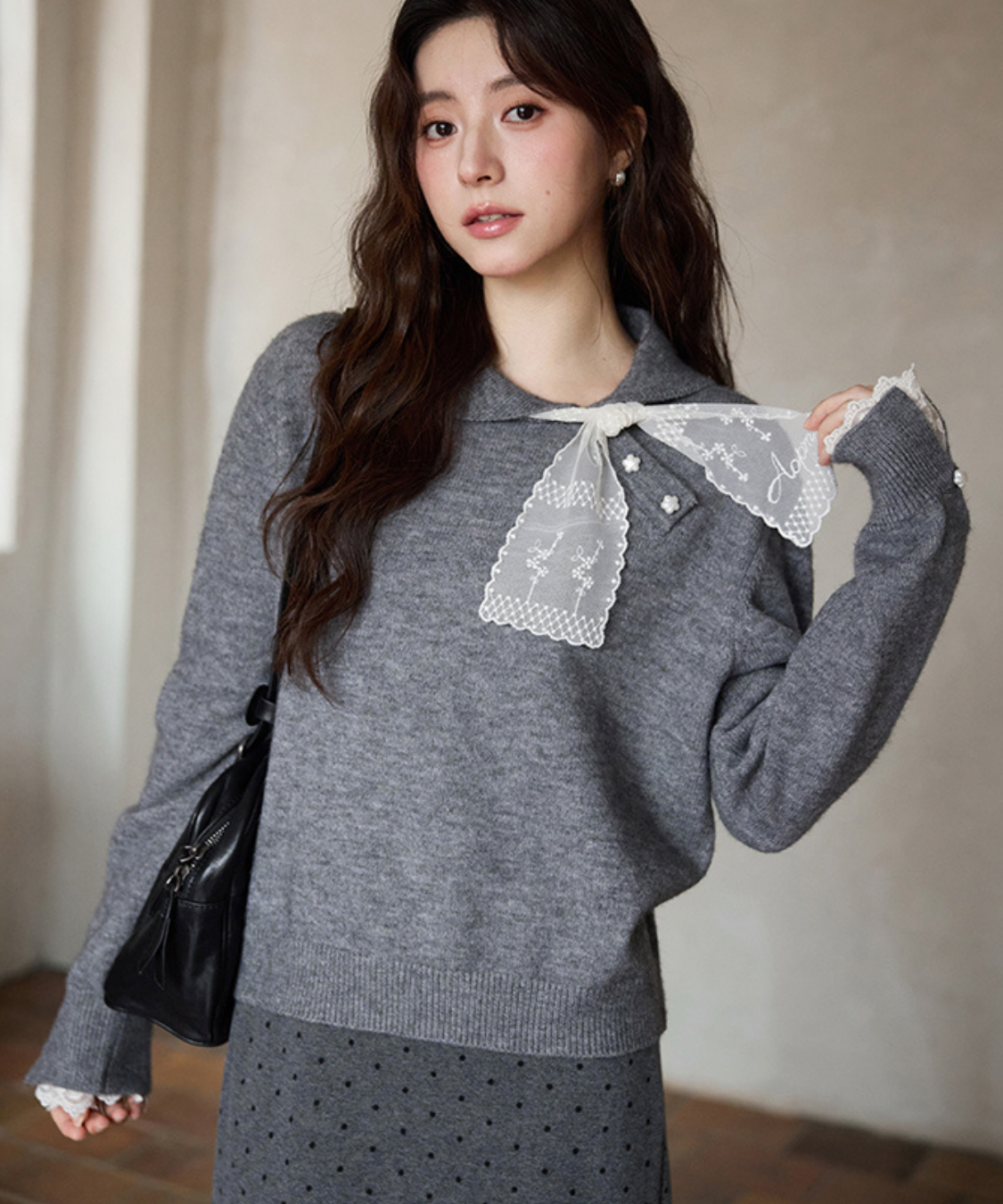 繊細なレーススカーフが首元を華やかに彩るフェミニンなニットトップスです。