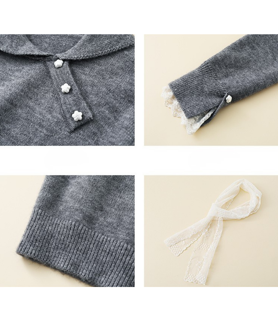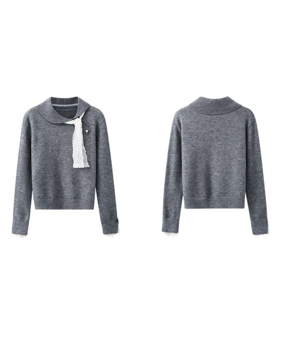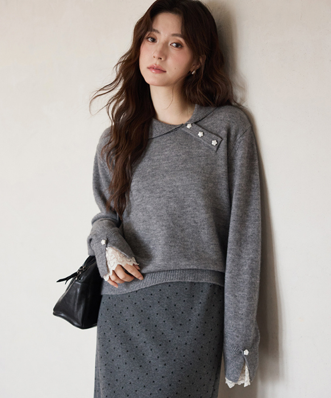 繊細なレーススカーフが首元を華やかに彩るフェミニンなニットトップスです。