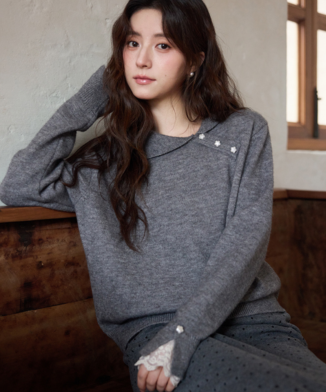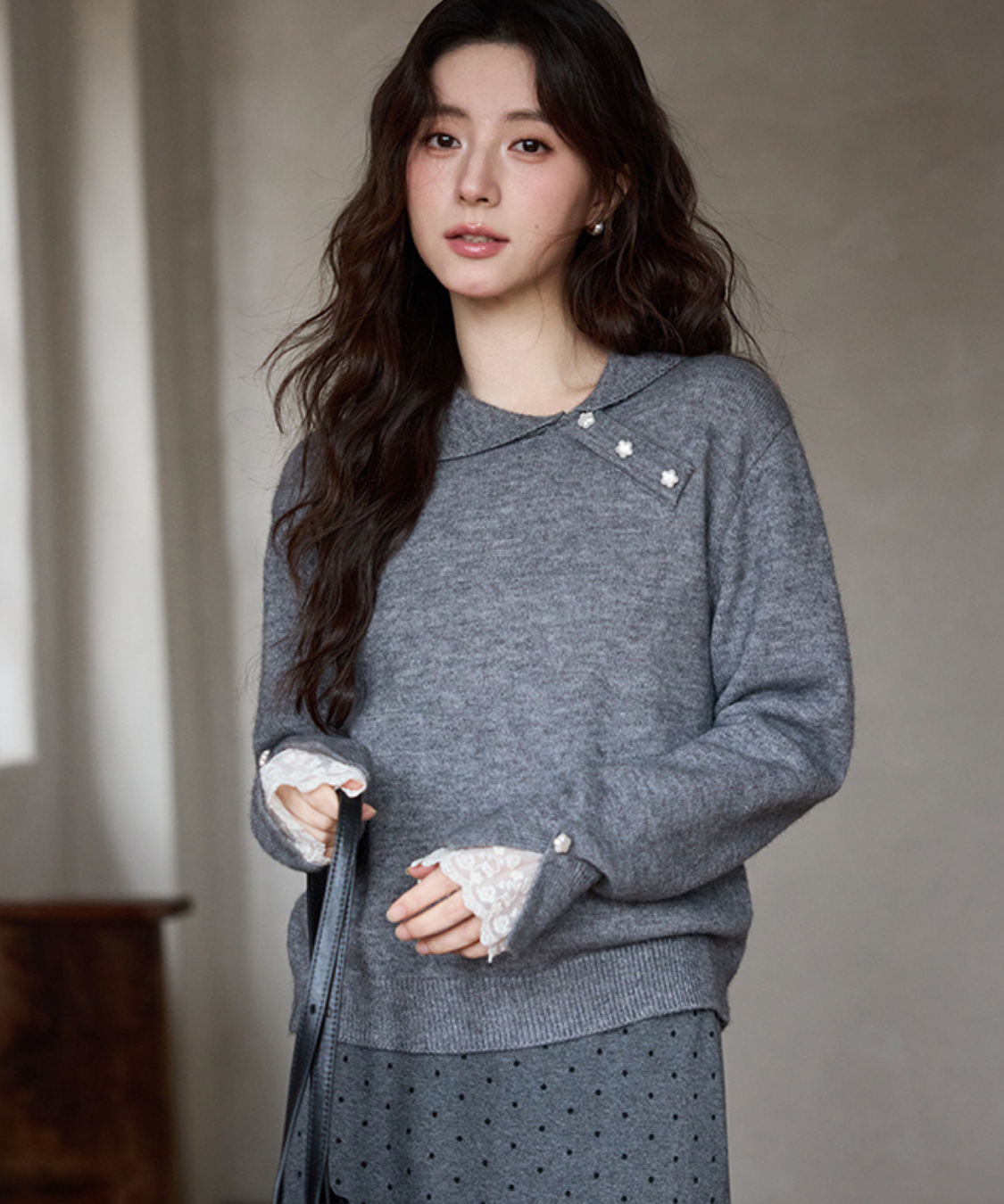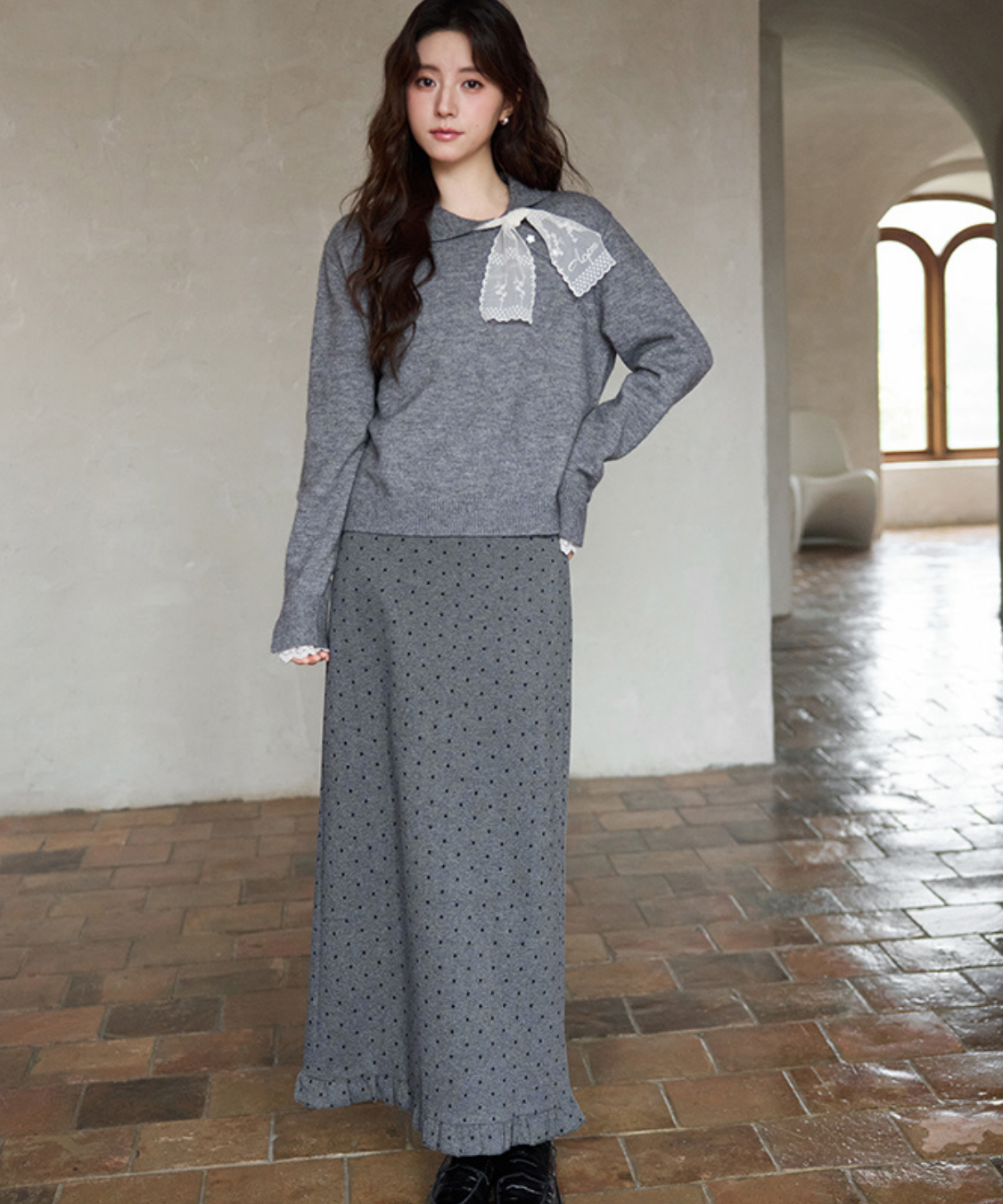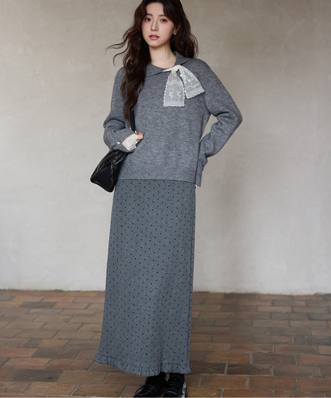 繊細なレーススカーフが首元を華やかに彩るフェミニンなニットトップスです。