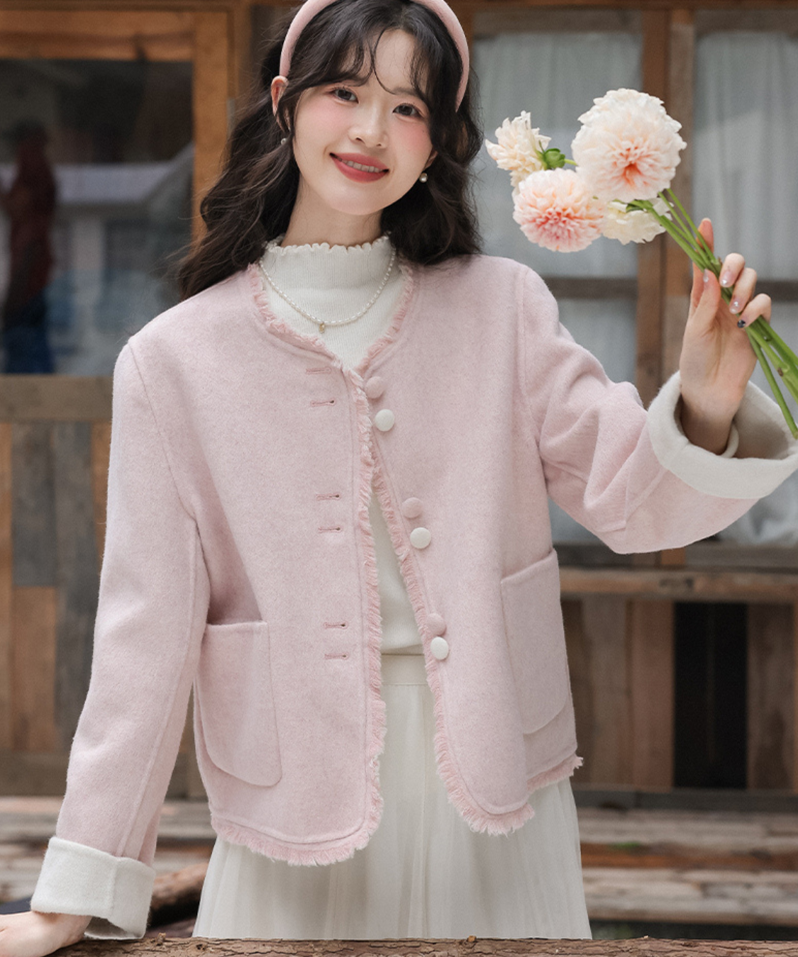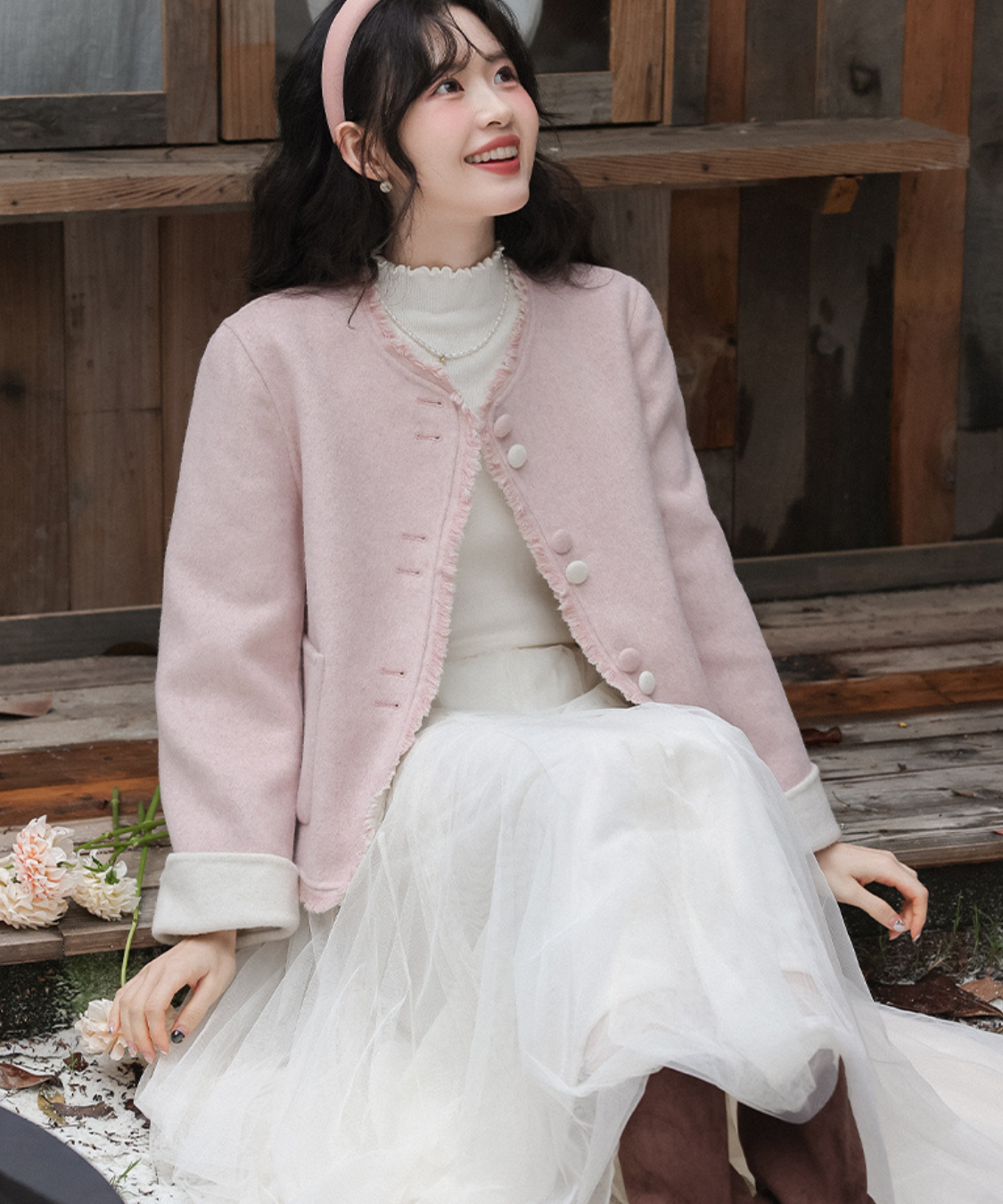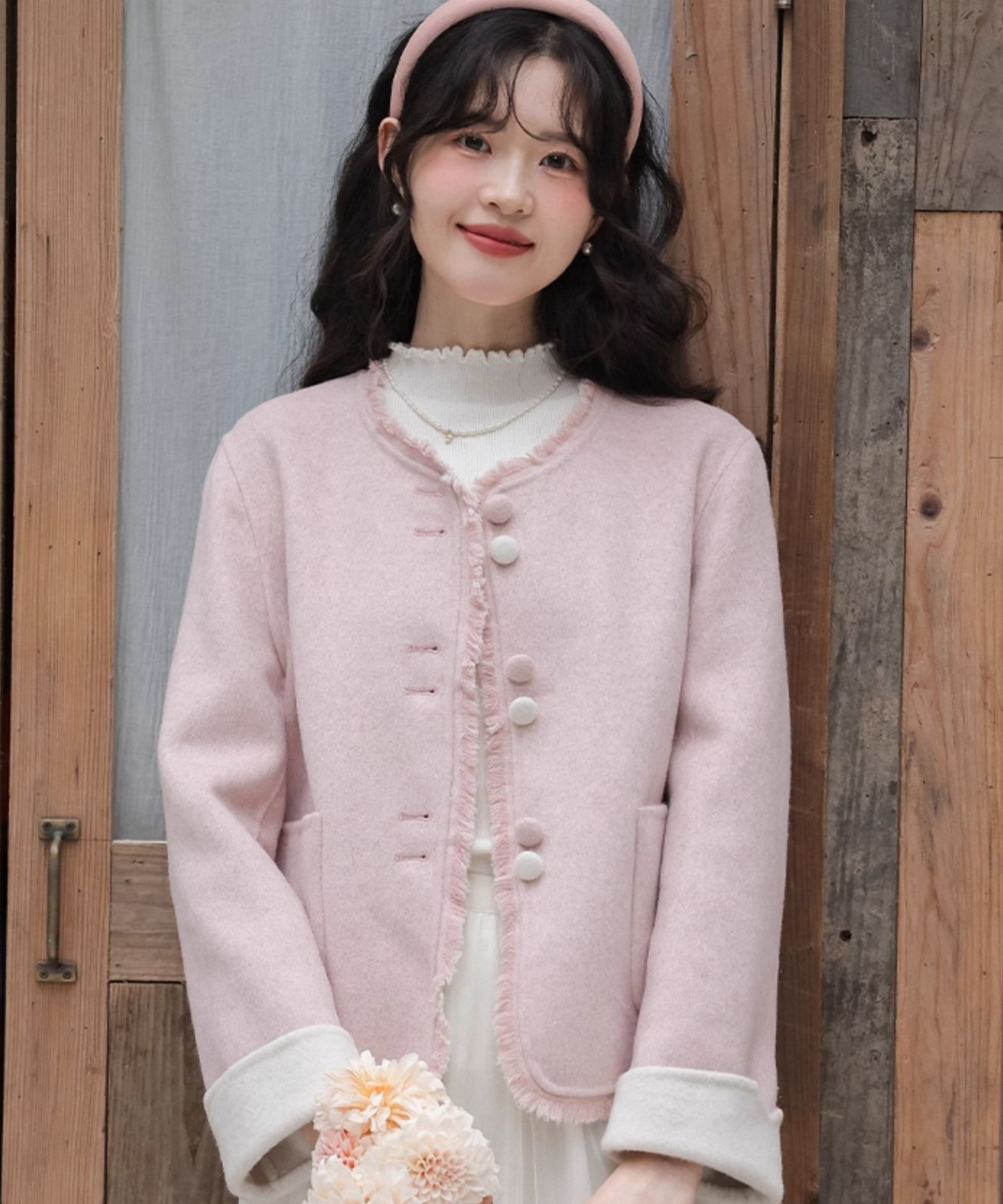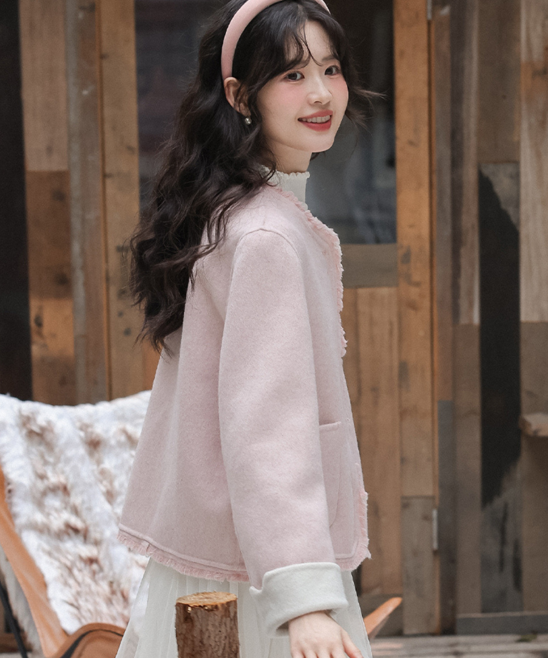 フリンジのあしらいが柔らかなニュアンスをプラスするフェミニンジャケットです。