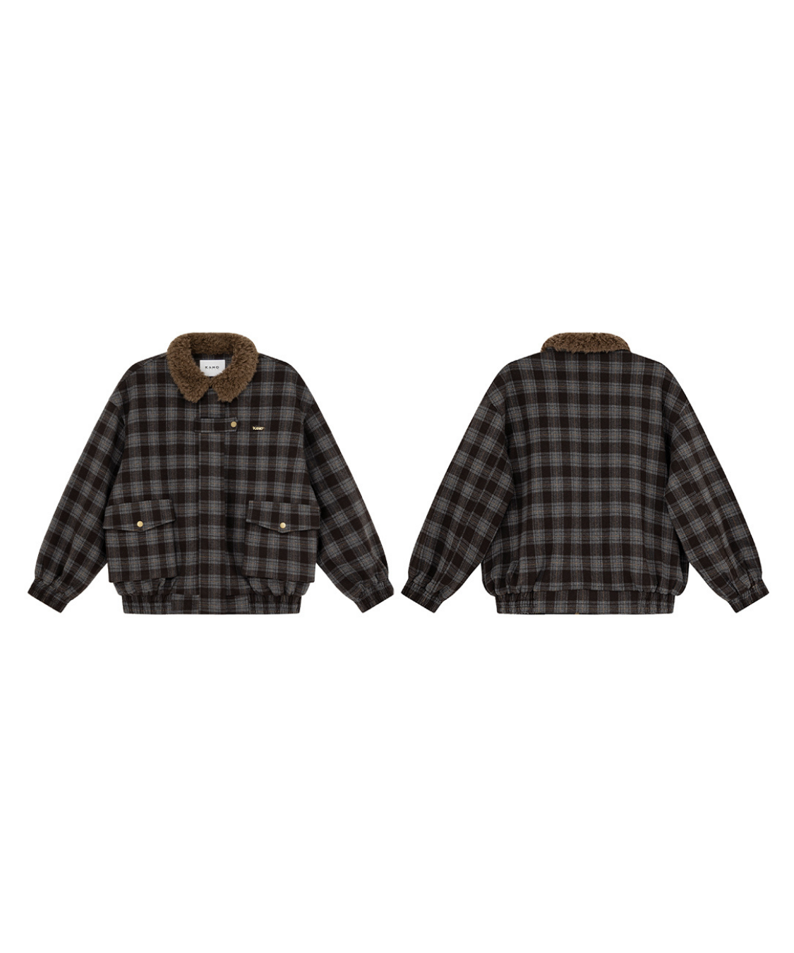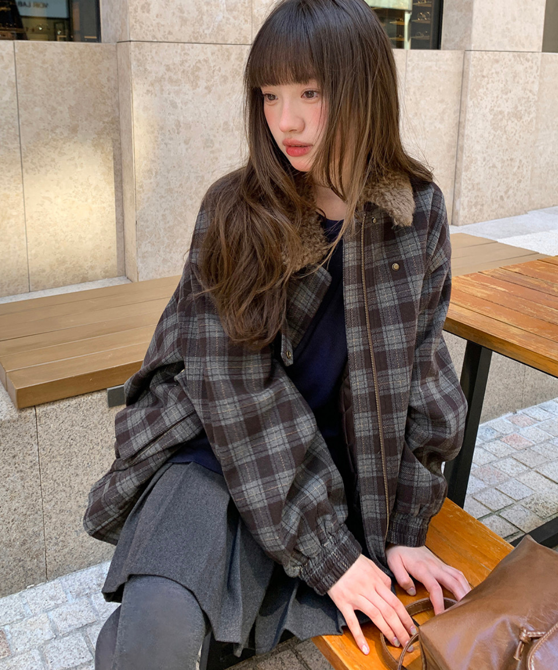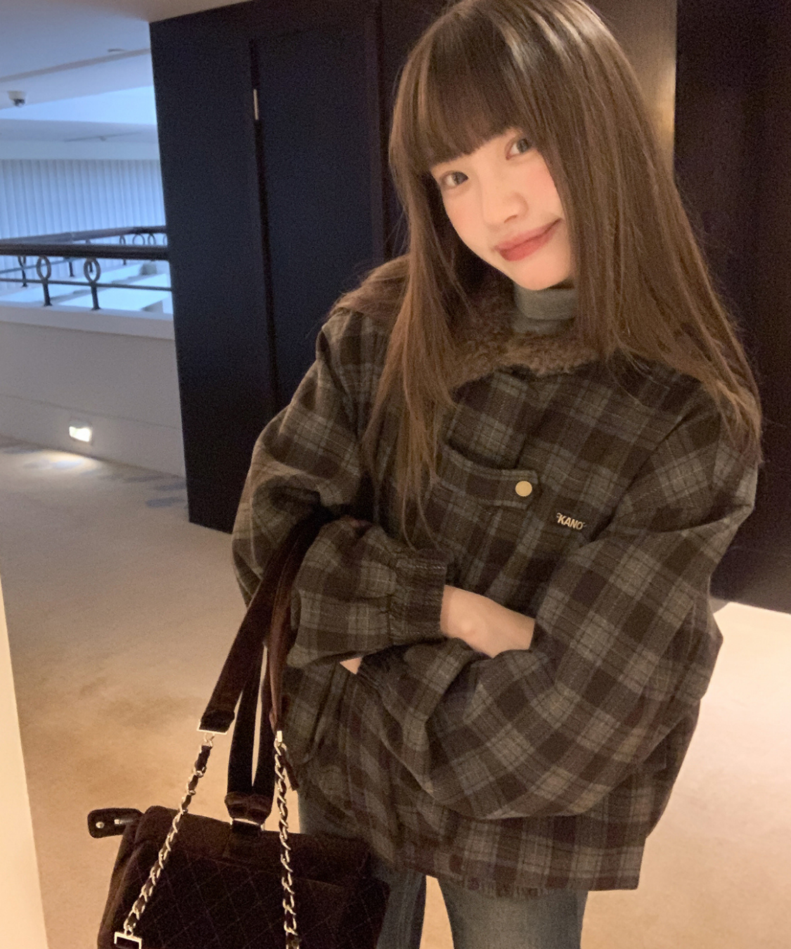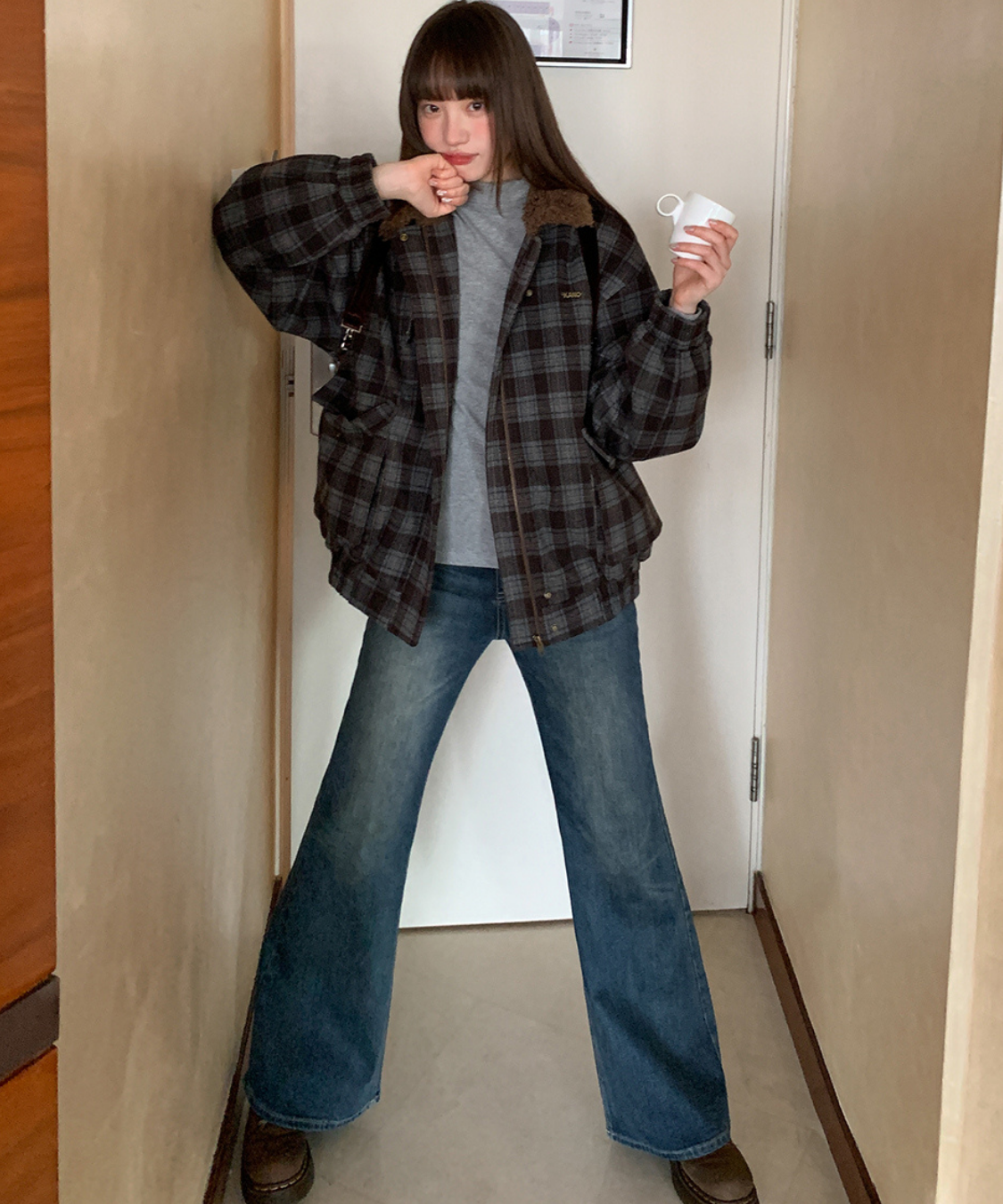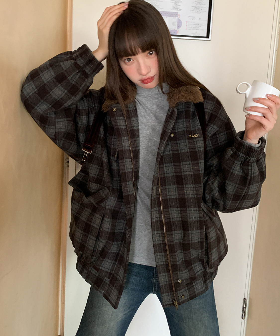 落ち着いたトーンのチェック柄にボア襟を組み合わせたあたたかみのあるジャケットです。