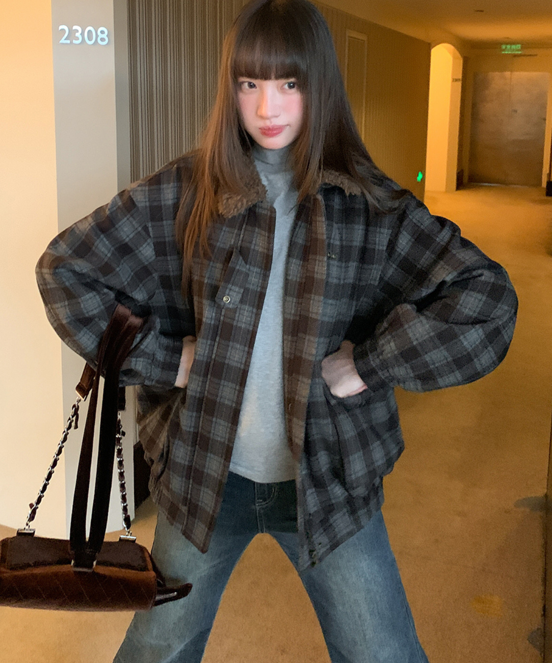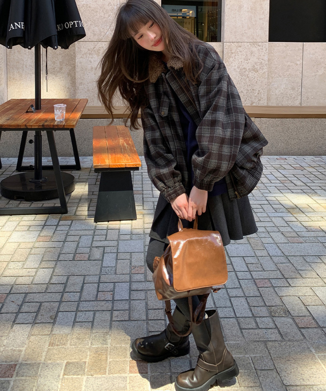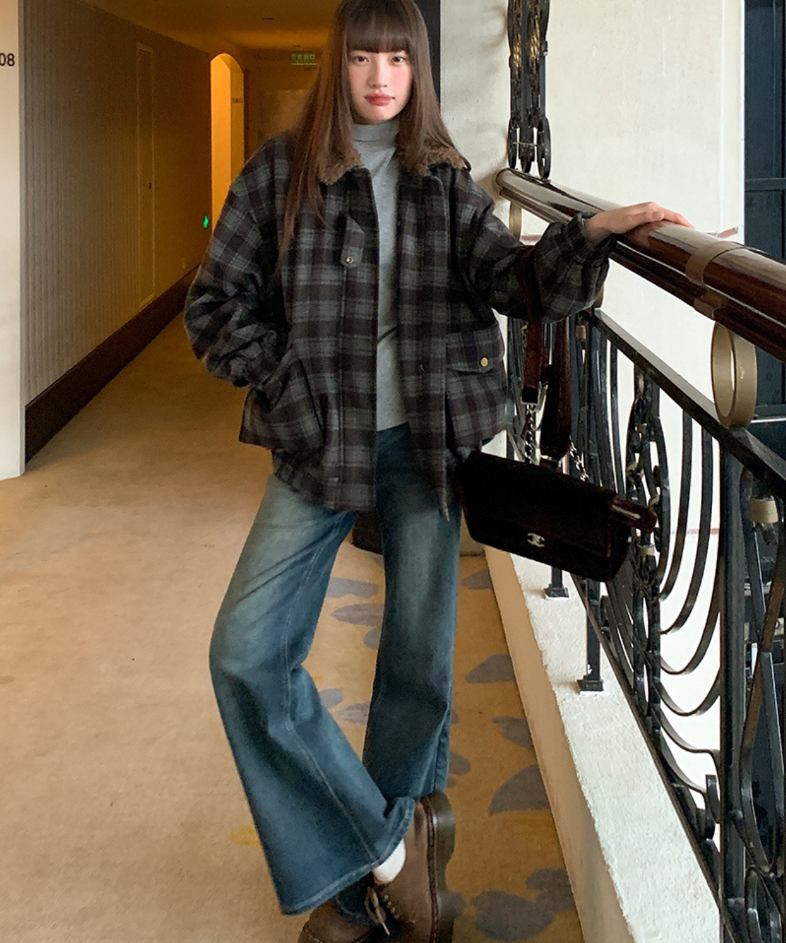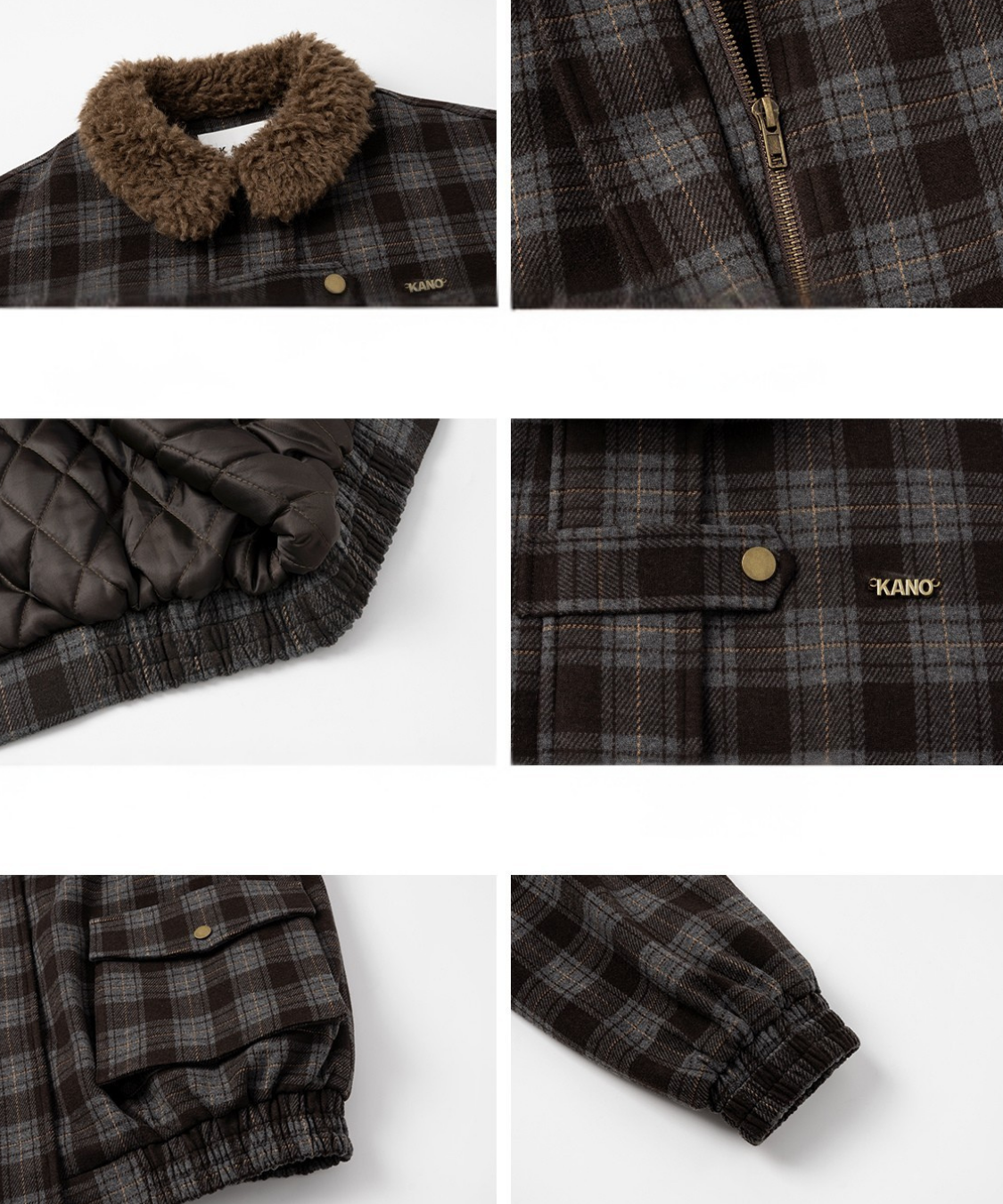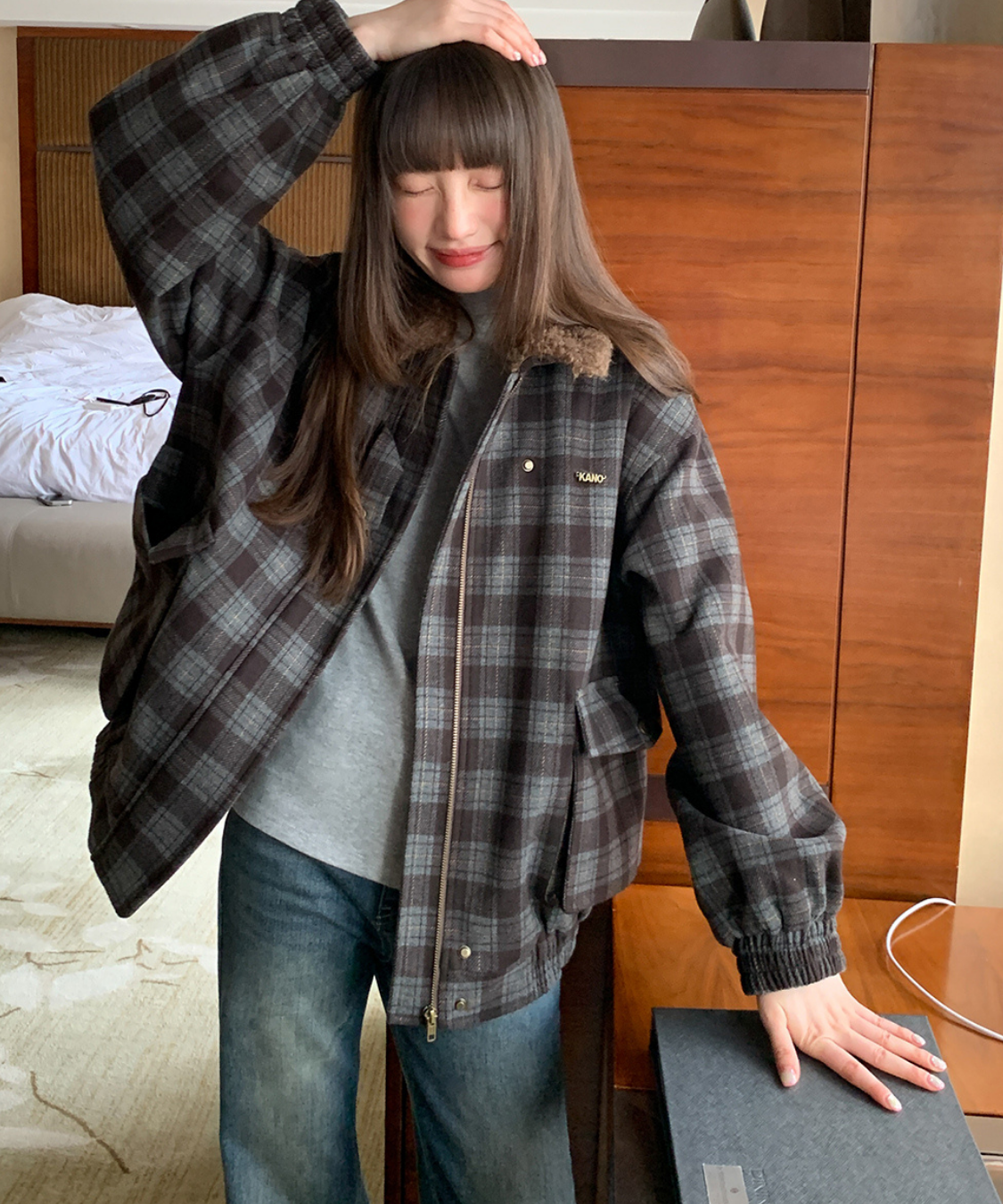 落ち着いたトーンのチェック柄にボア襟を組み合わせたあたたかみのあるジャケットです。