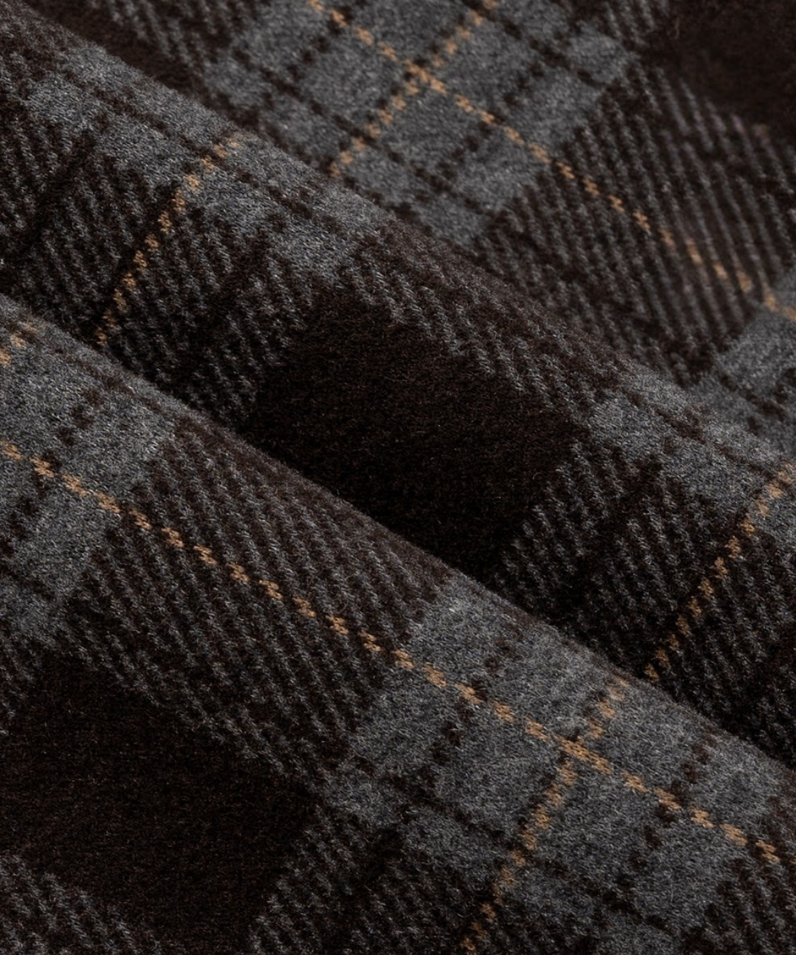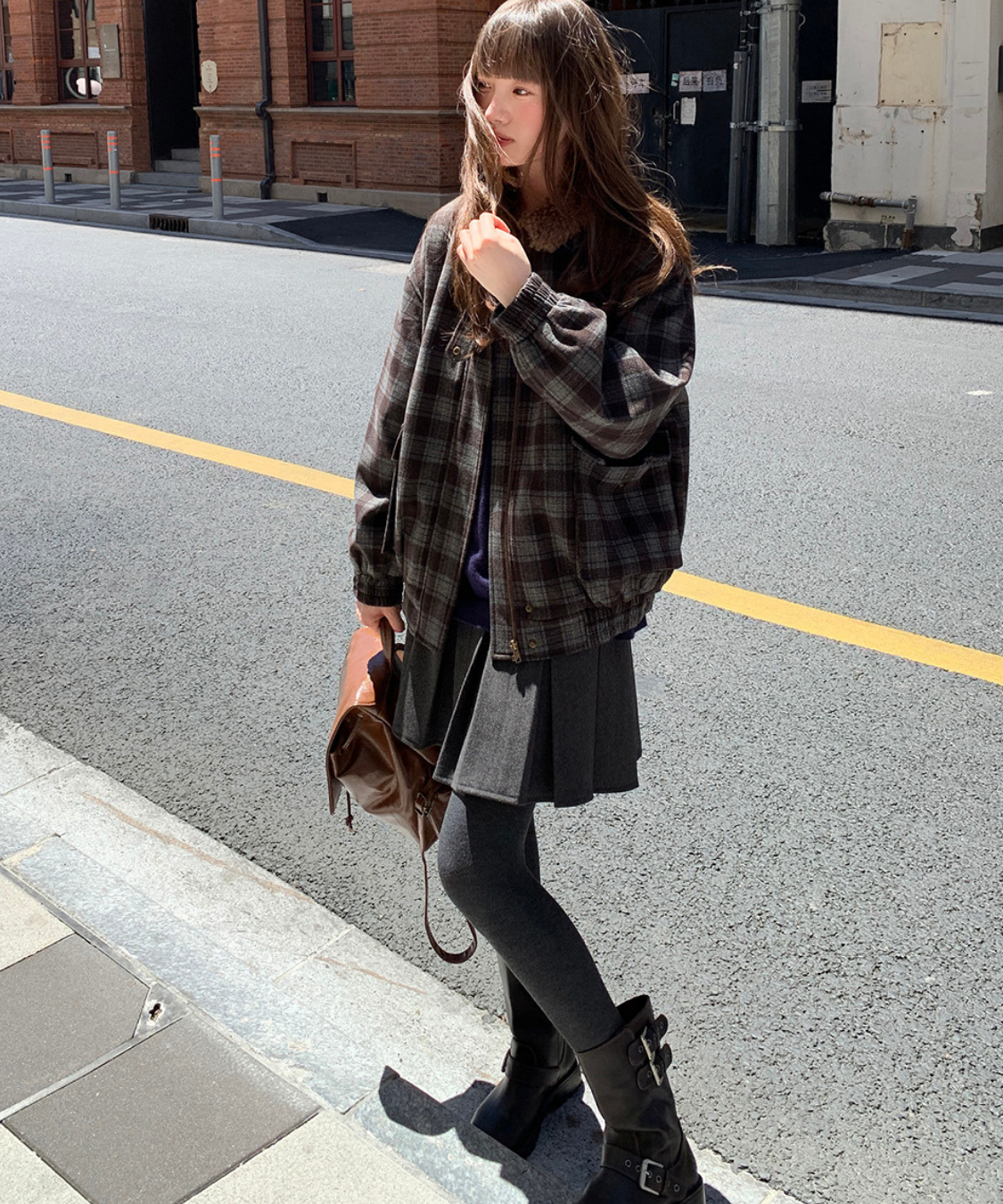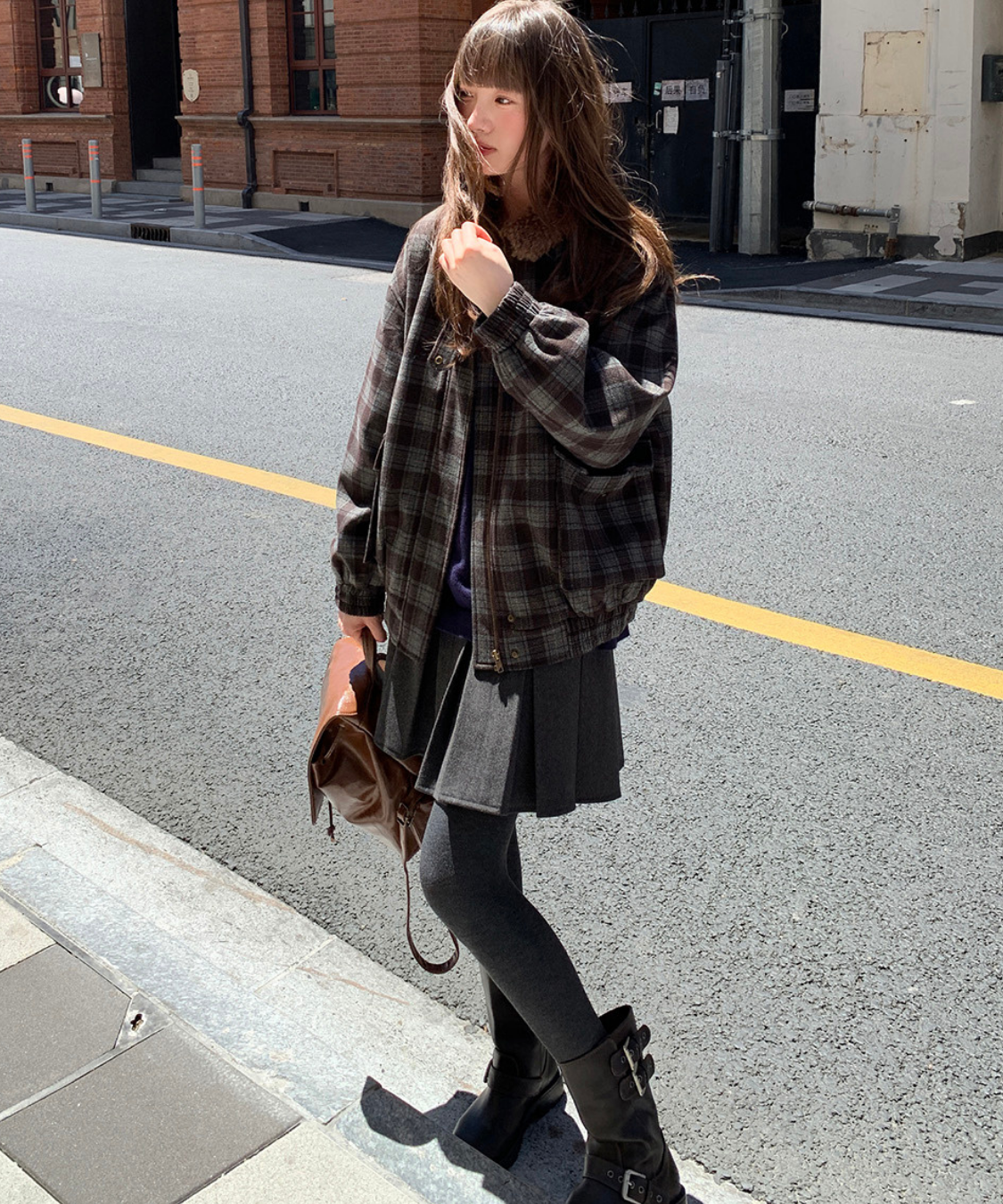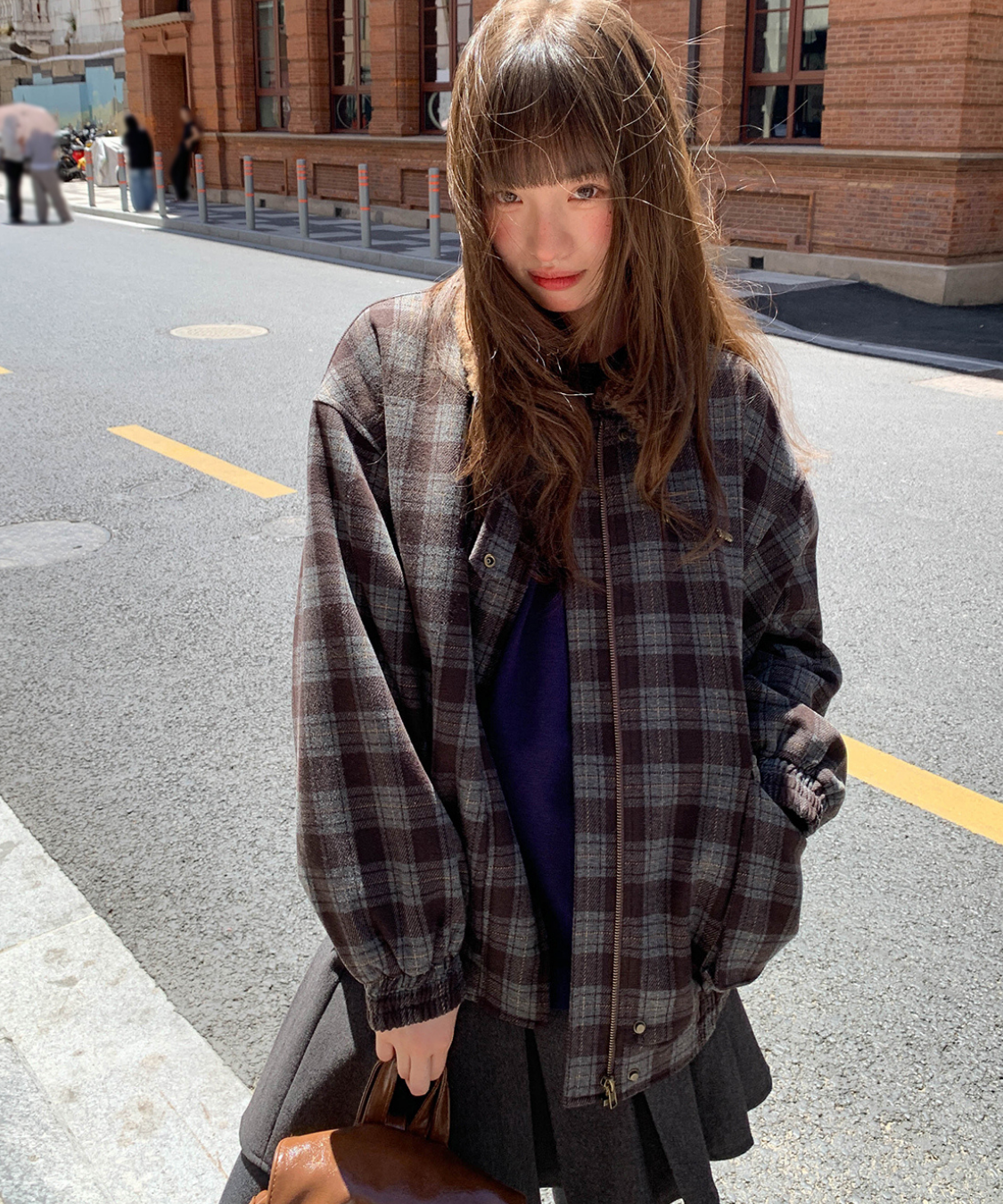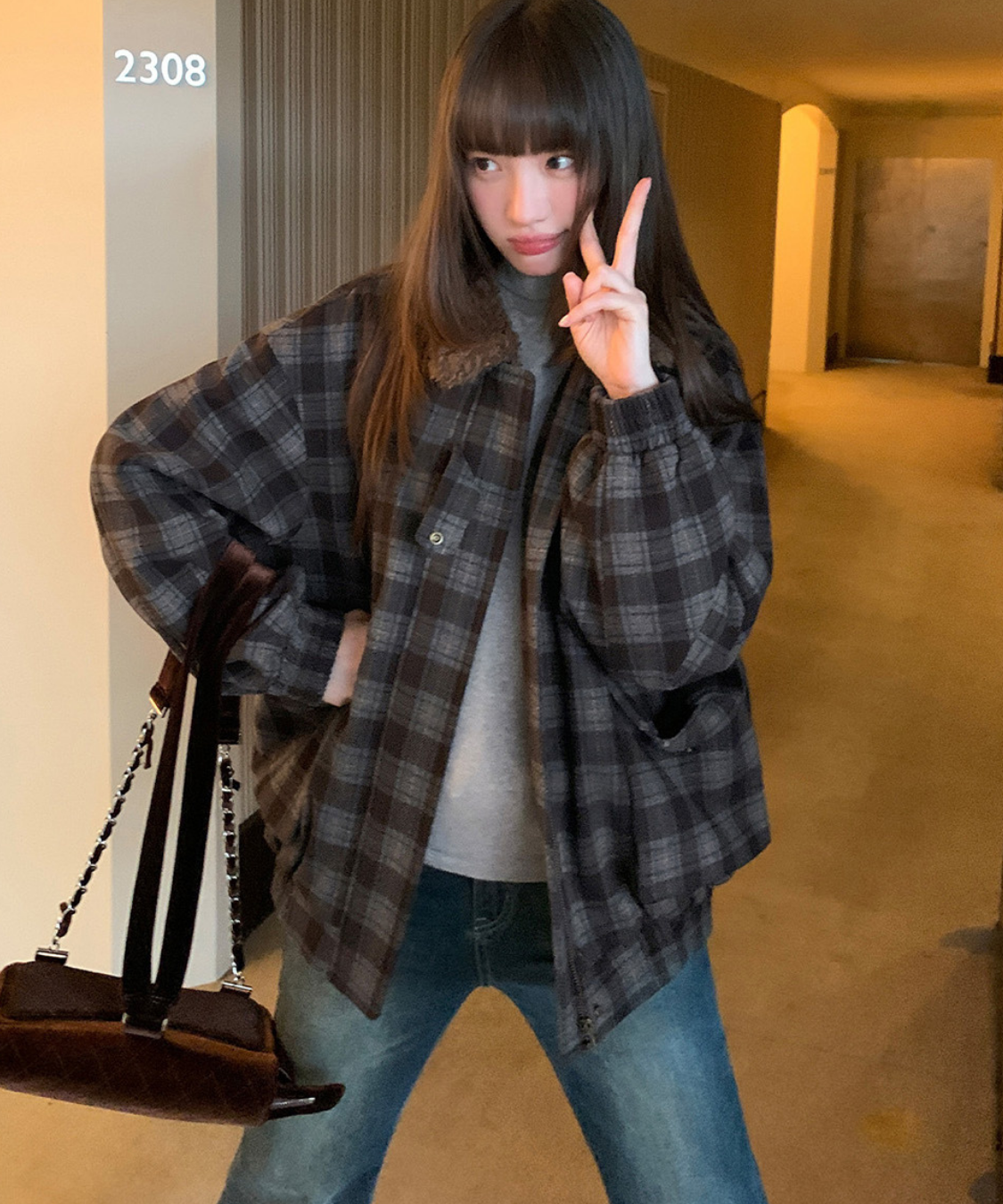落ち着いたトーンのチェック柄にボア襟を組み合わせたあたたかみのあるジャケットです。