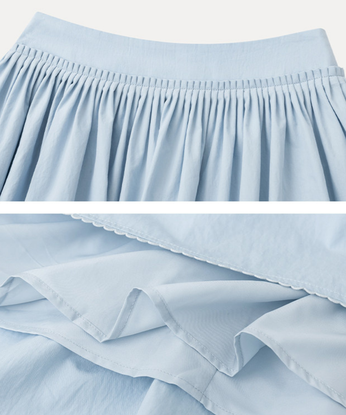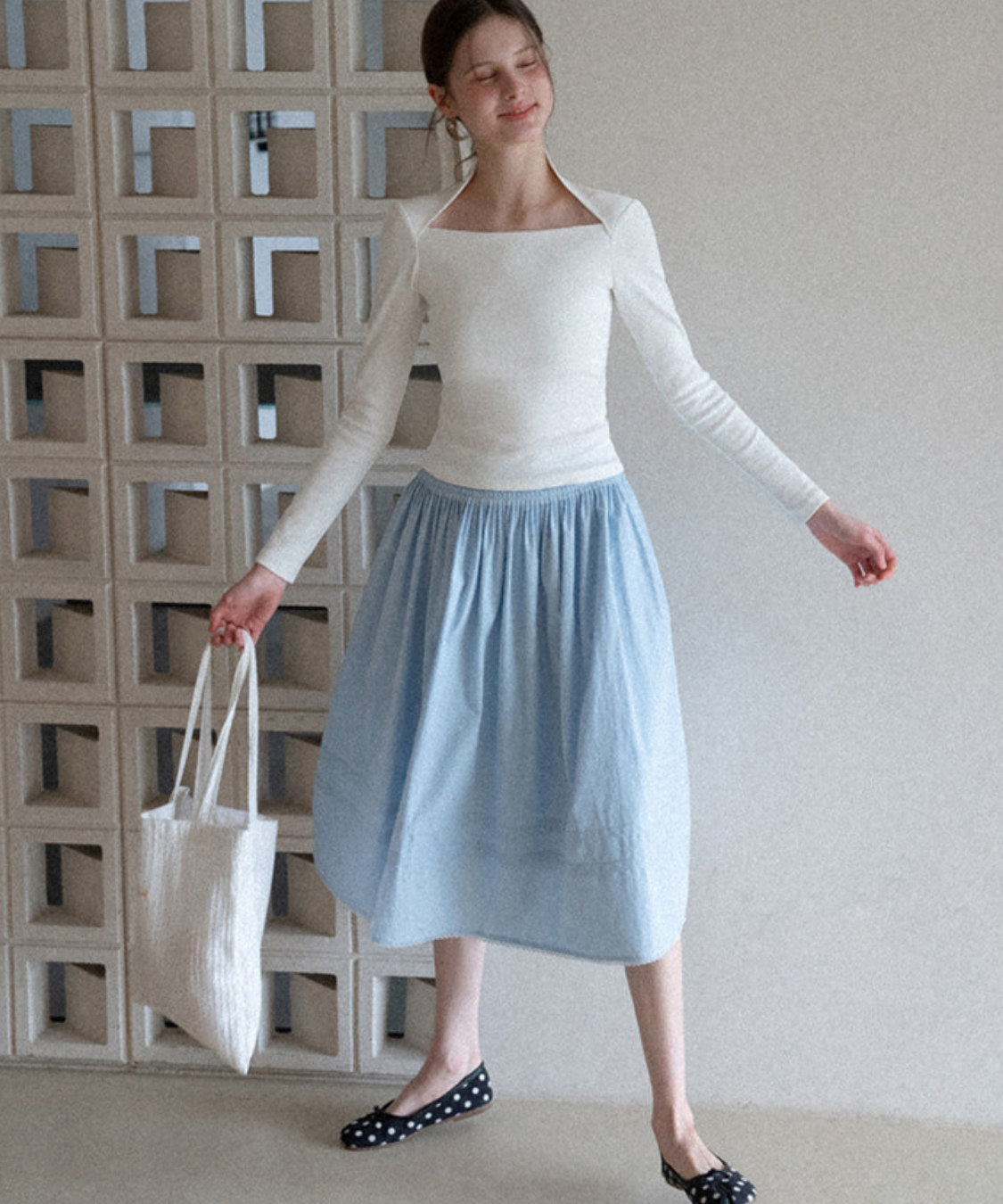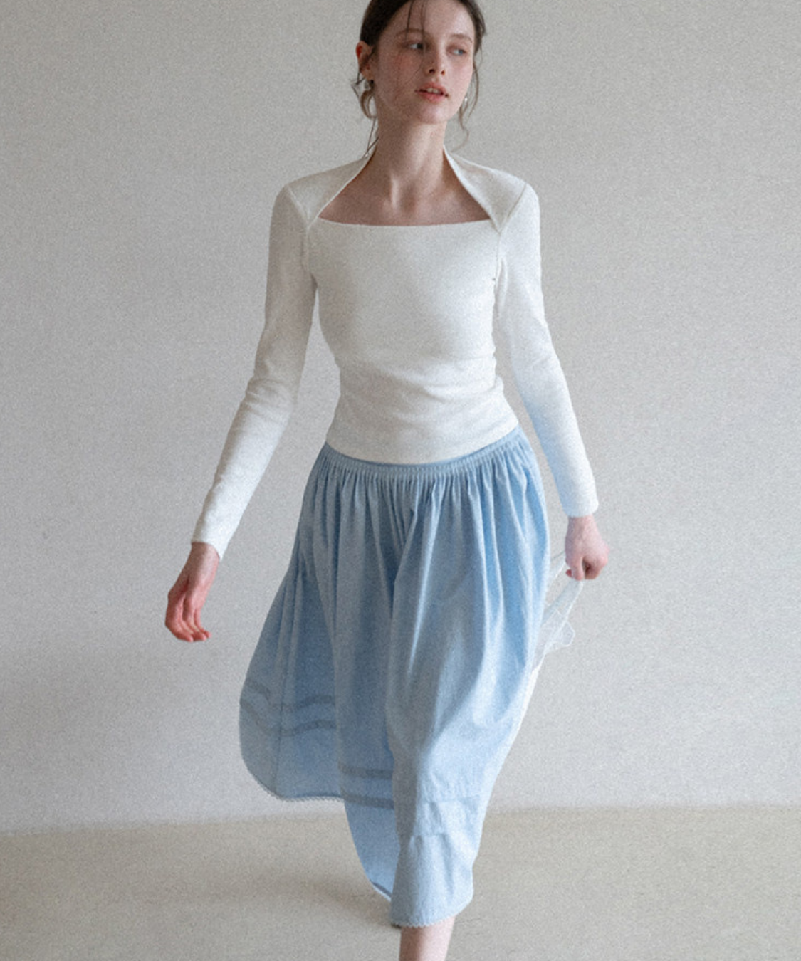 たっぷりと寄せたギャザーがふんわりと広がり、女性らしいシルエットを演出します。