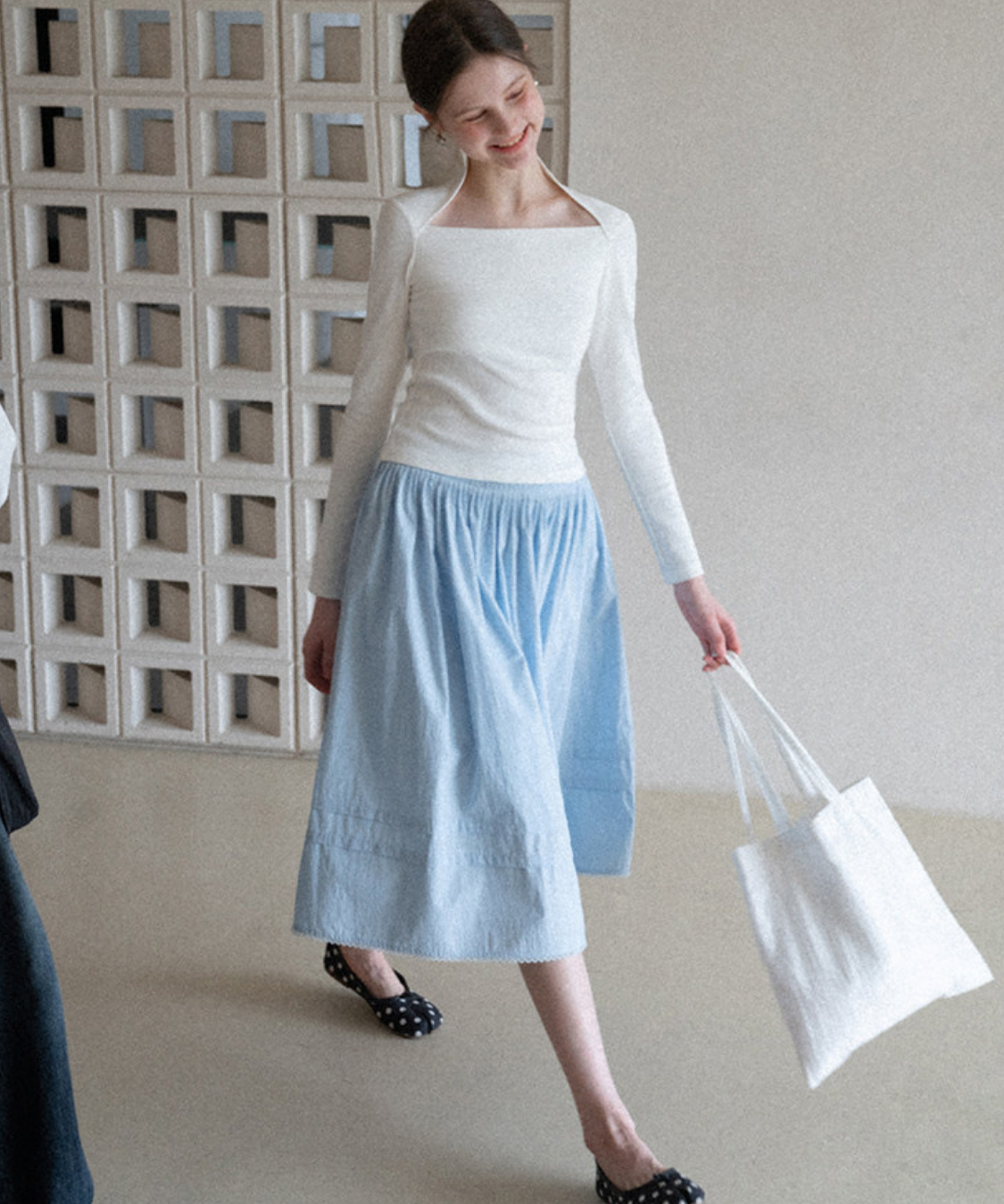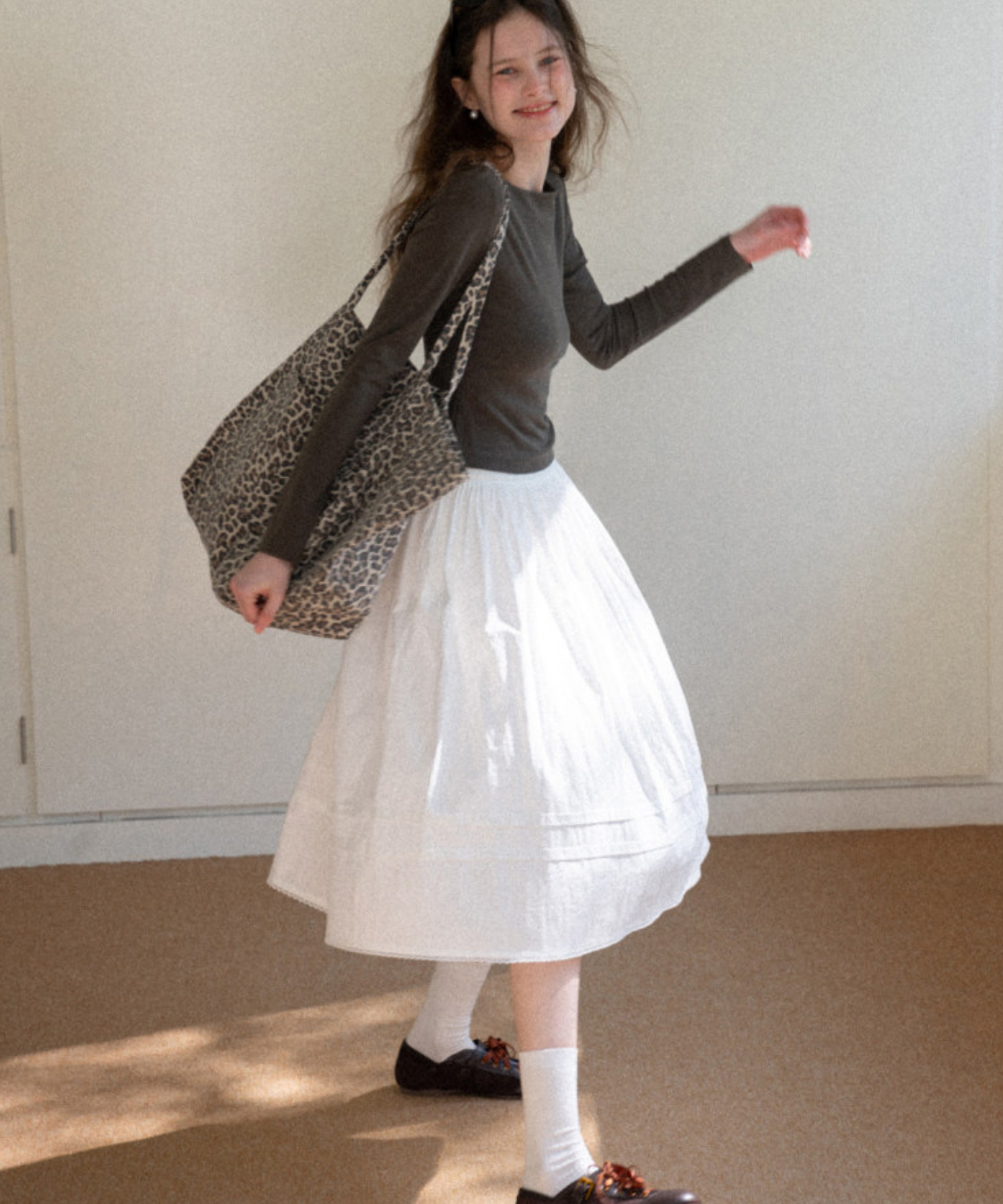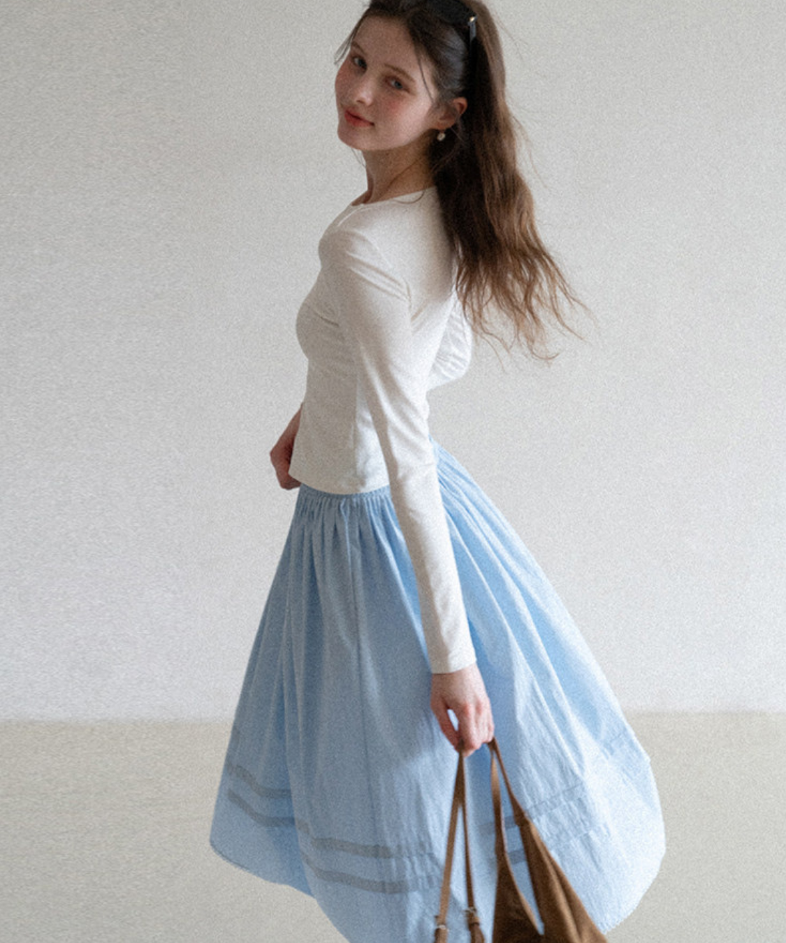 たっぷりと寄せたギャザーがふんわりと広がり、女性らしいシルエットを演出します。