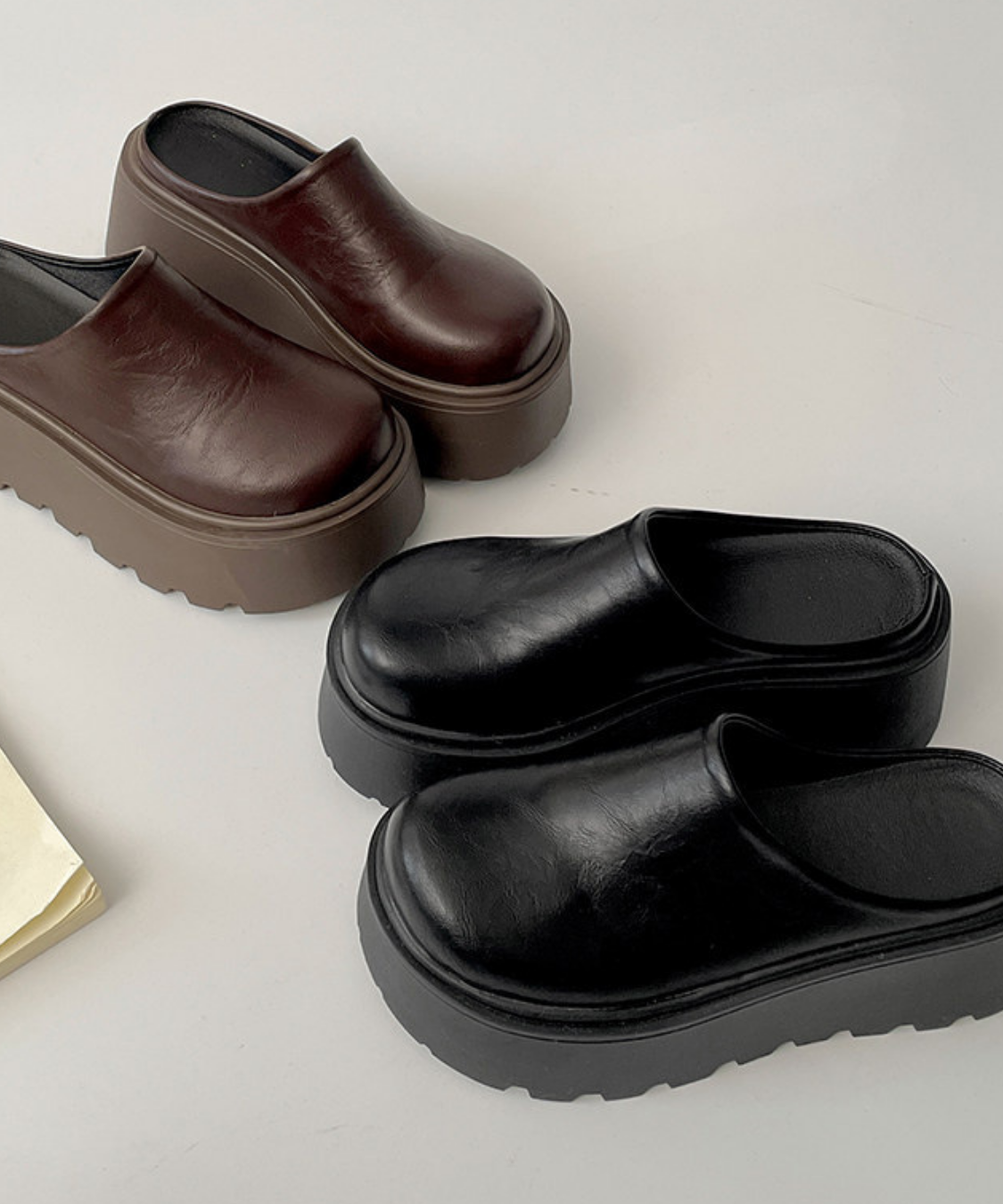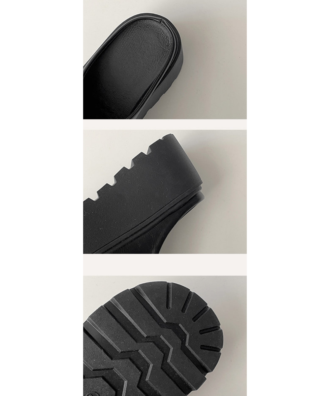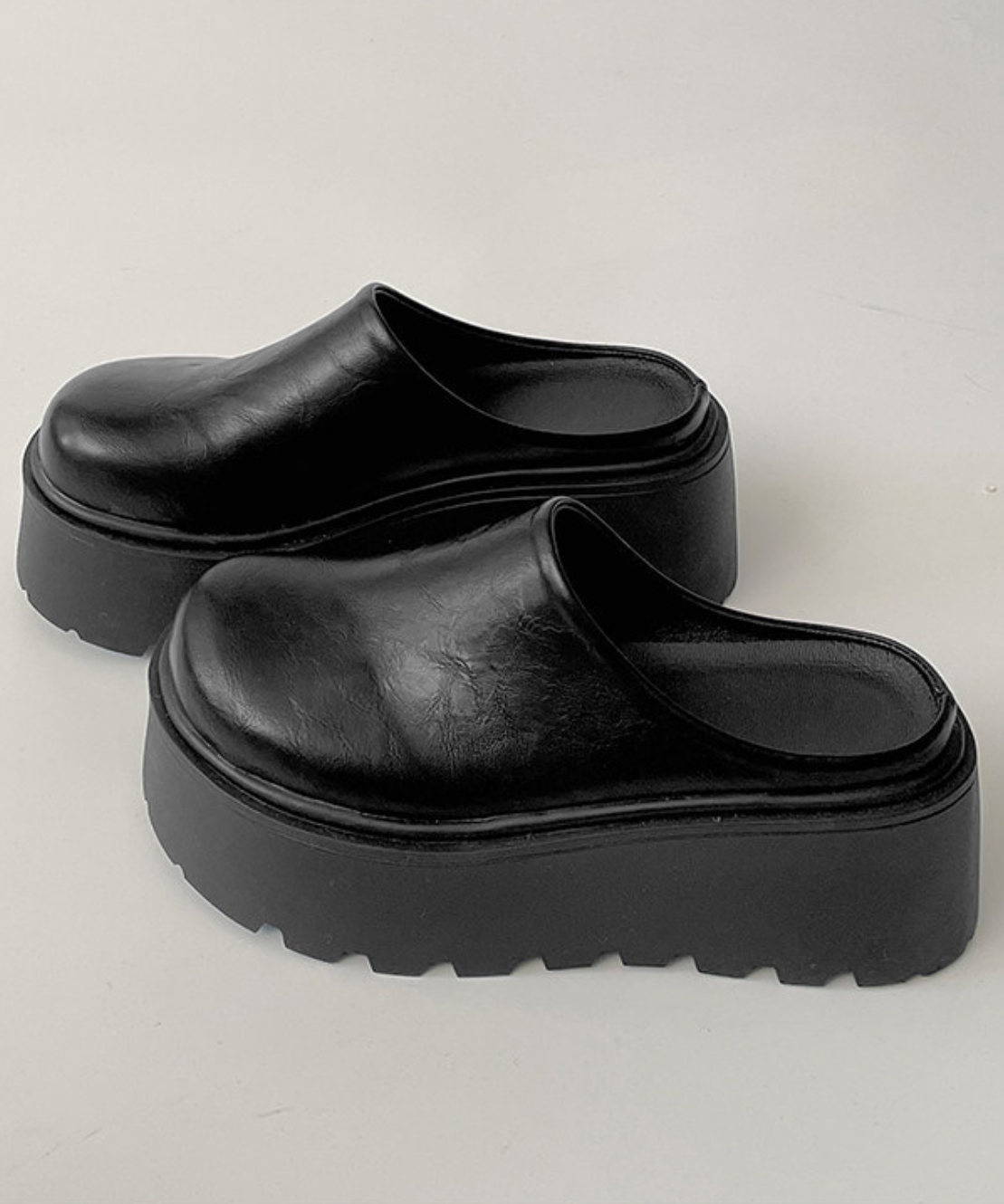 ボリューム感のある厚底デザインが目を惹くフェイクレザーサボです。