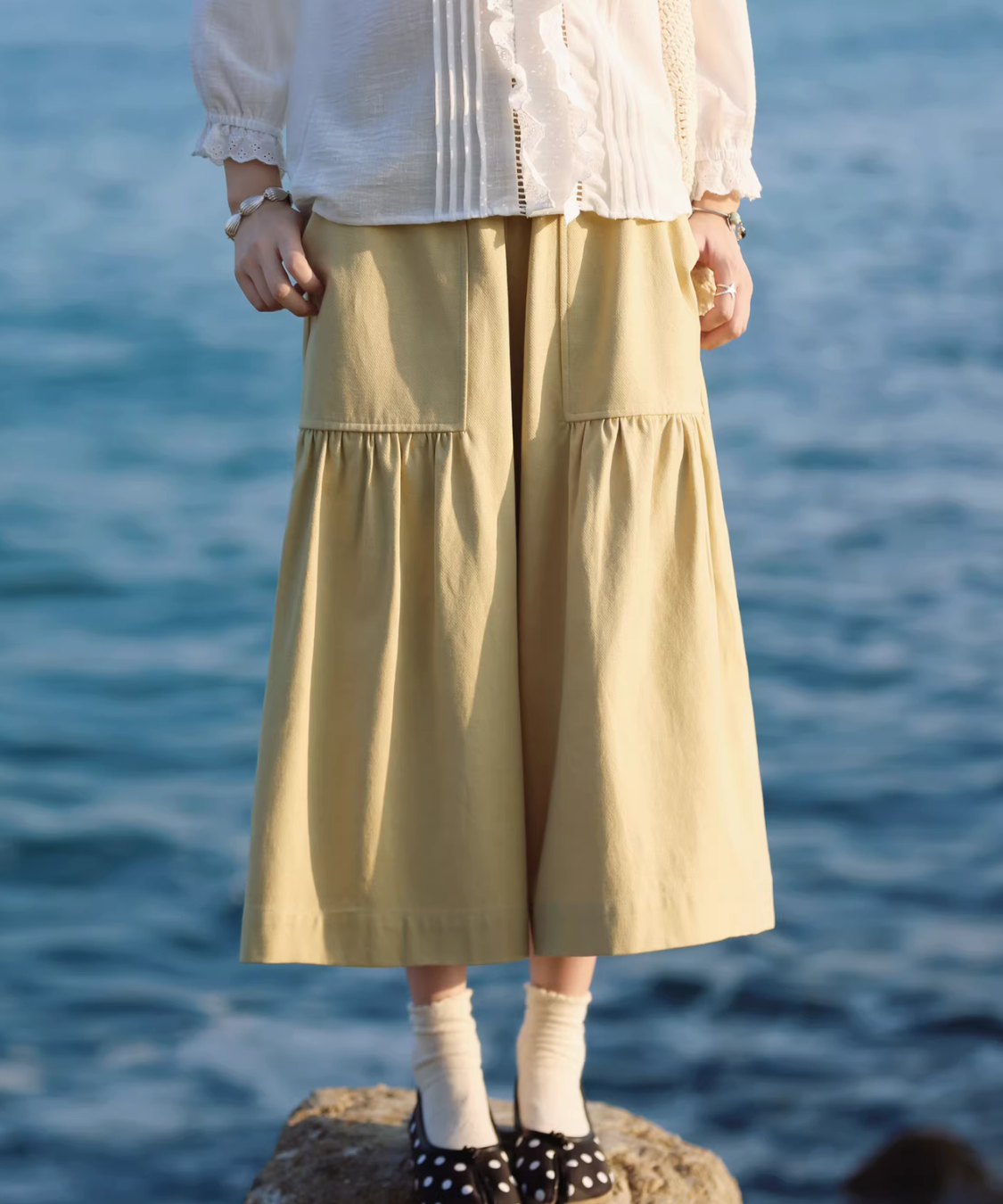 たっぷりギャザーでふんわり広がる、スカート見えするボリュームワイドパンツです。