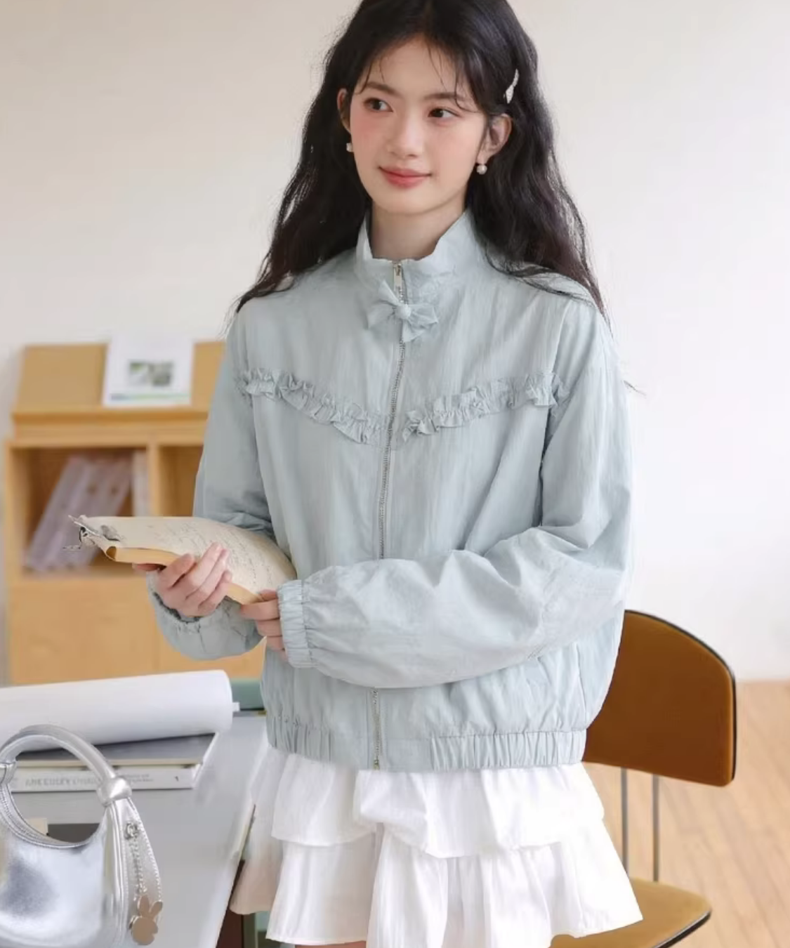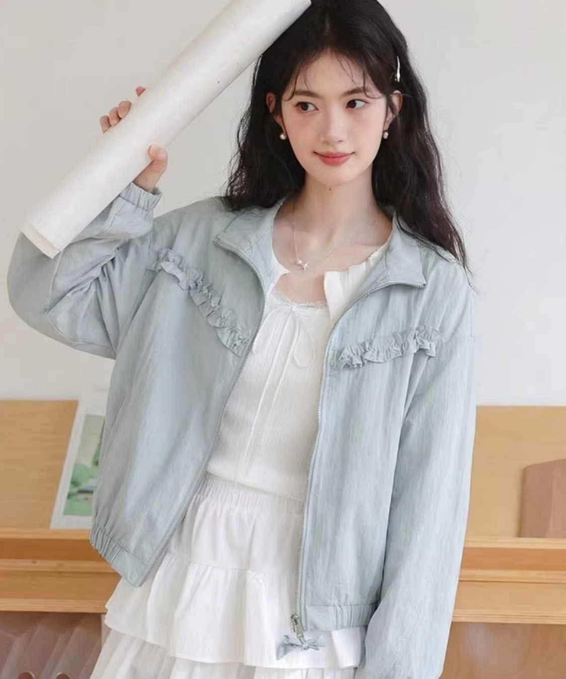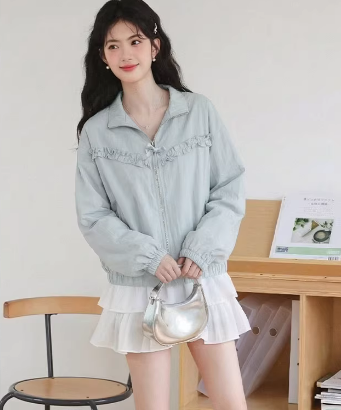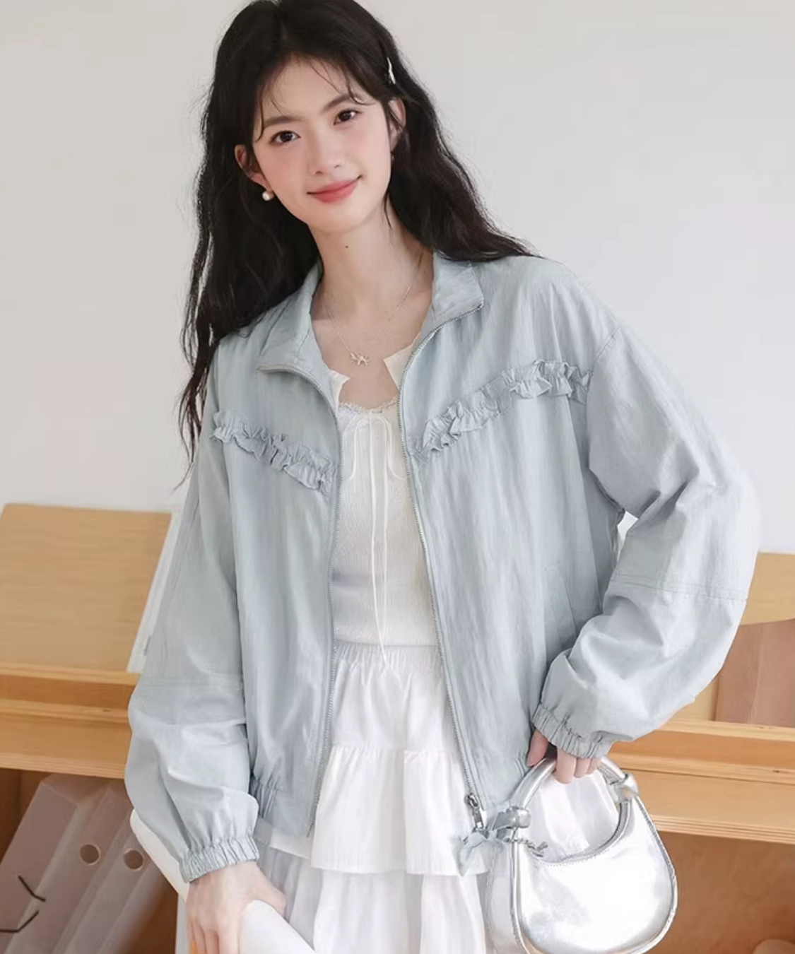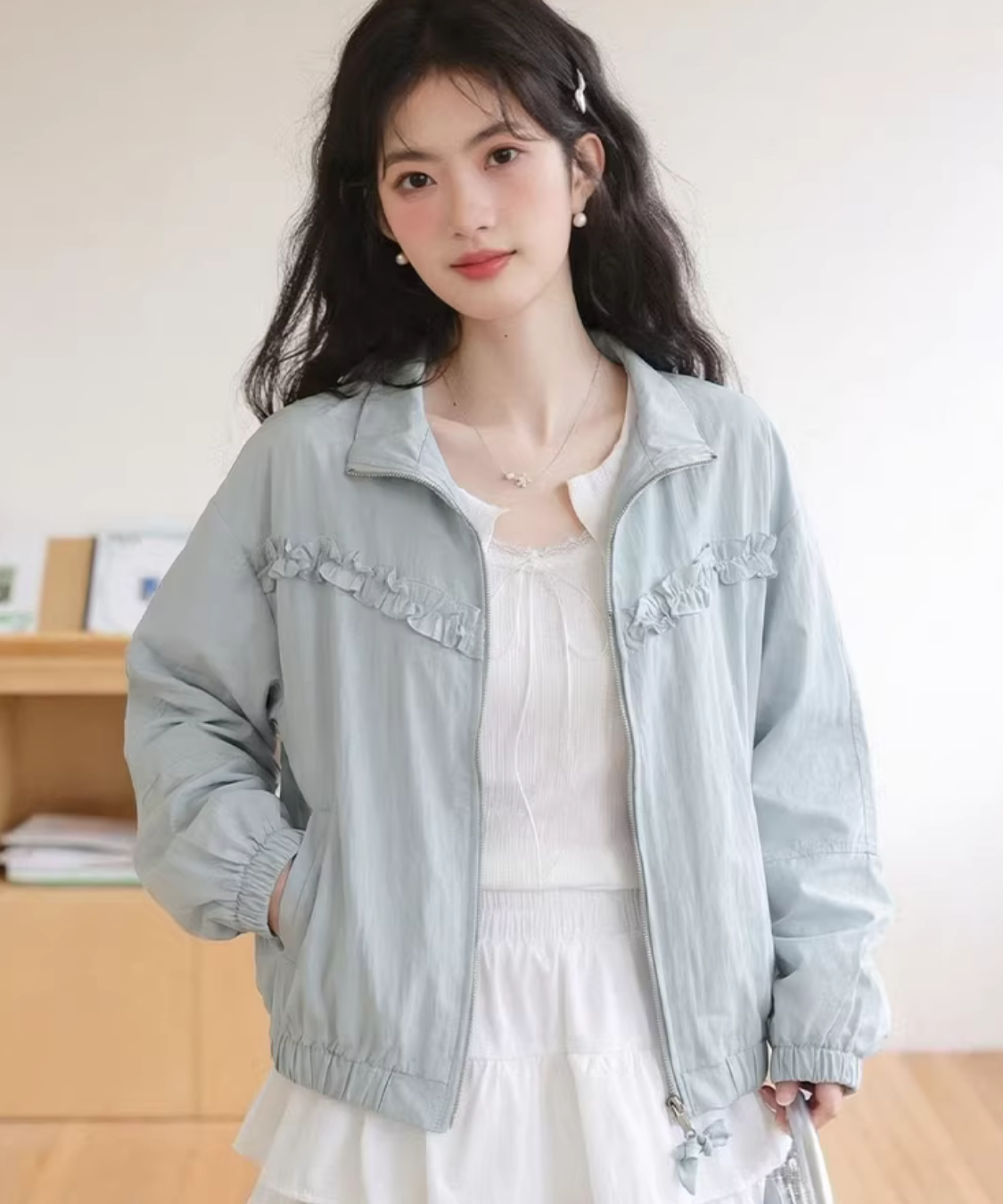 胸元のフリルラインがアクセントになり、羽織るだけでコーデが可愛く整います♡