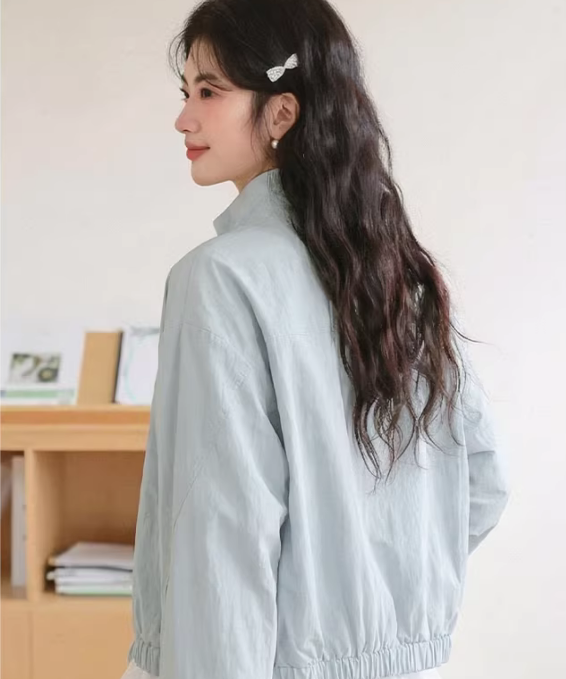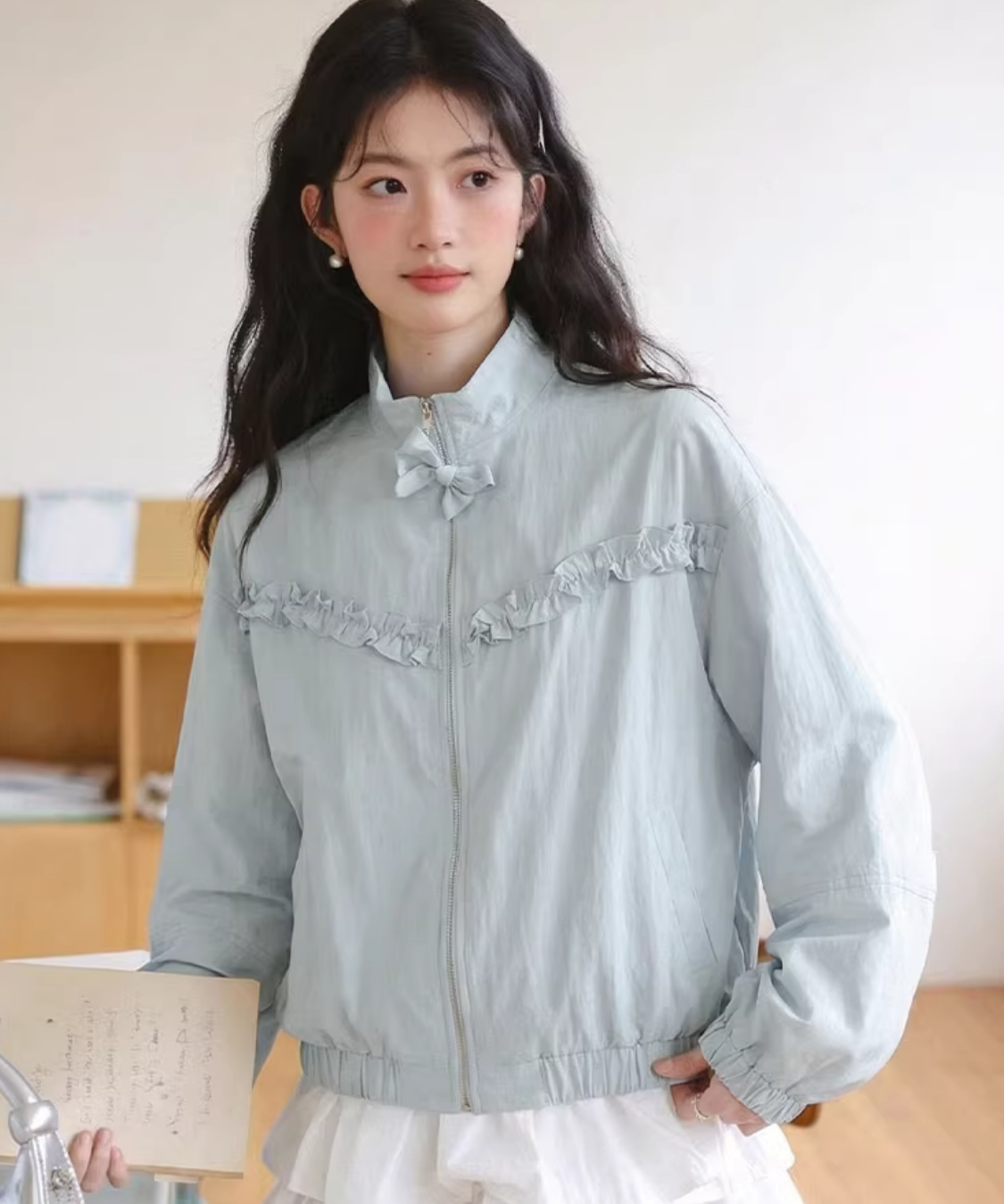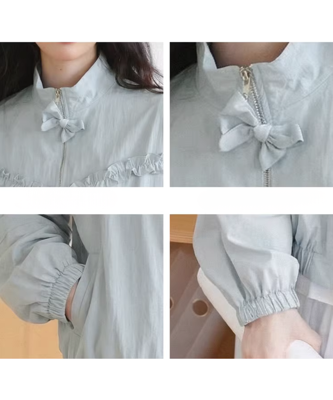スタンドカラーフリルデザインリボン付きファスナーブルゾン