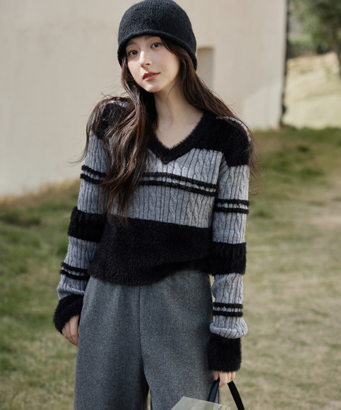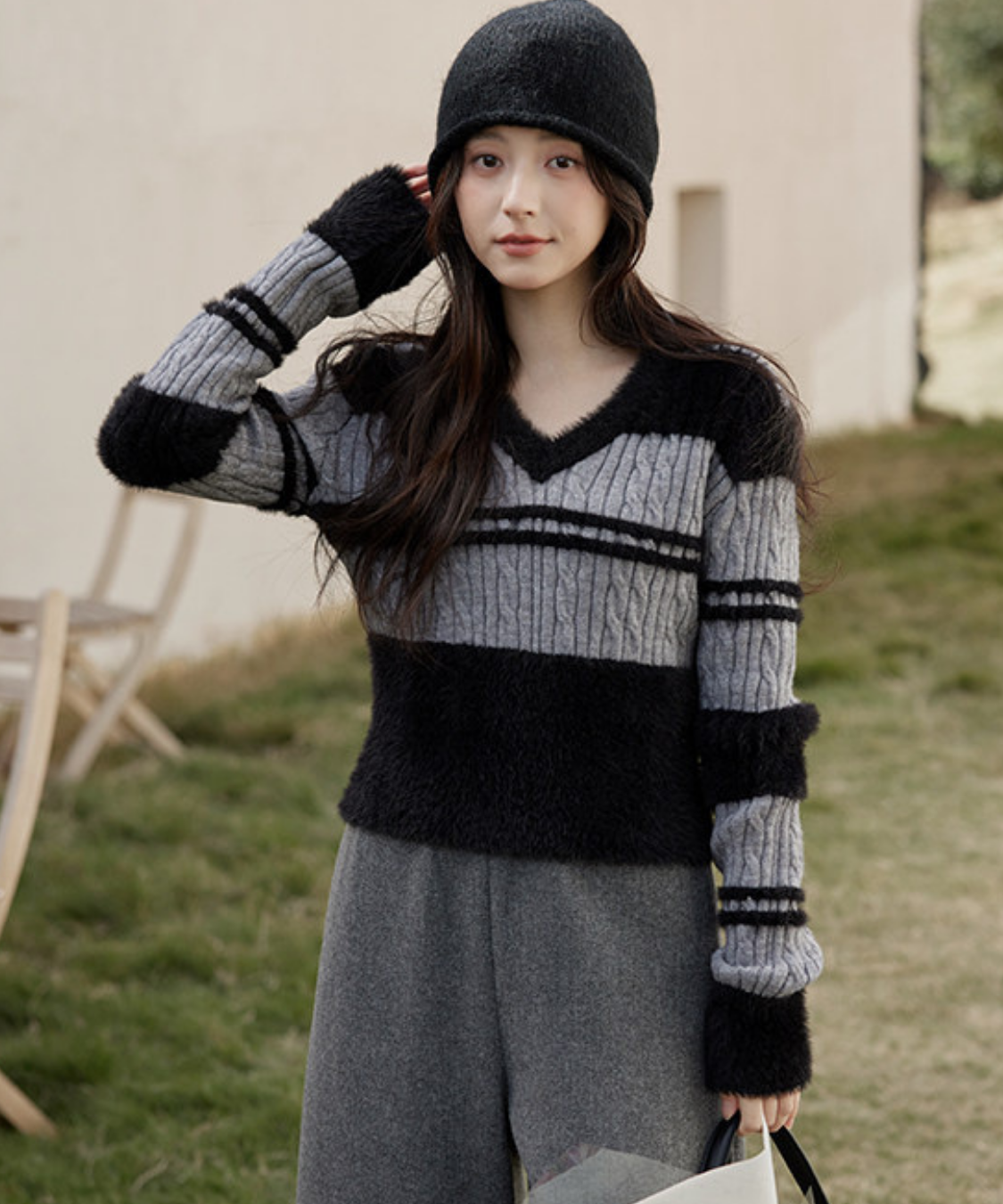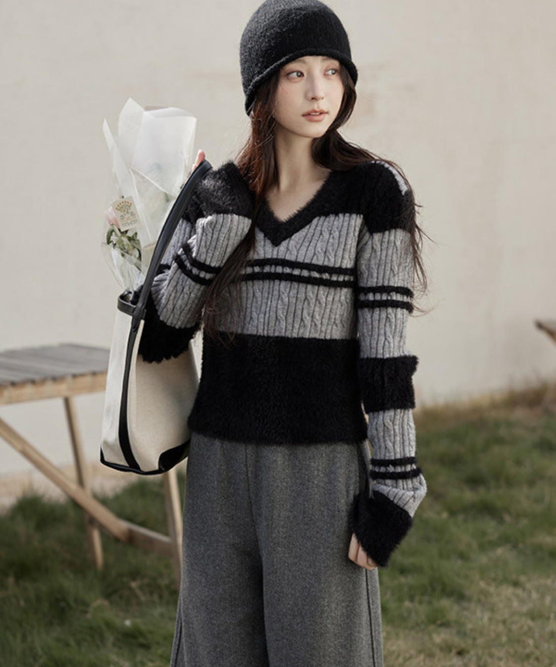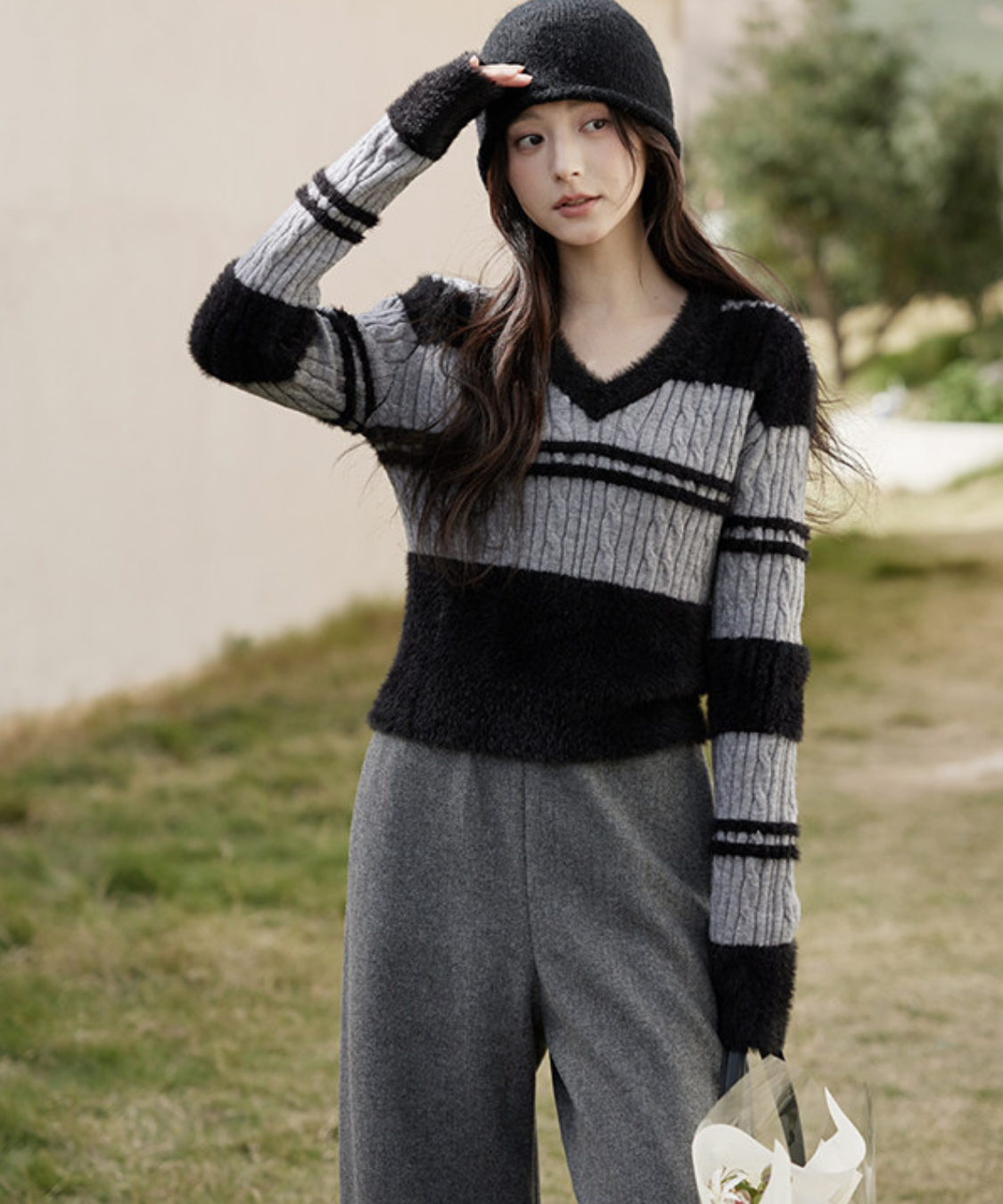 立体感のあるボーダーとファーの切り替えが印象的なVネックニットです。