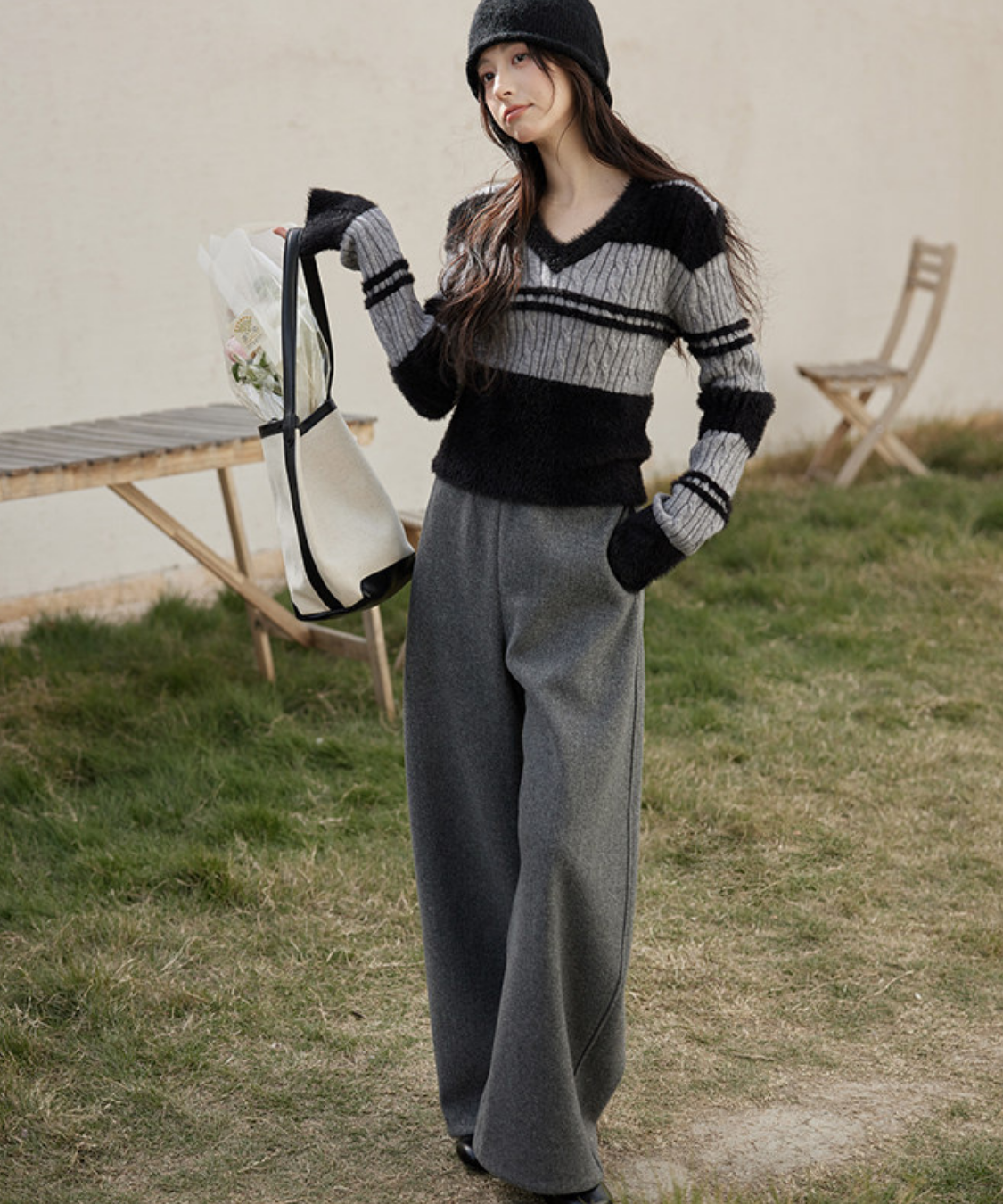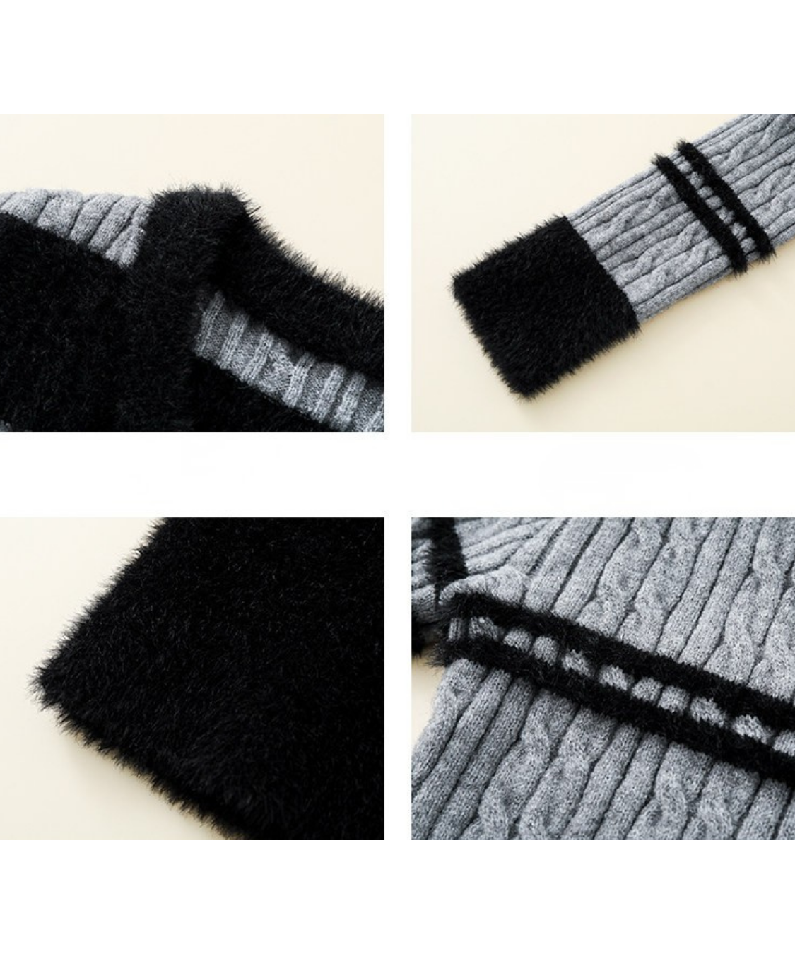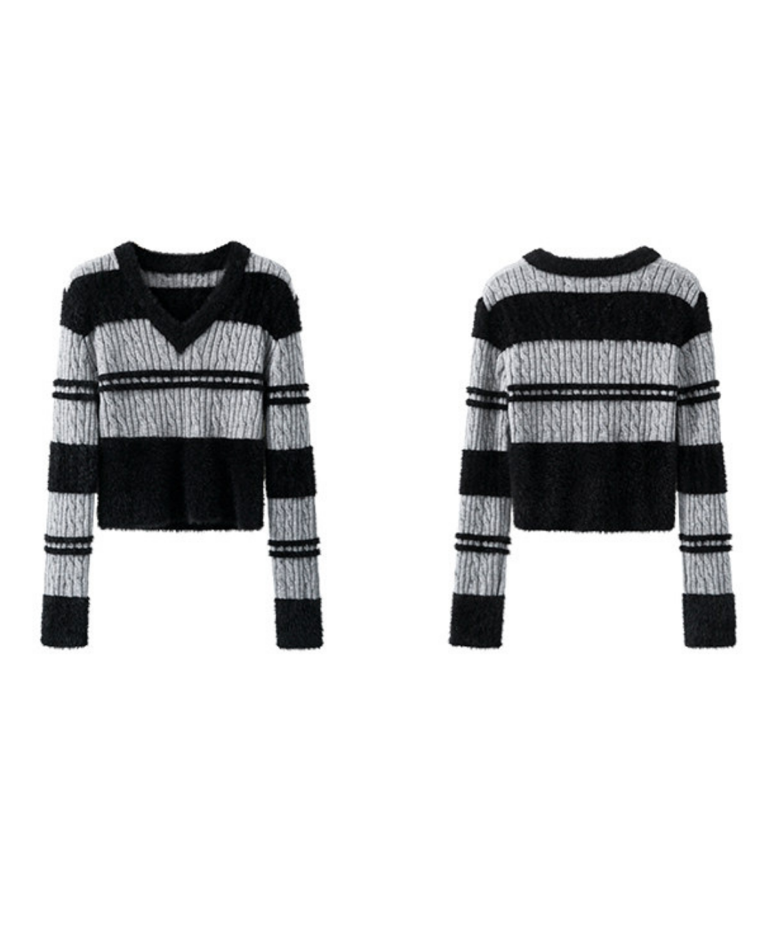 立体感のあるボーダーとファーの切り替えが印象的なVネックニットです。