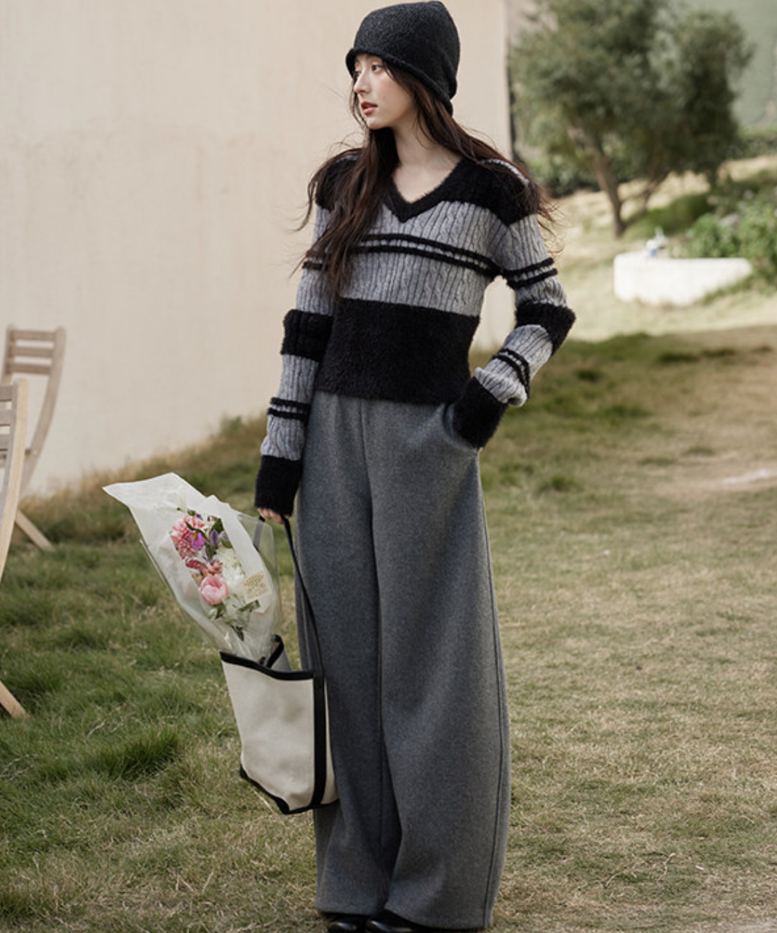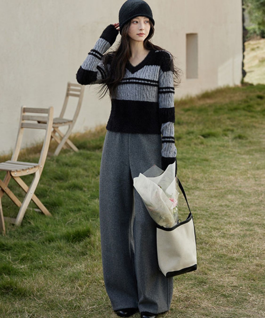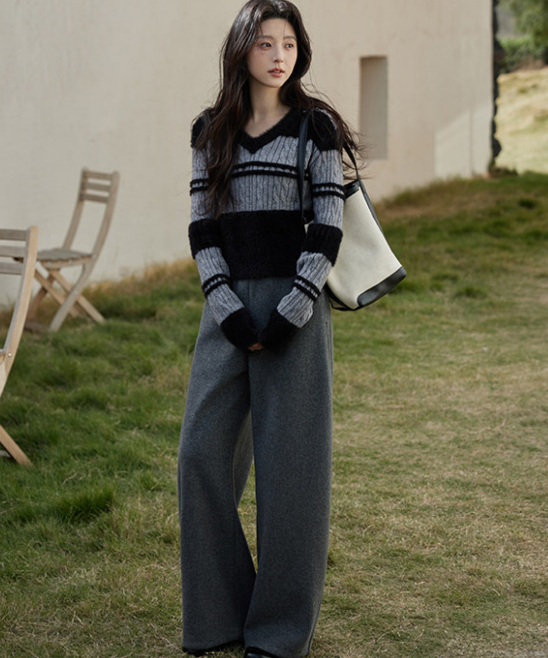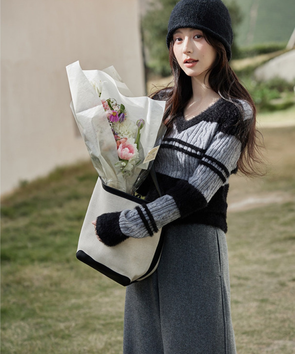 立体感のあるボーダーとファーの切り替えが印象的なVネックニットです。