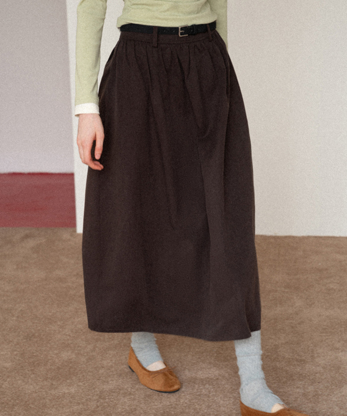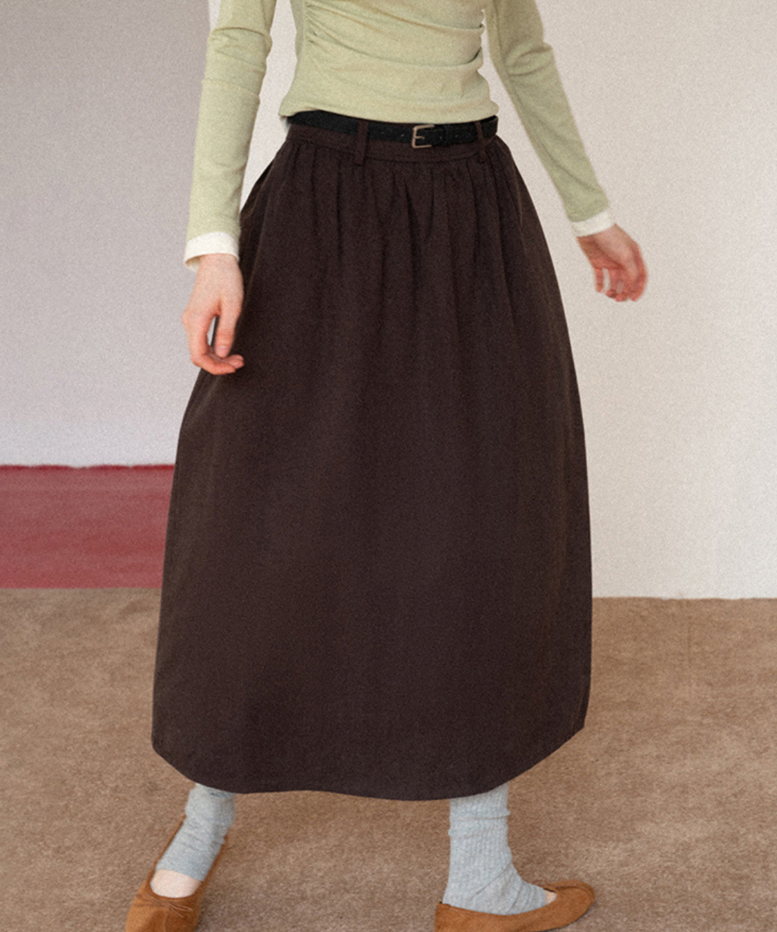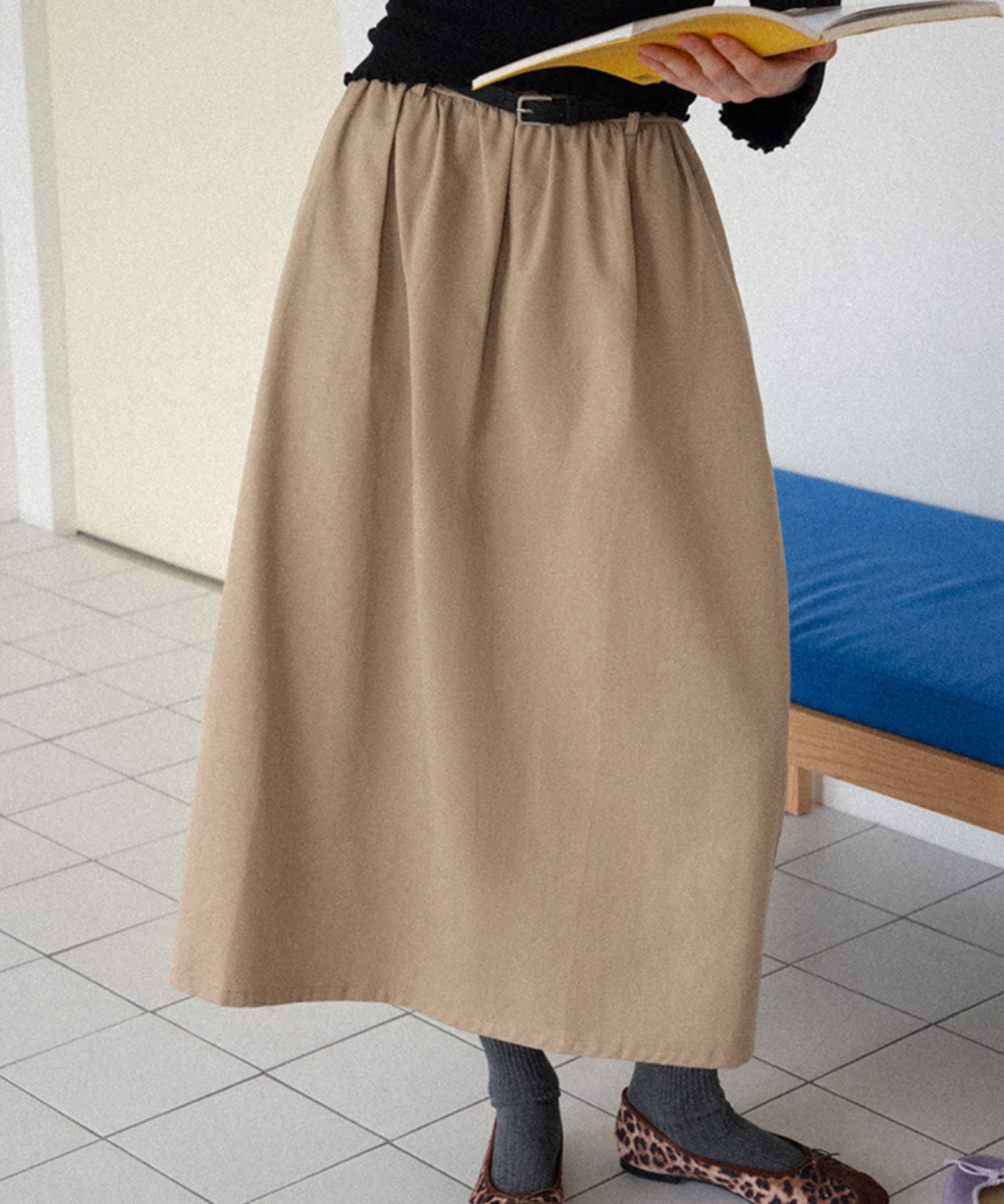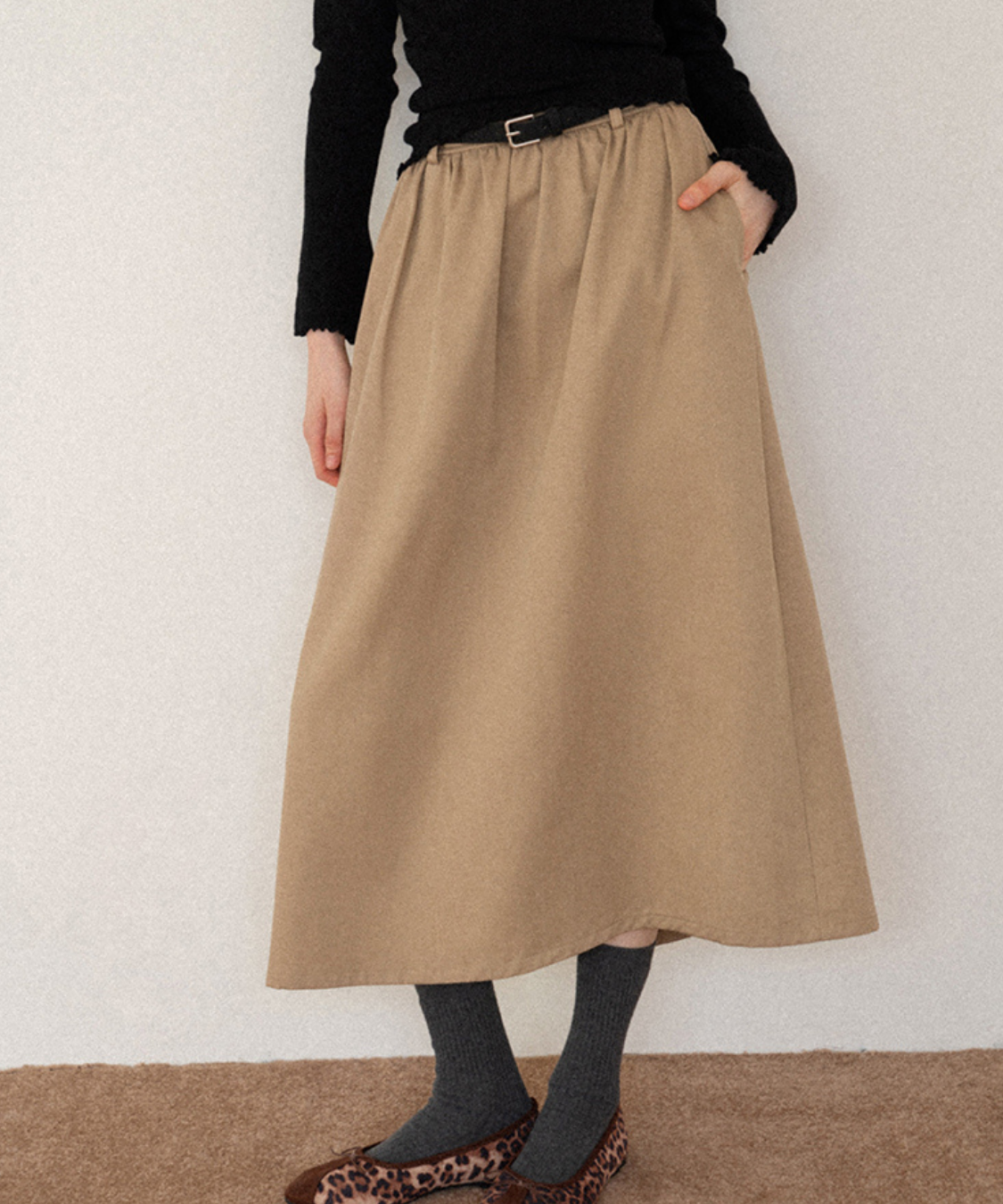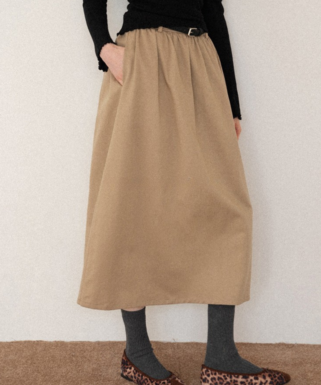 ウエストのギャザーがふんわりシルエットを描くロングスカートです。