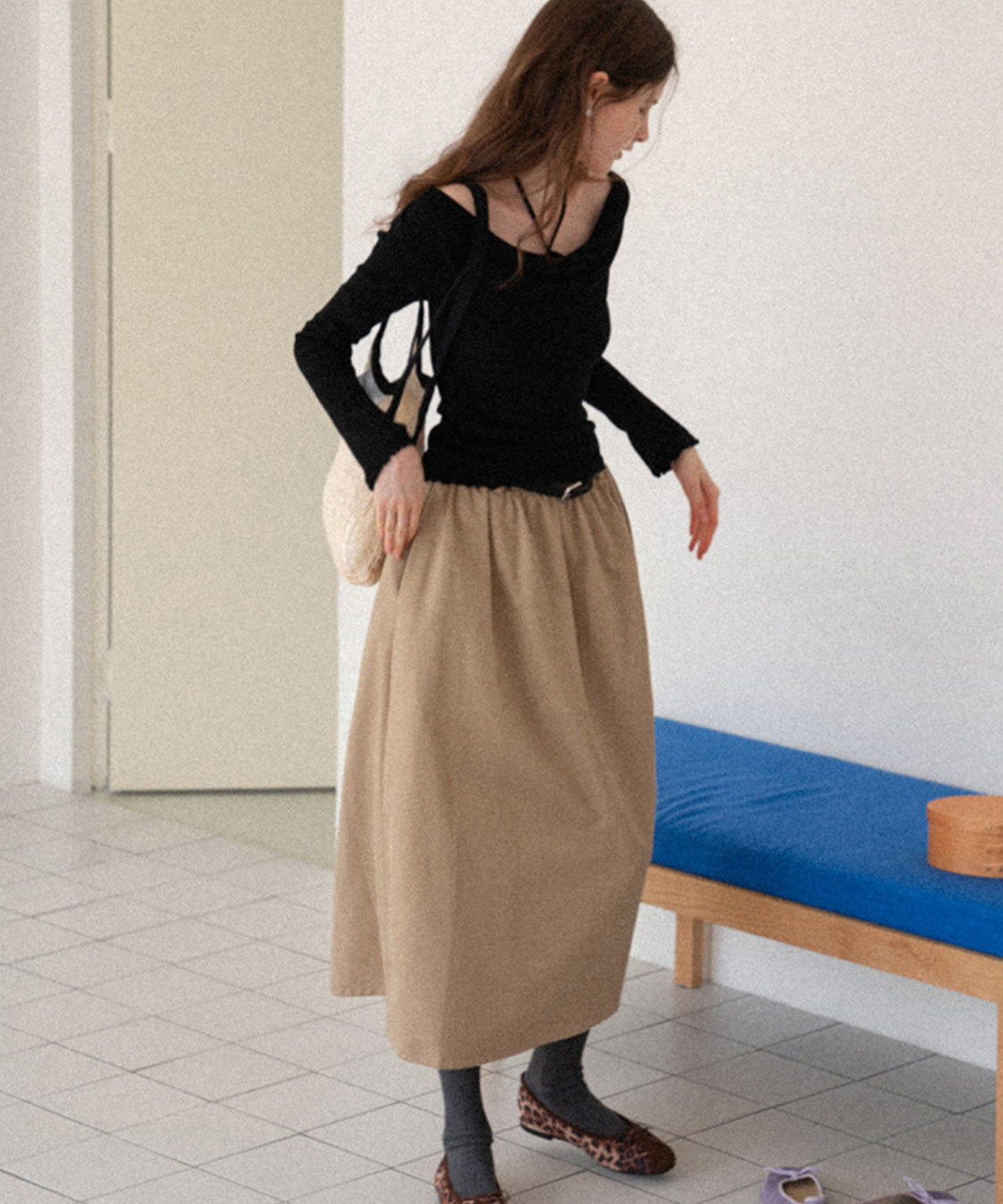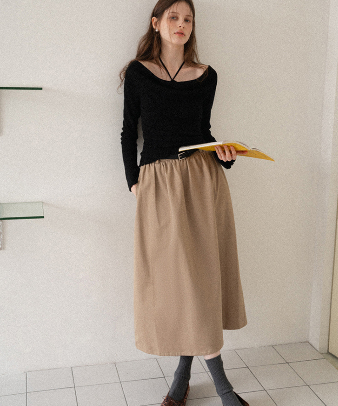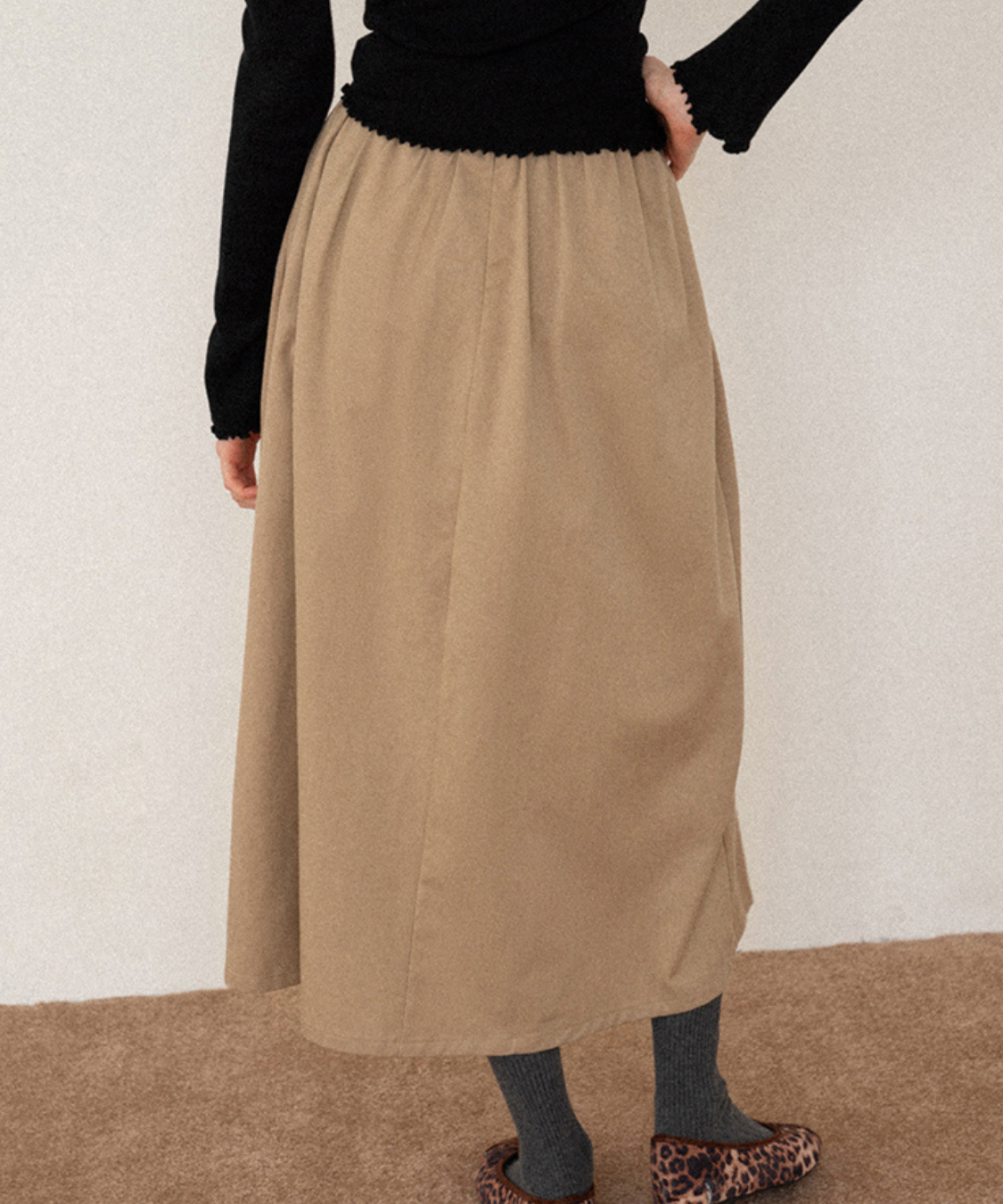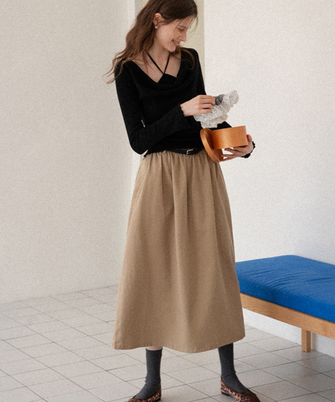 ウエストのギャザーがふんわりシルエットを描くロングスカートです。