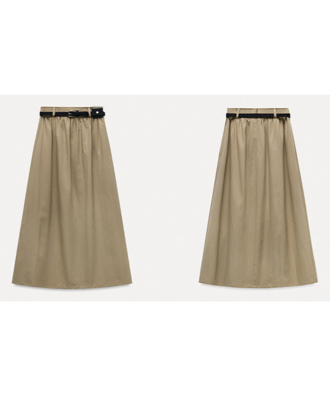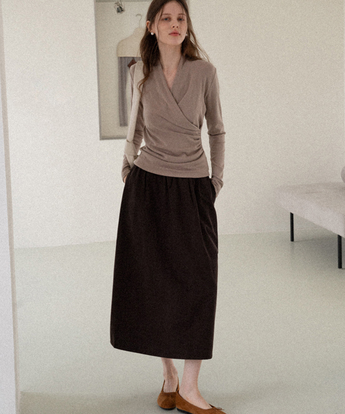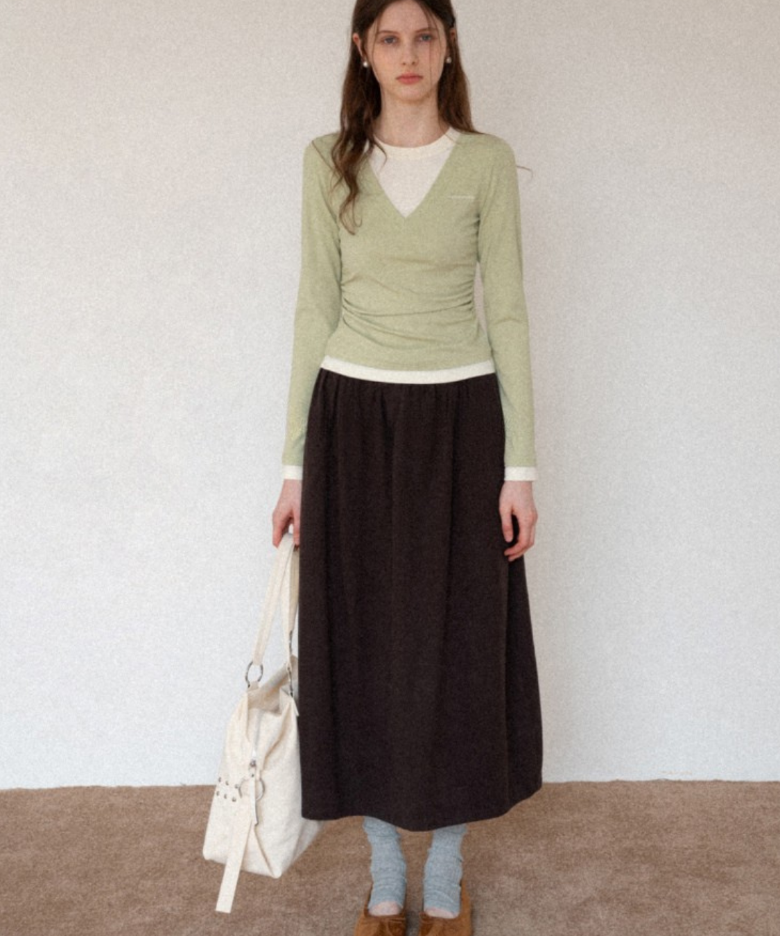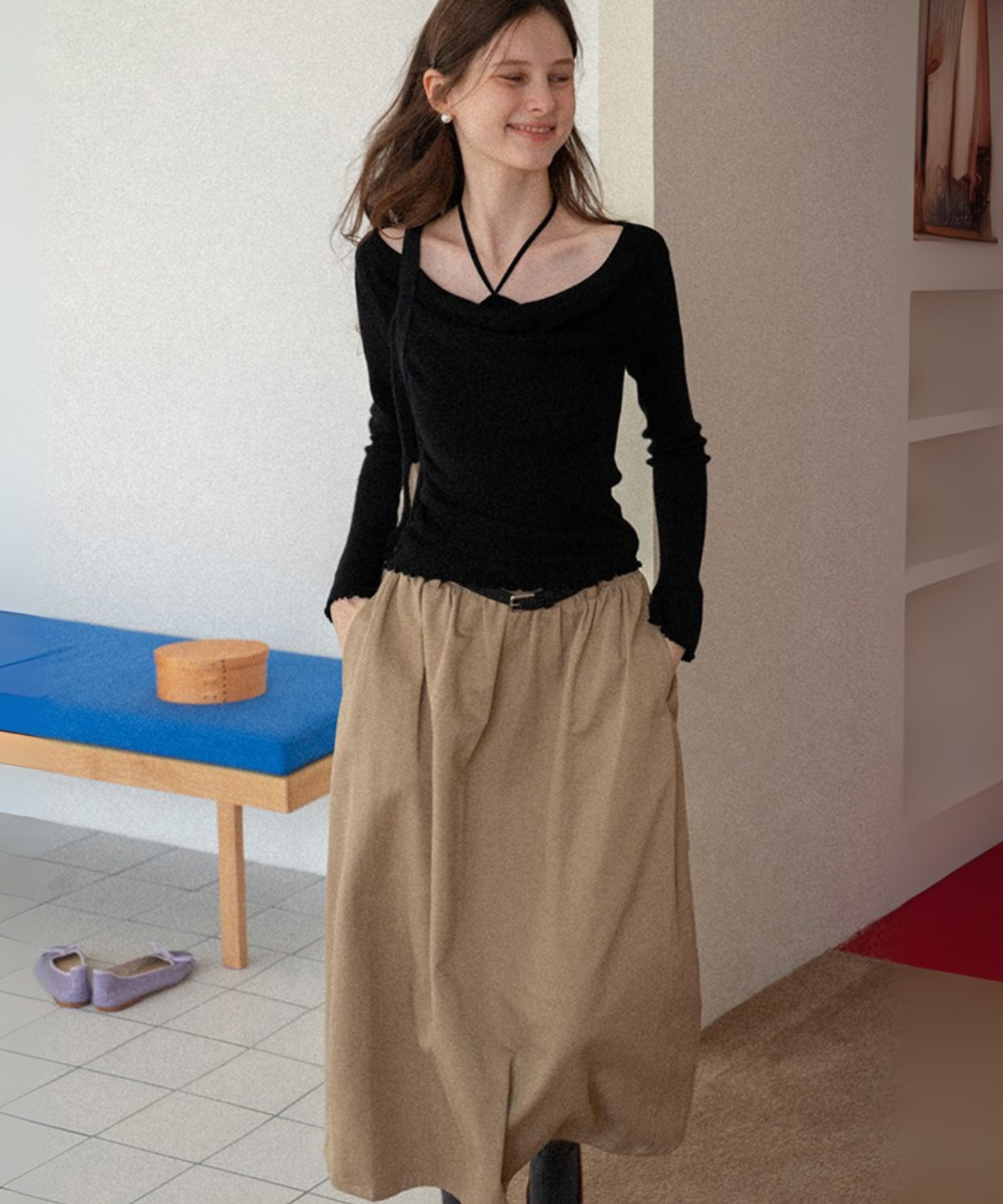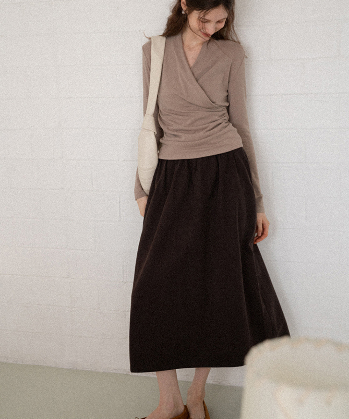 ウエストのギャザーがふんわりシルエットを描くロングスカートです。