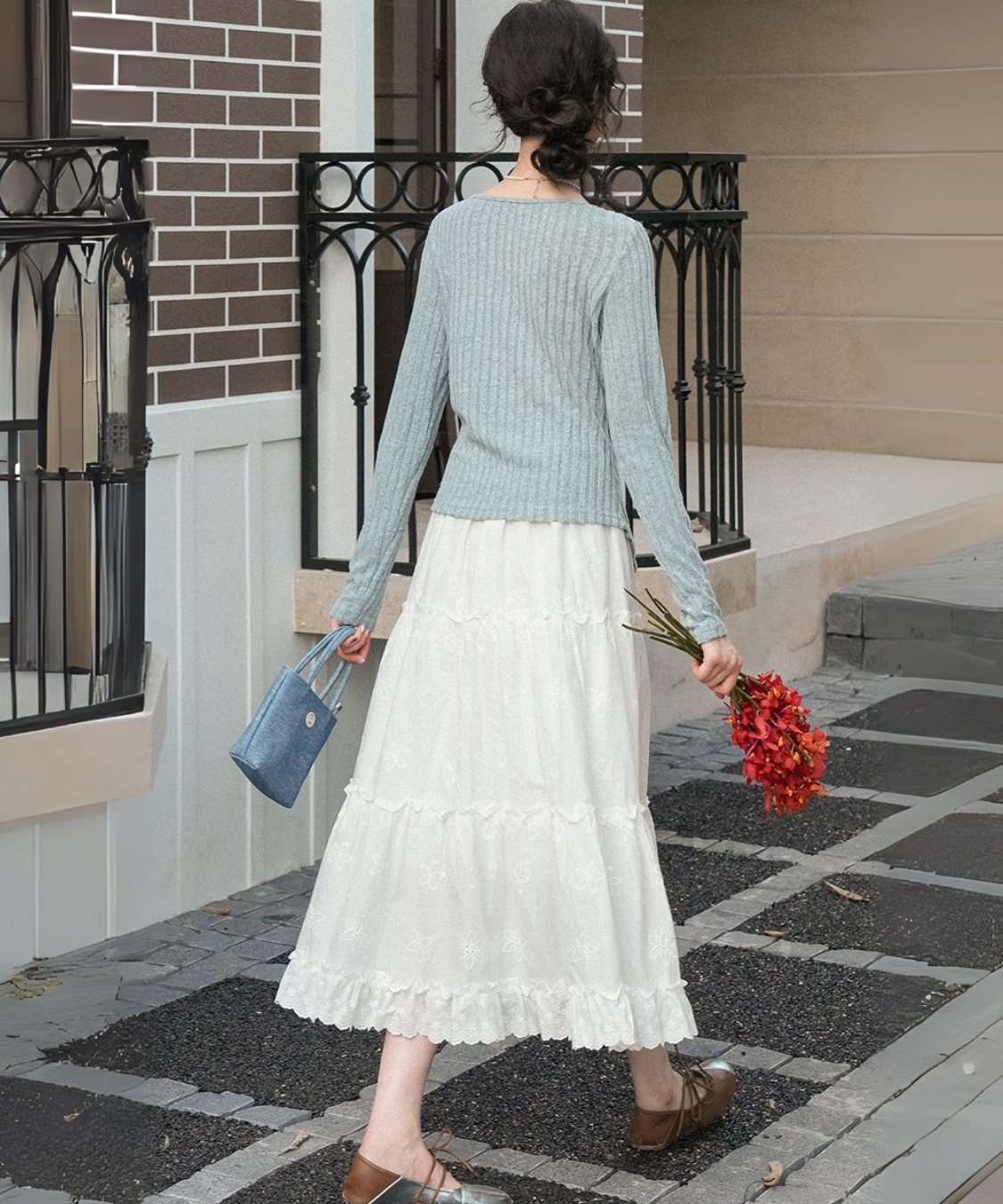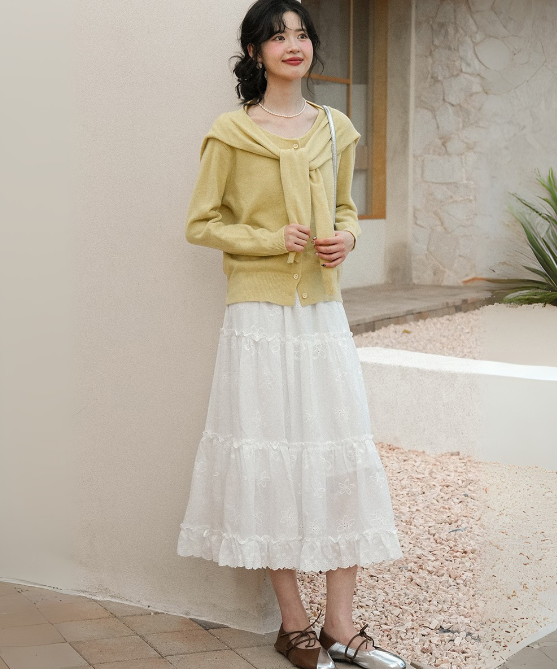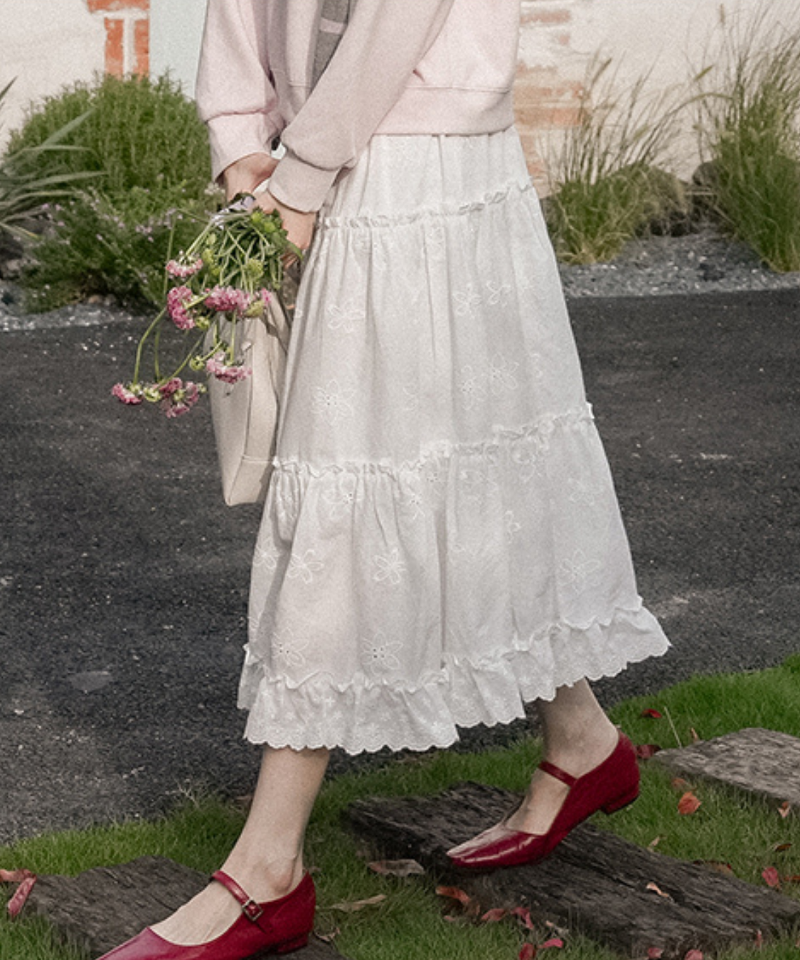 繊細な花柄刺繍が魅力の、可憐なティアードロングスカートです。