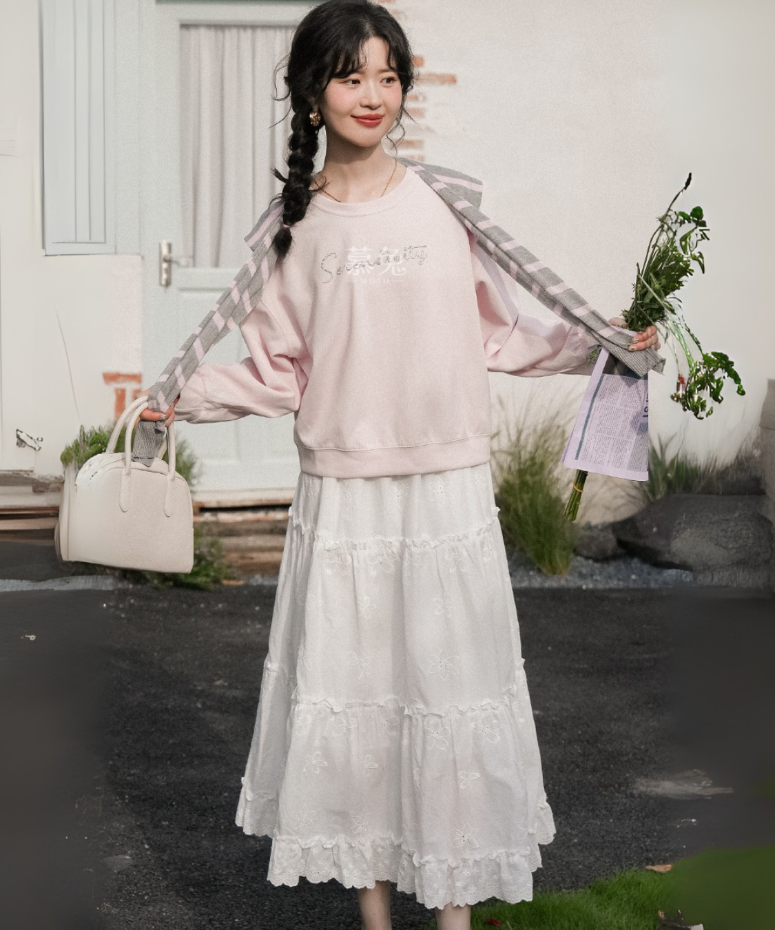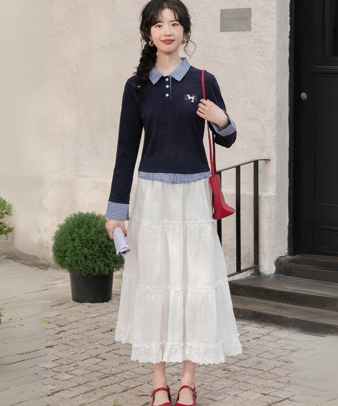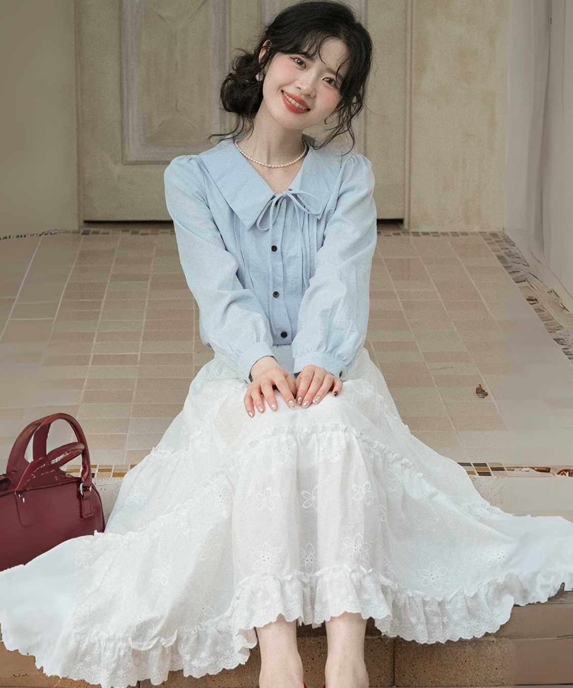 繊細な花柄刺繍が魅力の、可憐なティアードロングスカートです。