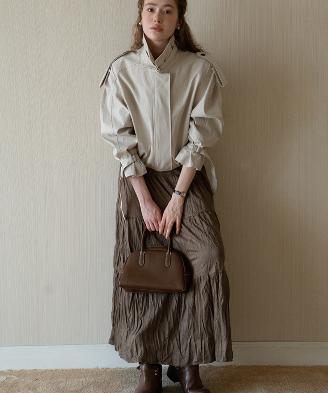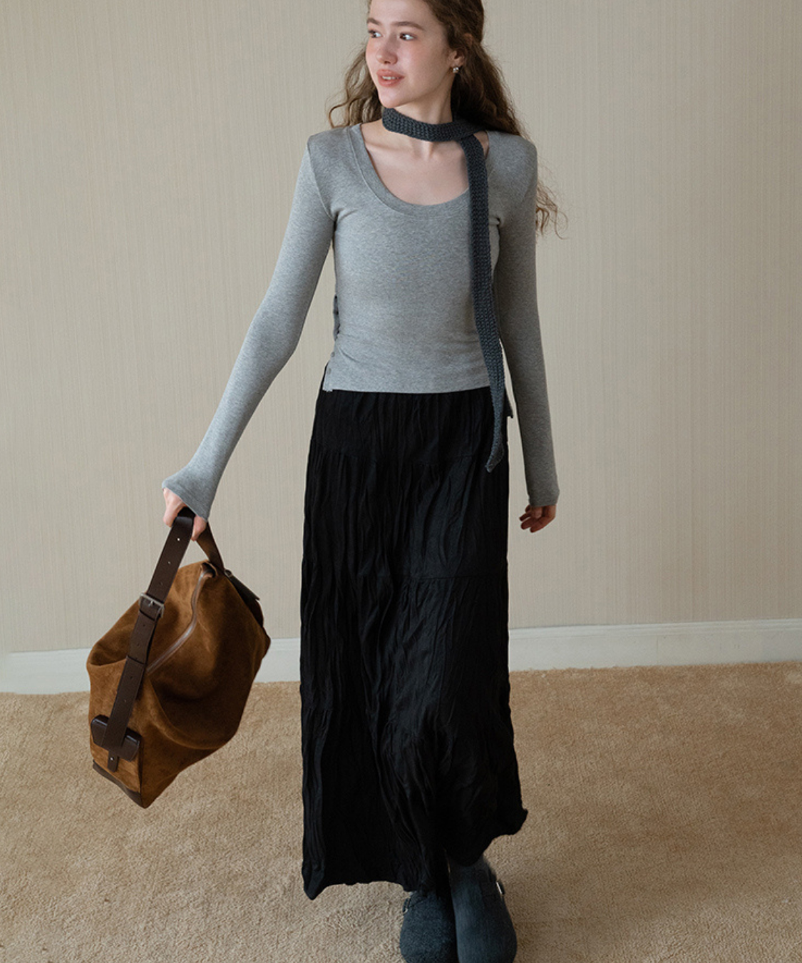 程よいシワ感が魅力のワッシャー素材で仕立てたロングスカートです。