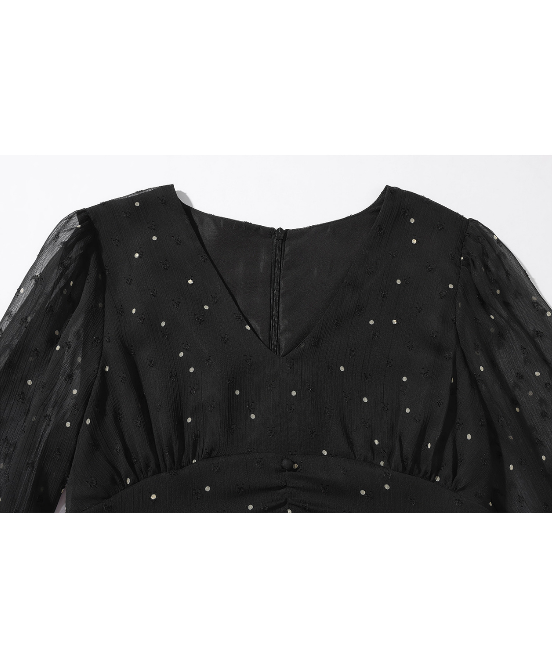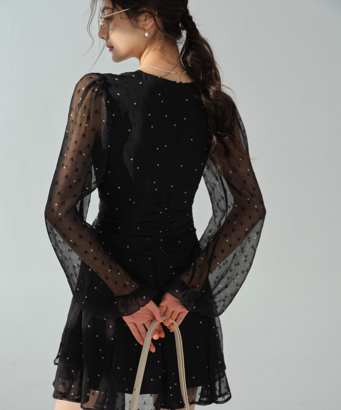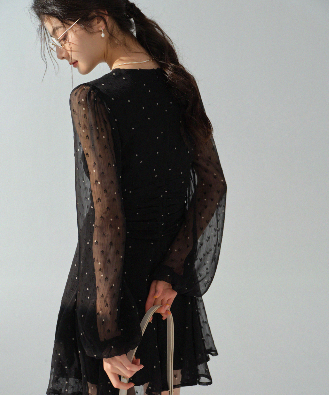 透け感のあるシアー素材にドット柄を散りばめたワンピースです。