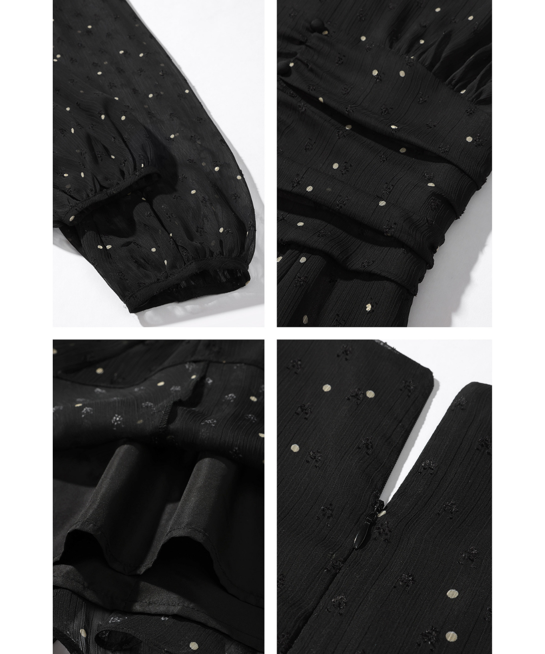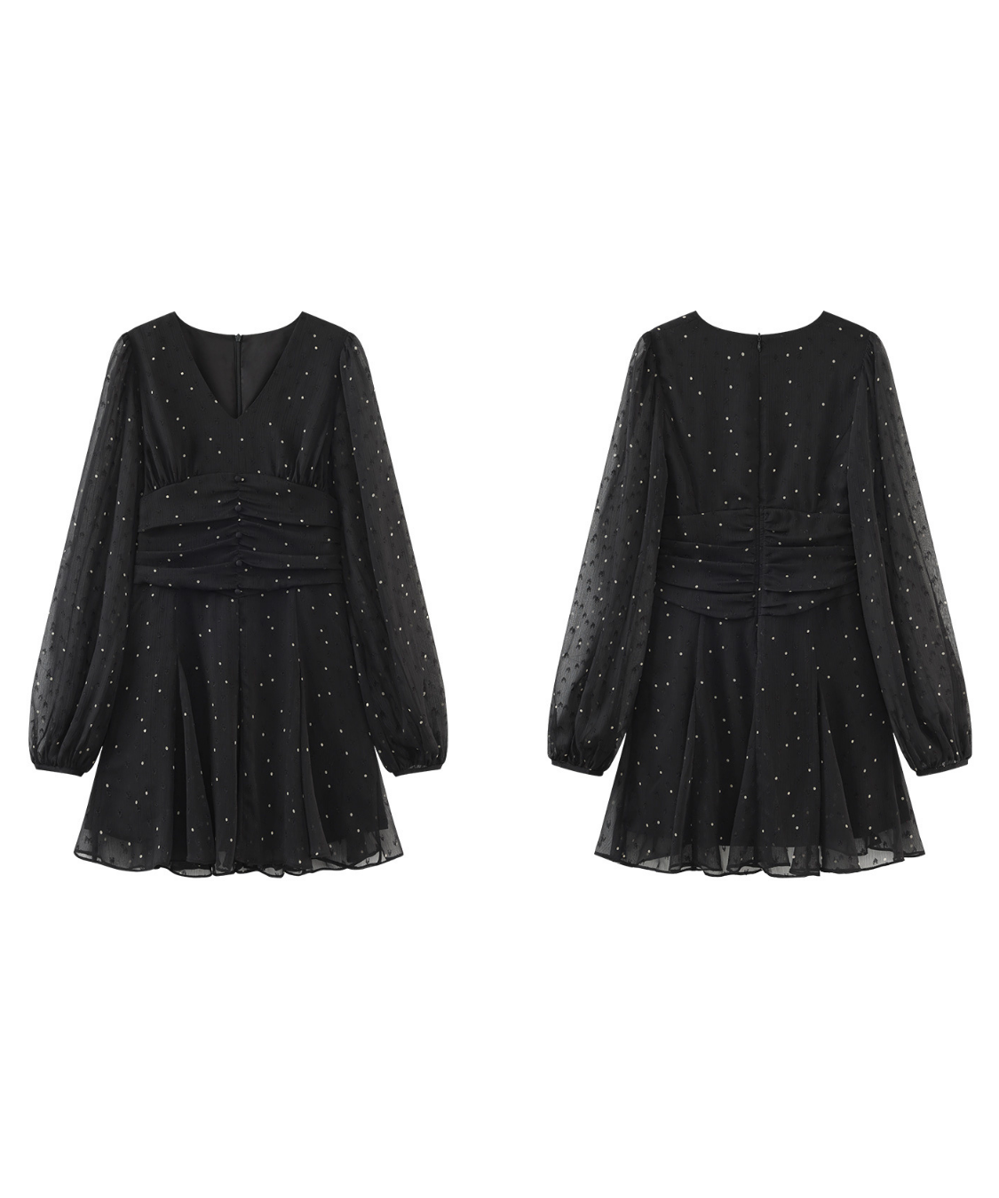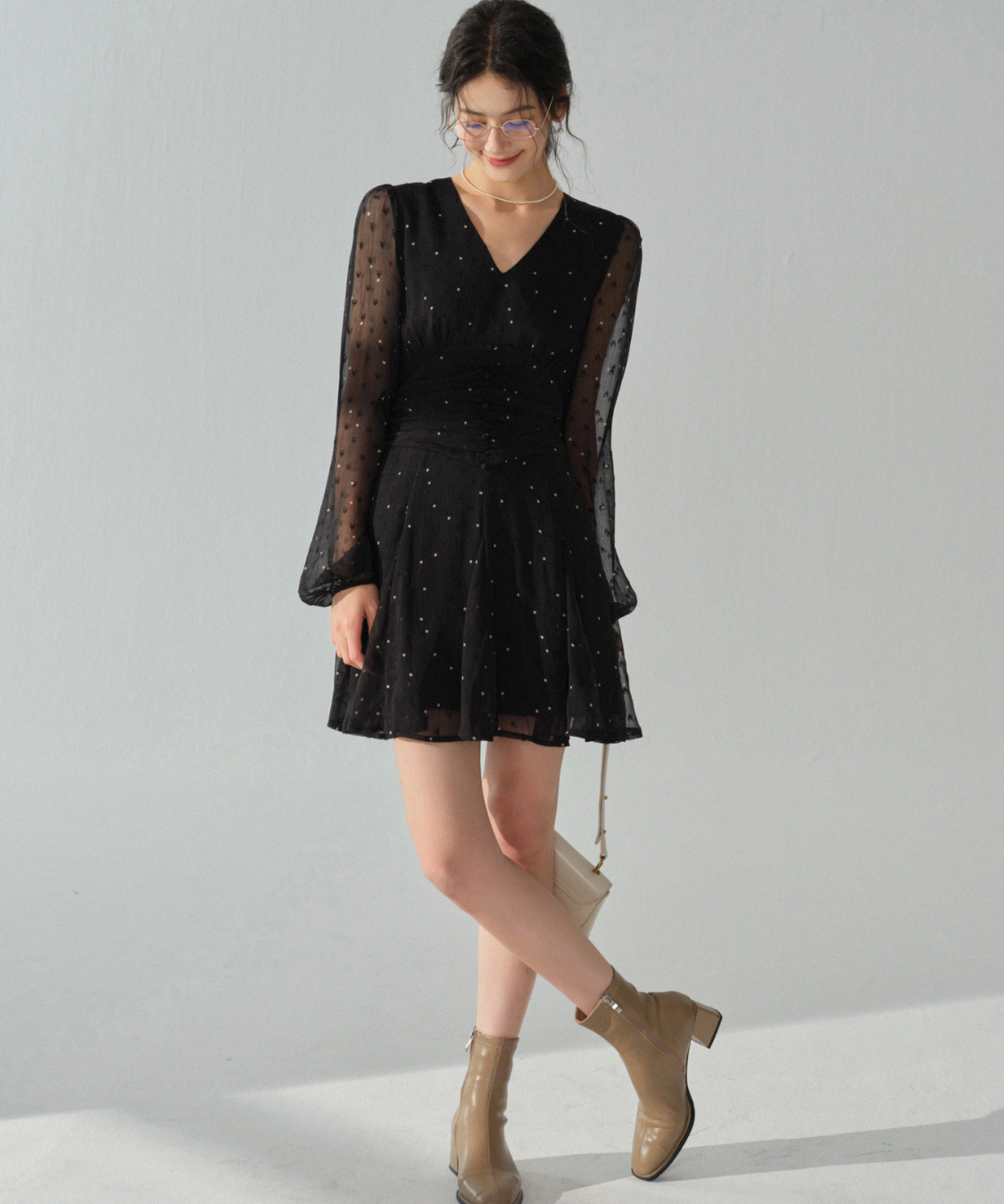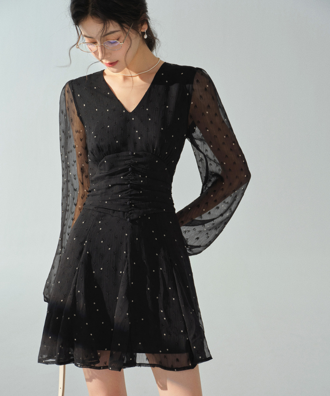 透け感のあるシアー素材にドット柄を散りばめたワンピースです。