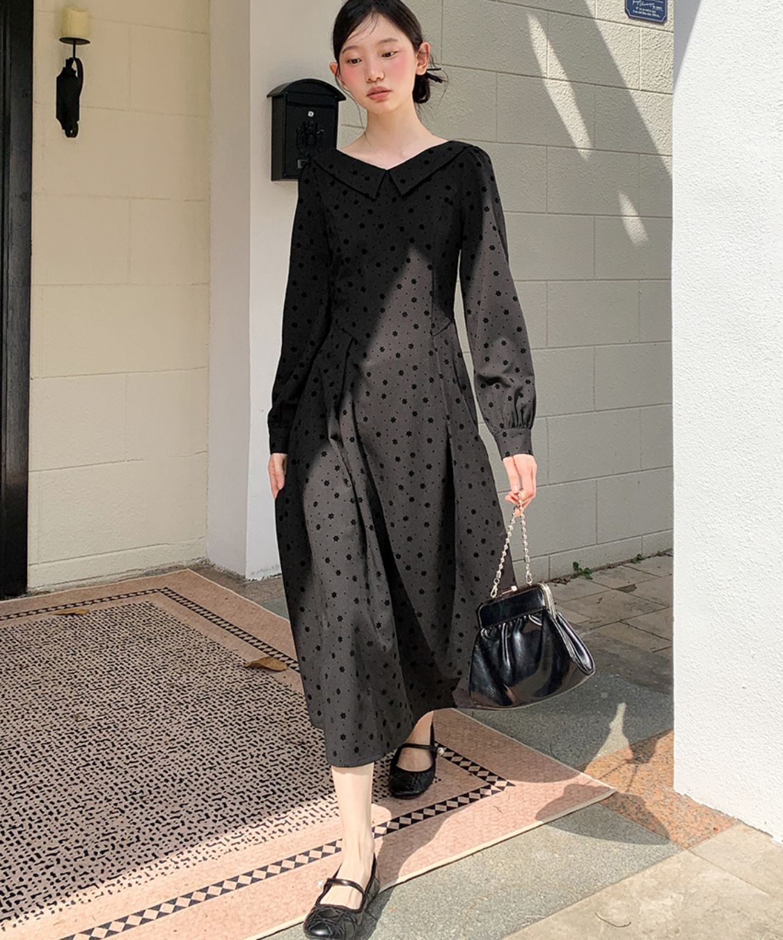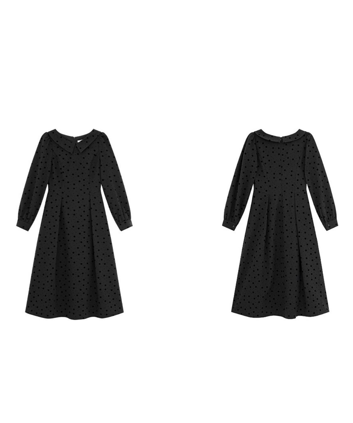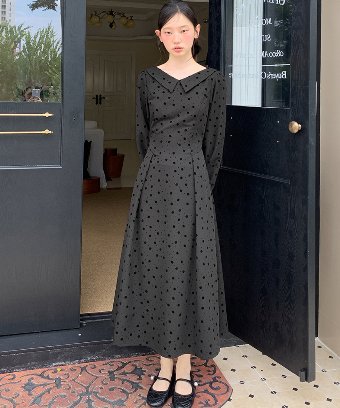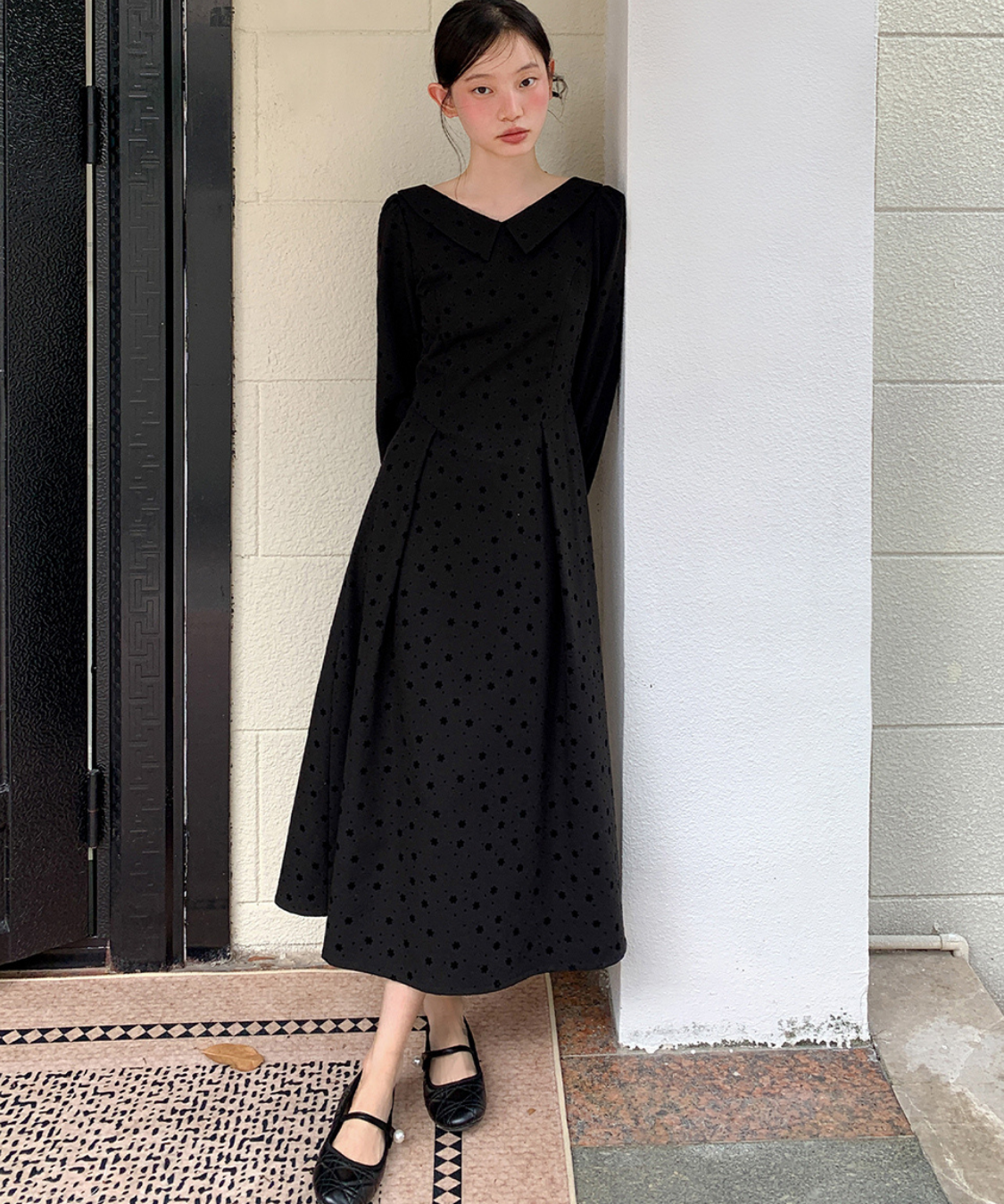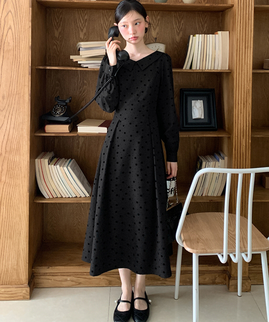 小さなフロッキードットが上品にきらめくロングワンピースです。