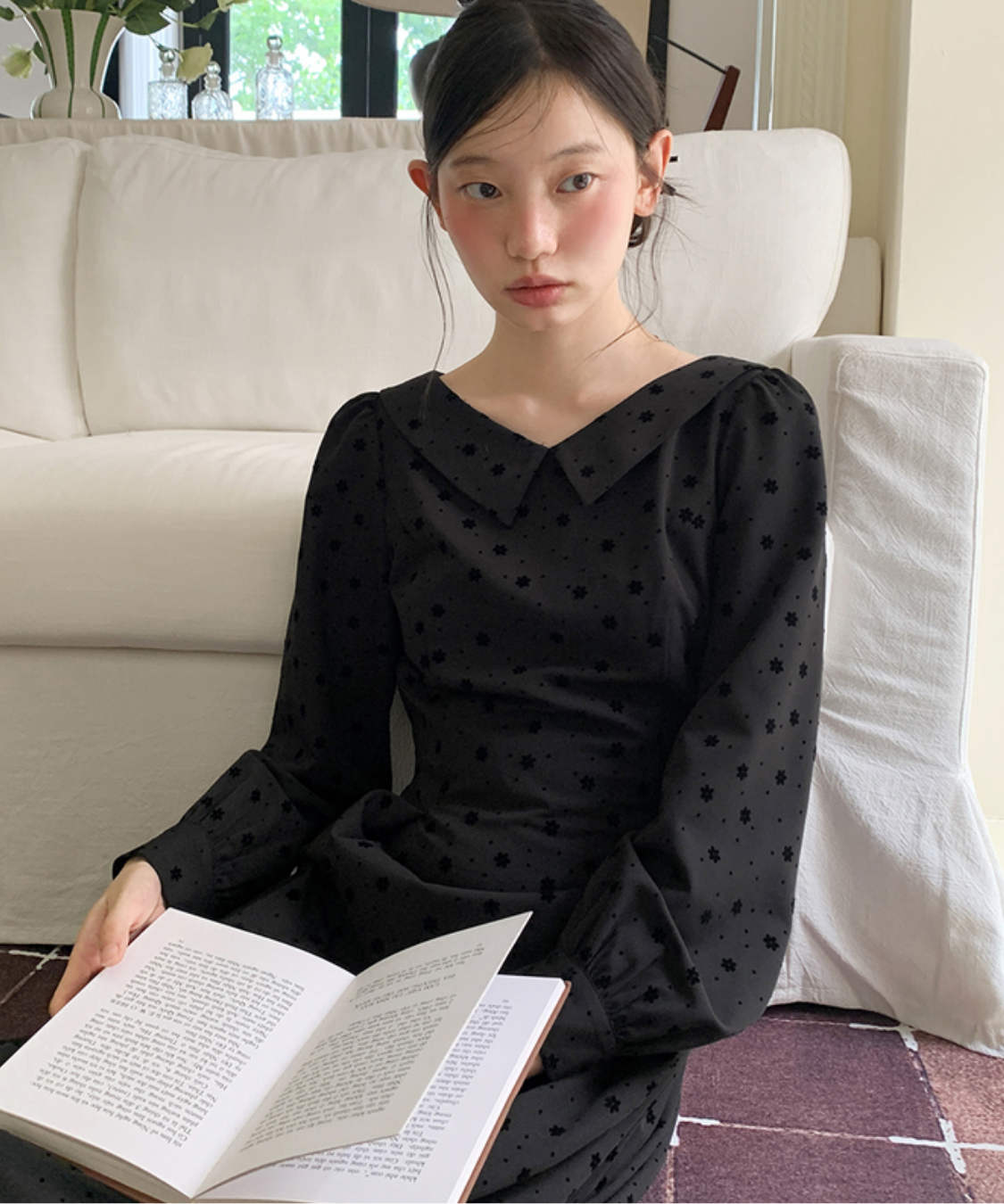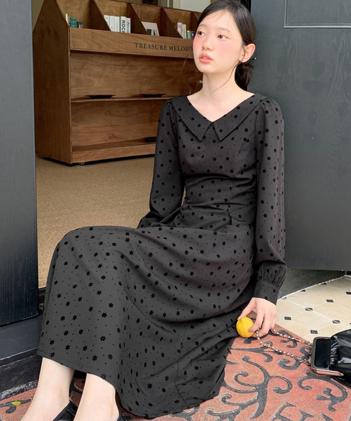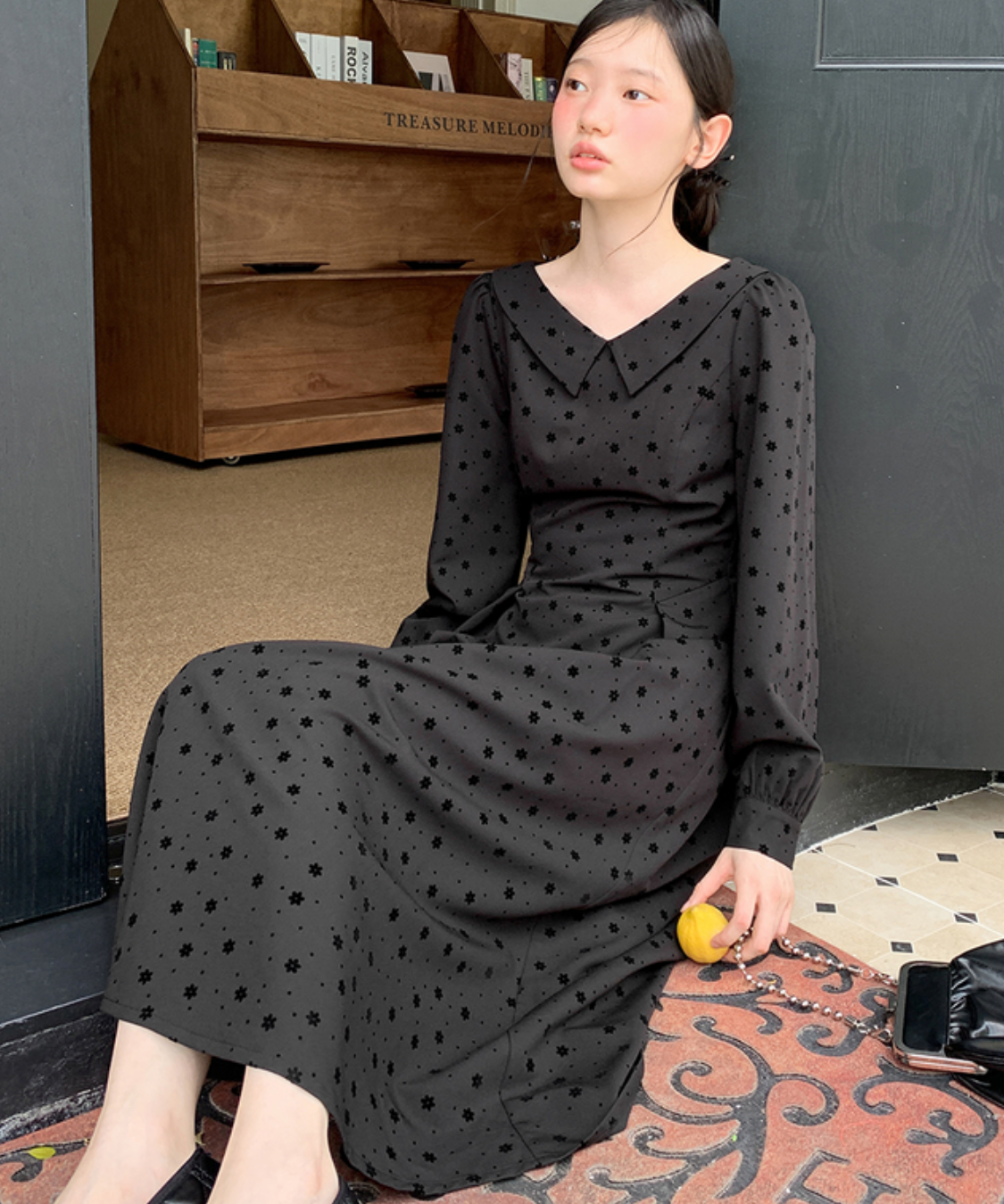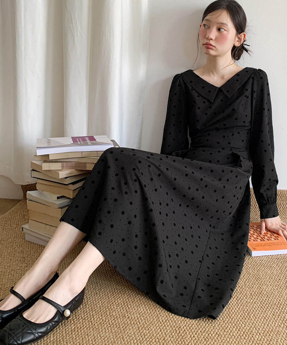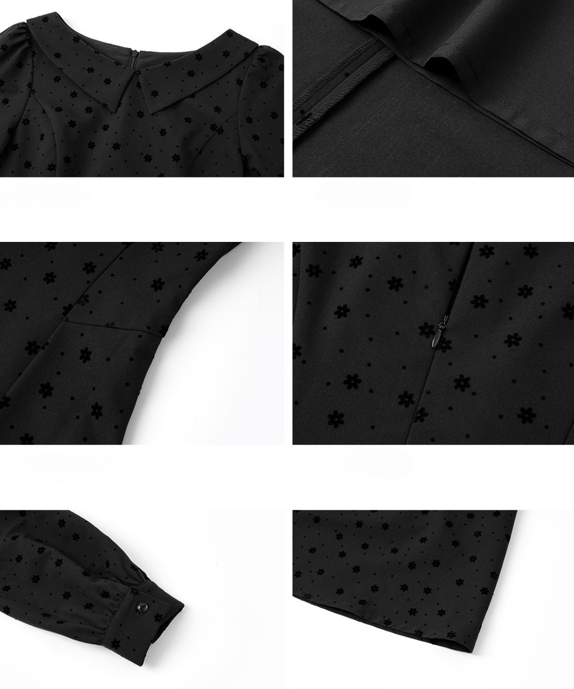 花柄フロッキードットフラットカラーワンピース